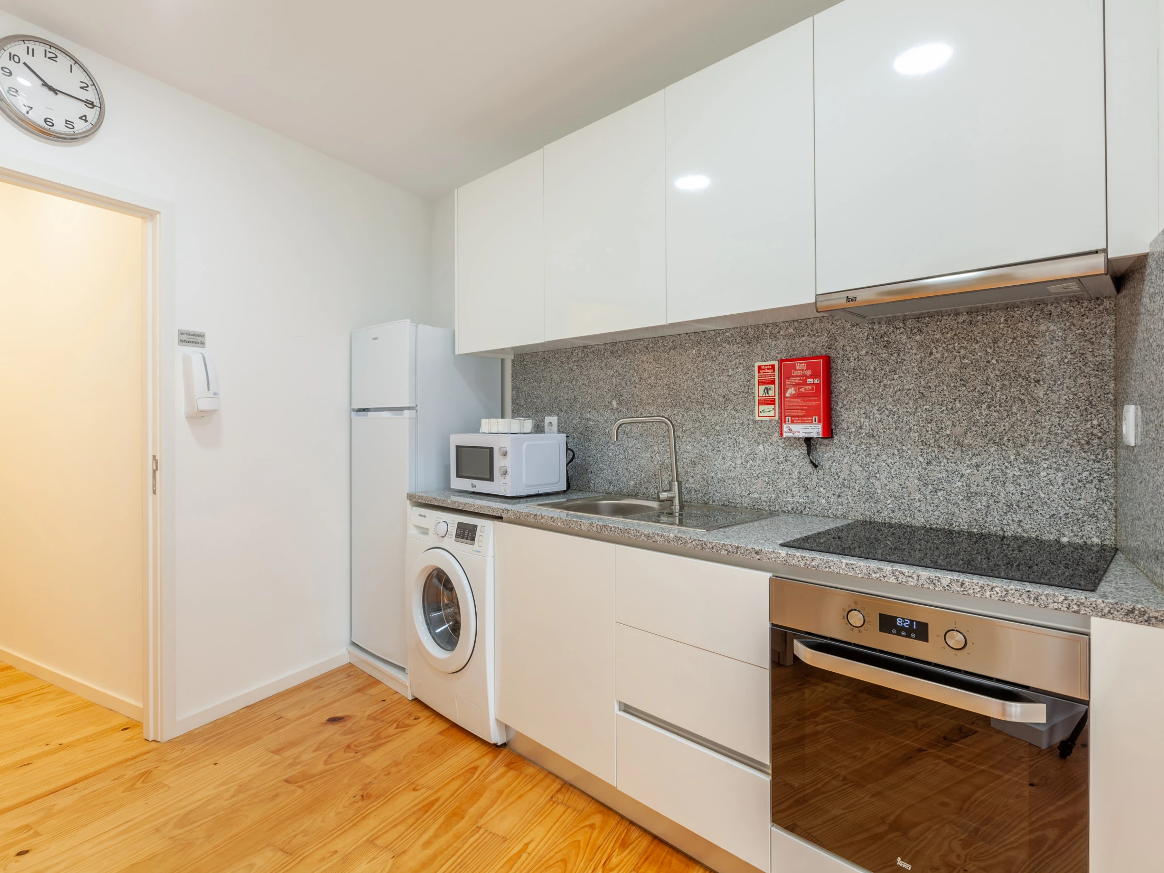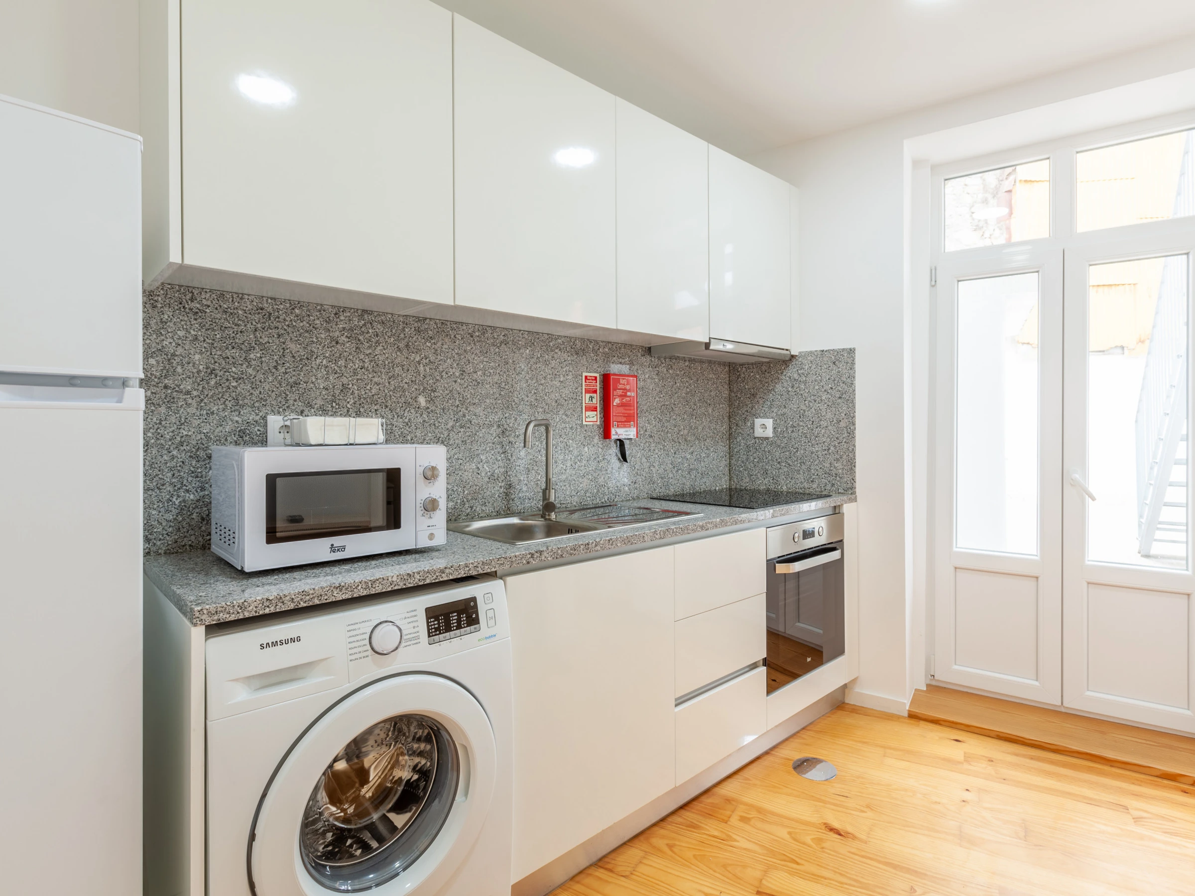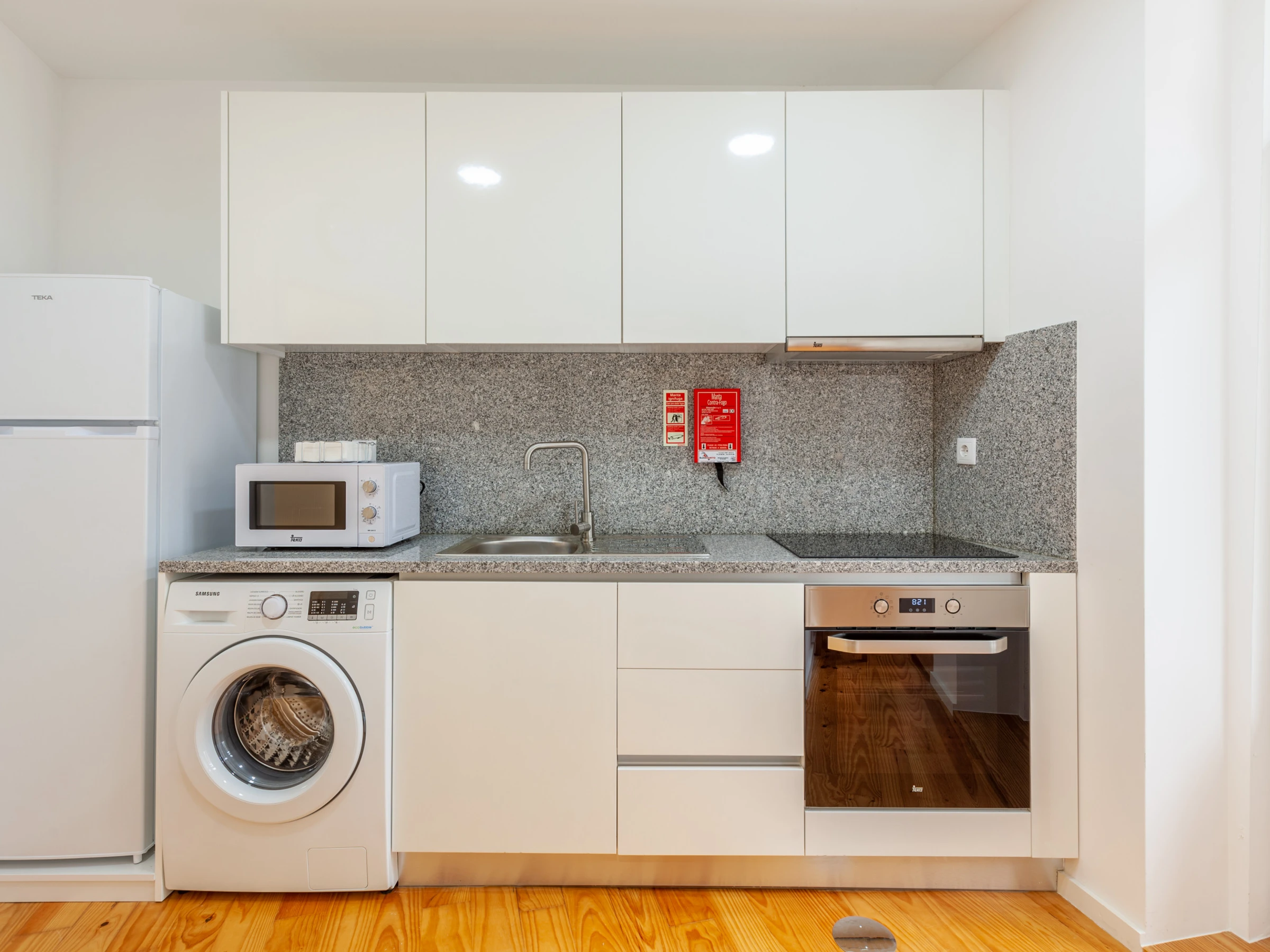 La cocina tiene nevera, vitrocerámica, horno, microondas, tetera y lavadora.