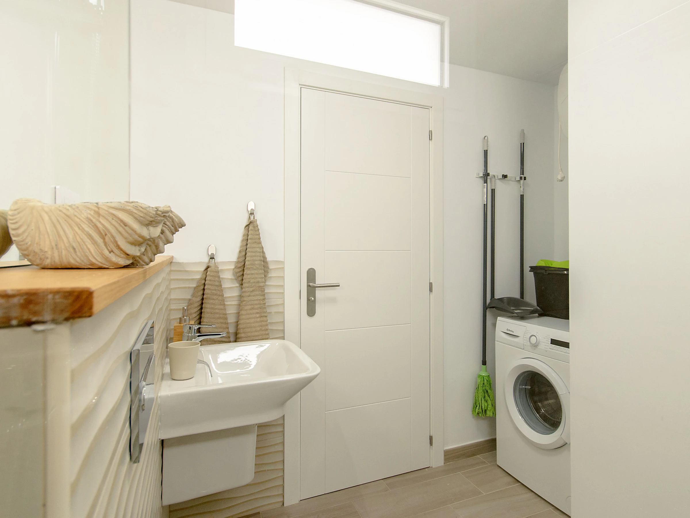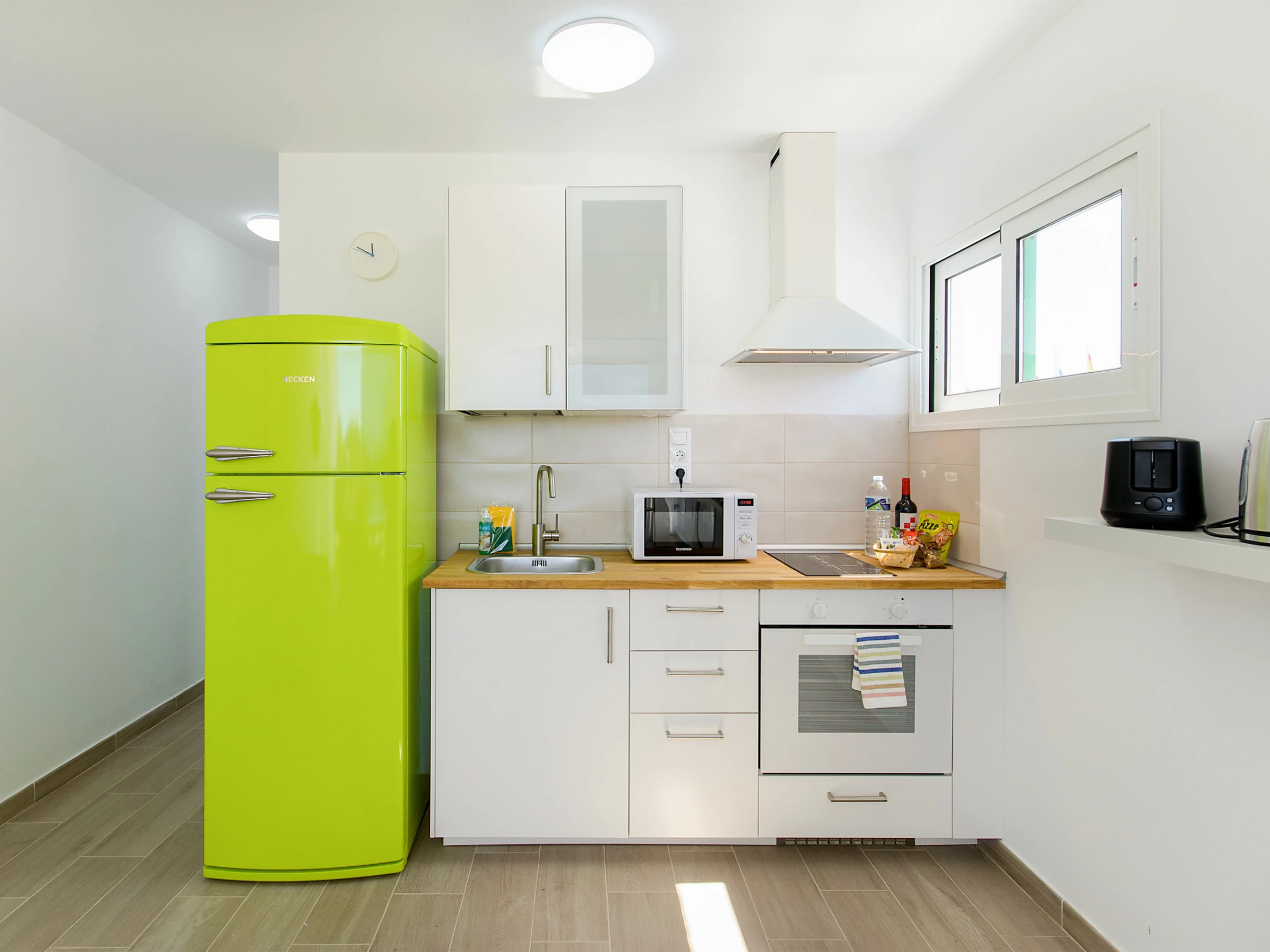 La cocina está completamente equipada con vitrocerámica, horno, microondas, cafetera, tetera, exprimidor eléctrico, nevera y todo el menaje necesario para una estancia sin preocupaciones.