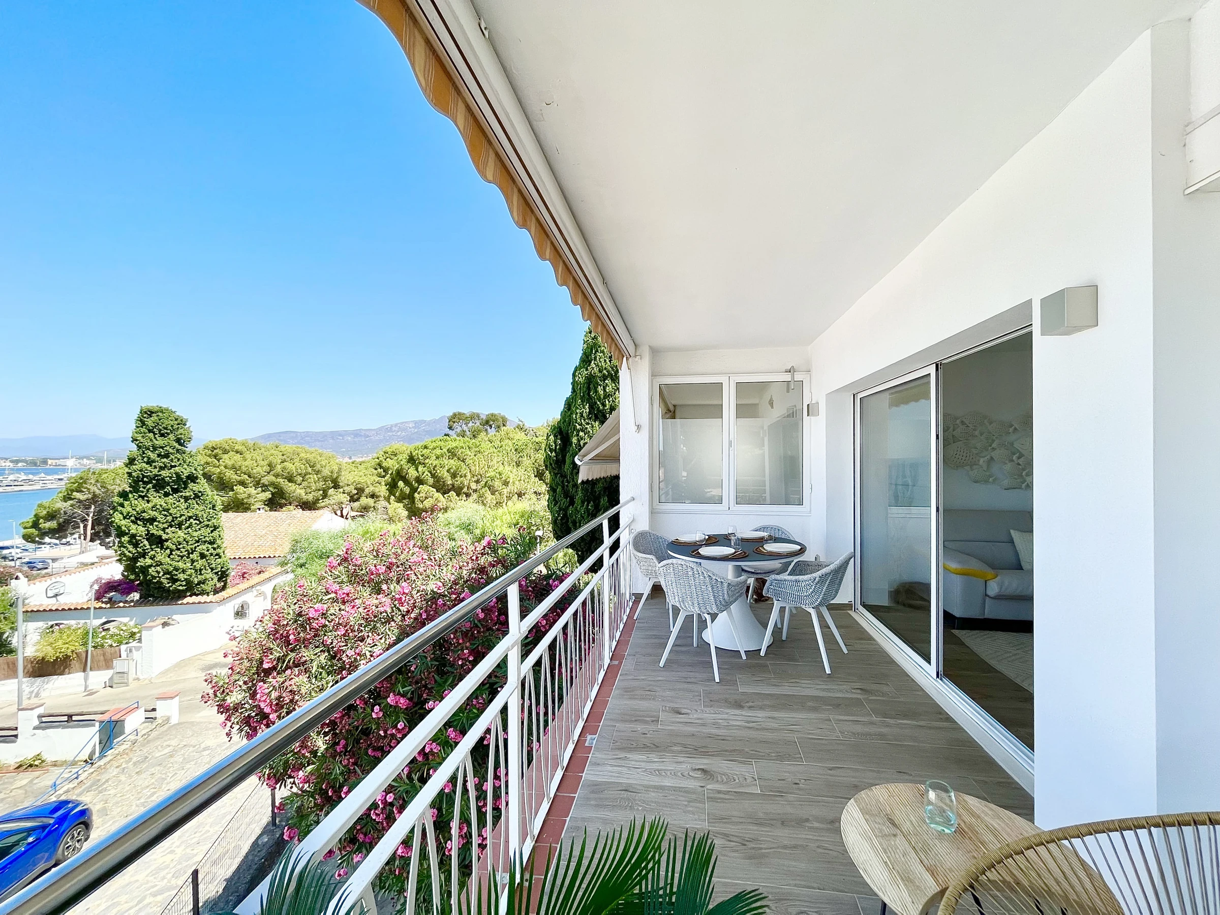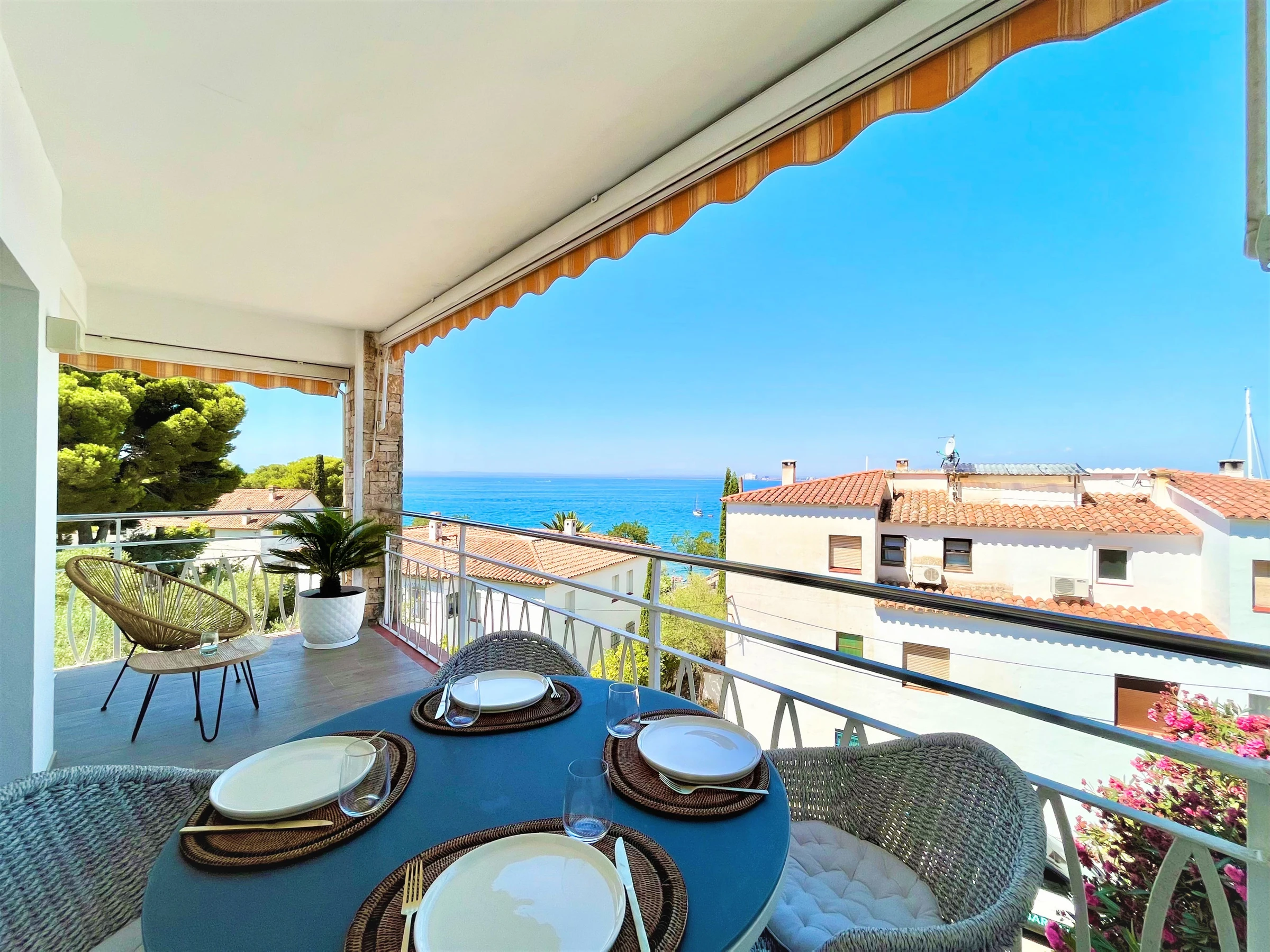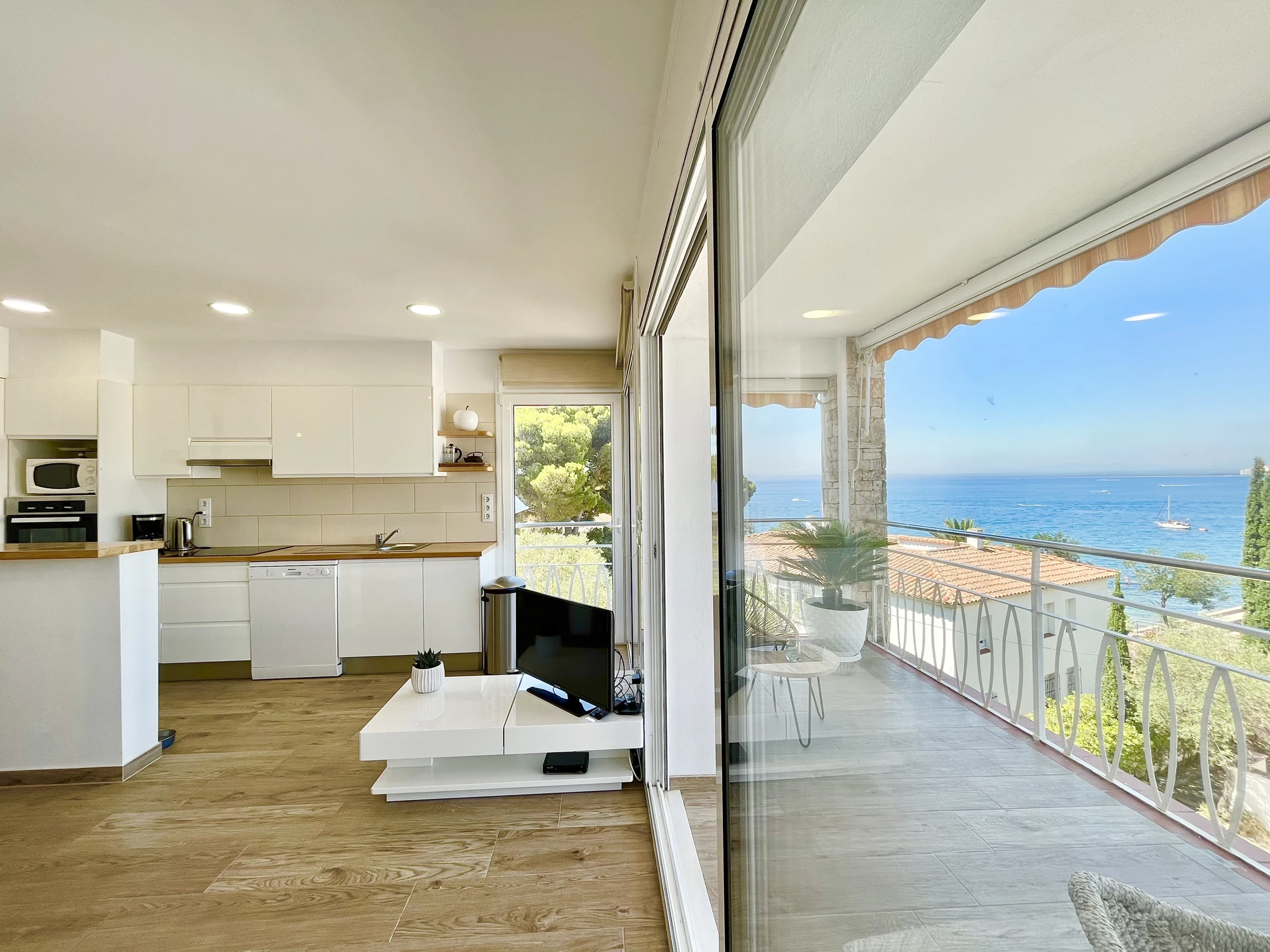 El alojamiento de 56 m² está decorado con un estilo moderno y elegante, con vistas al mar y una amplia terraza de 21 m². Cuenta con aire acondicionado, acceso a internet (wifi) y aparcamiento al aire libre en el mismo edificio para mayor comodidad. La cocina americana está equipada con placa de inducción, nevera, microondas, horno, congelador, lavadora, cafetera, tostadora y utensilios de cocina.