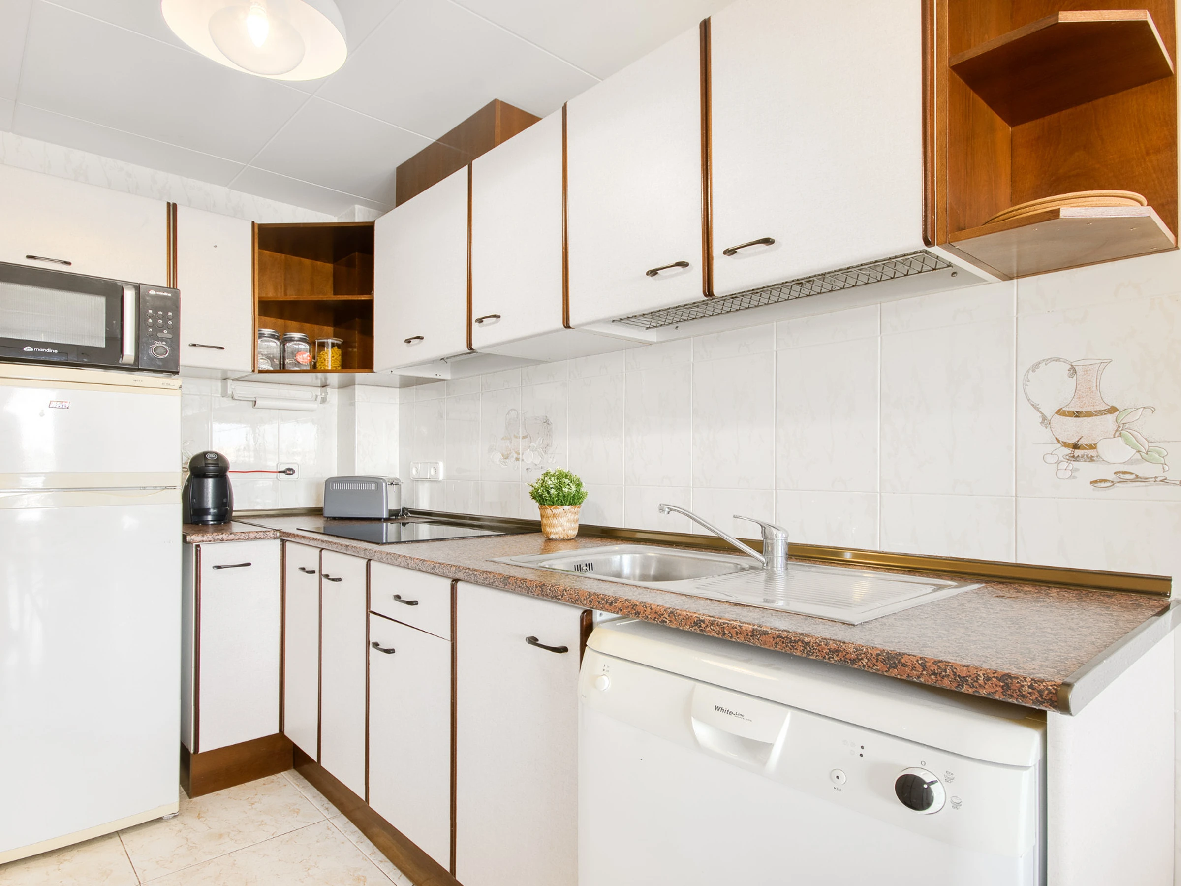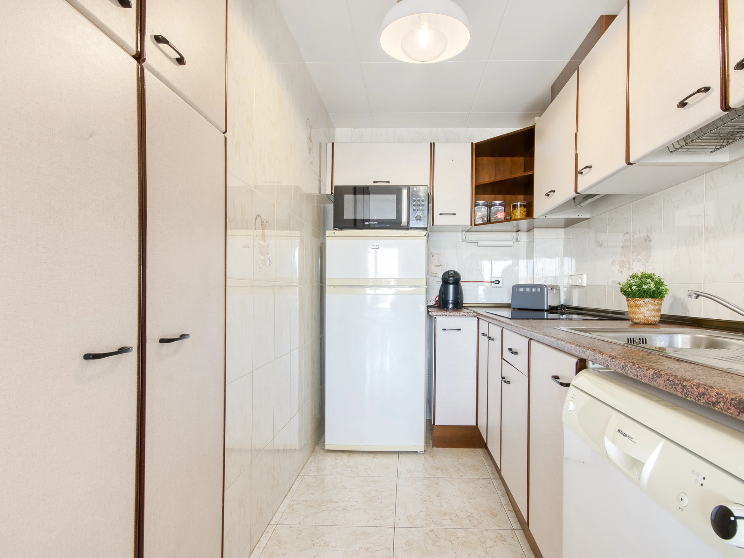 La cocina está completamente equipada con nevera, congelador, microondas, cafetera y utensilios básicos, permitiendo preparar y disfrutar de comidas en el propio alojamiento.