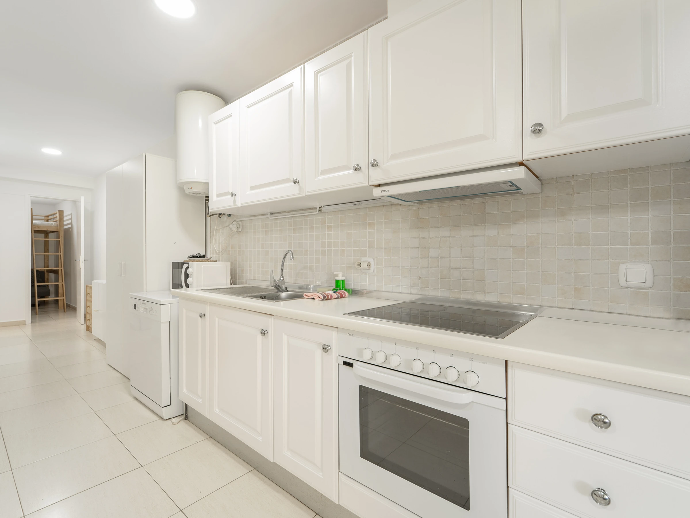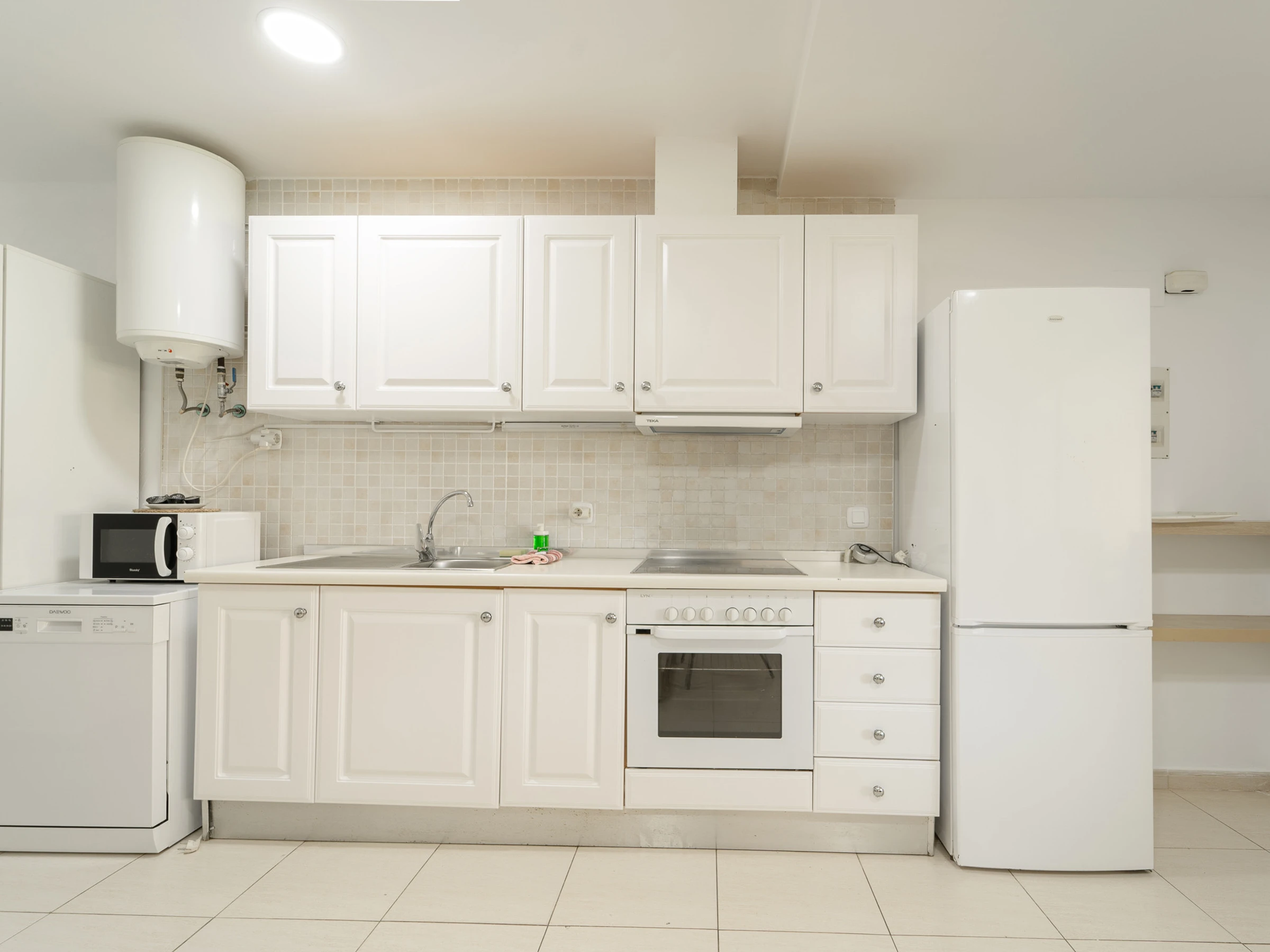 Cocina totalmente equipada con nevera, congelador, horno, microondas, vitrocerámica, hervidor, cafetera y tostadora