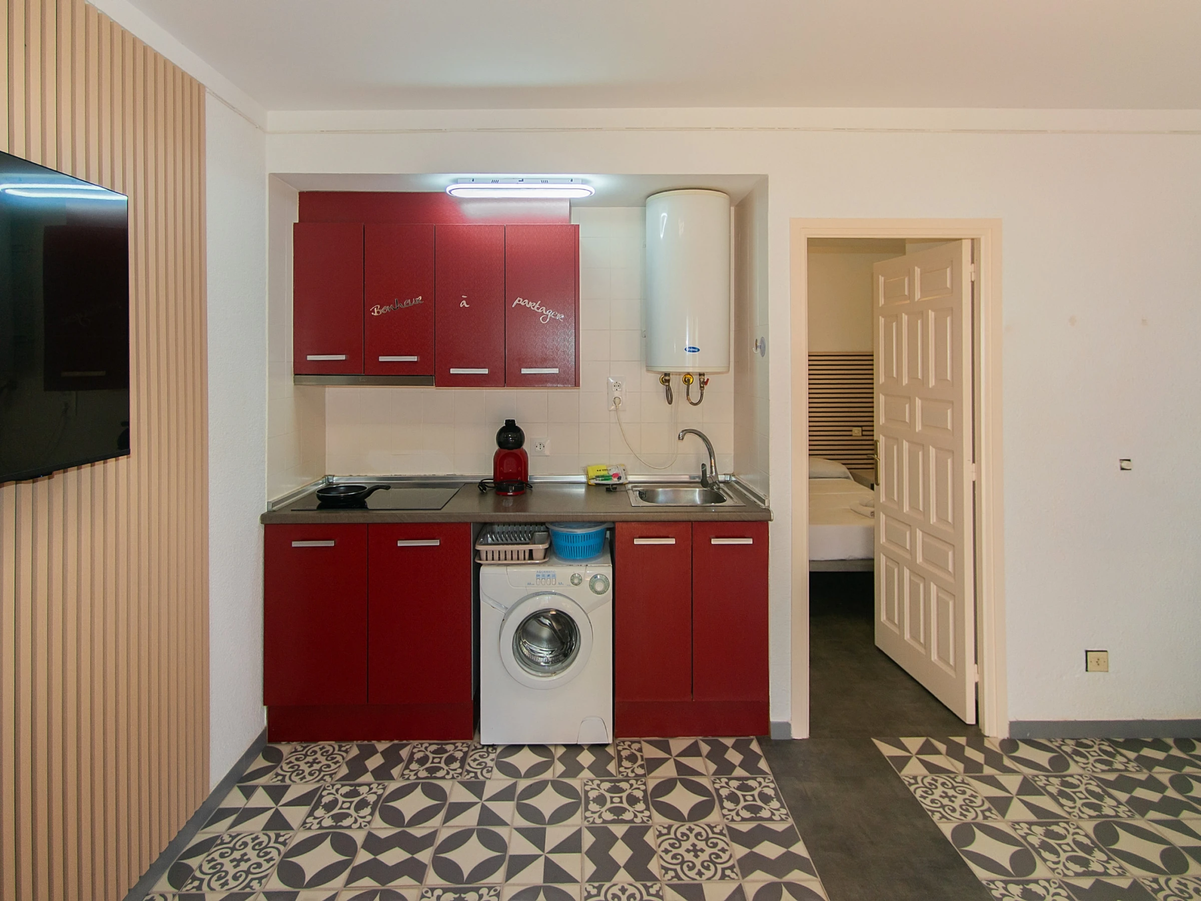 La sala de estar del apartamento le recibe con una luz suave y el calor del hogar. Aquí se encuentra un cómodo sofá de dos plazas que durante el día sirve como lugar de descanso y por la noche se convierte en un acogedor nido para ver películas favoritas en la televisión. Junto a él hay una cocina completamente equipada, donde se pueden preparar deliciosos platos, disfrutando del proceso culinario.