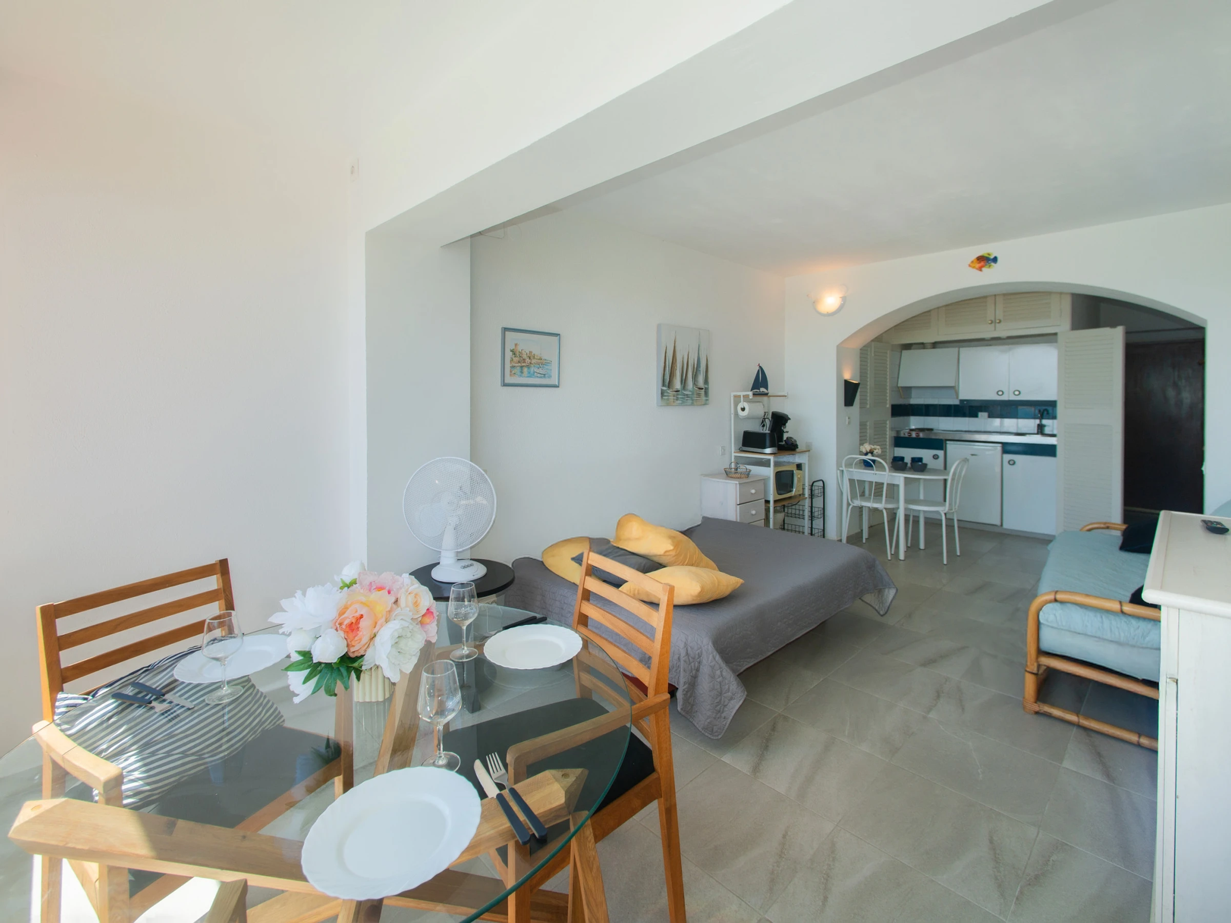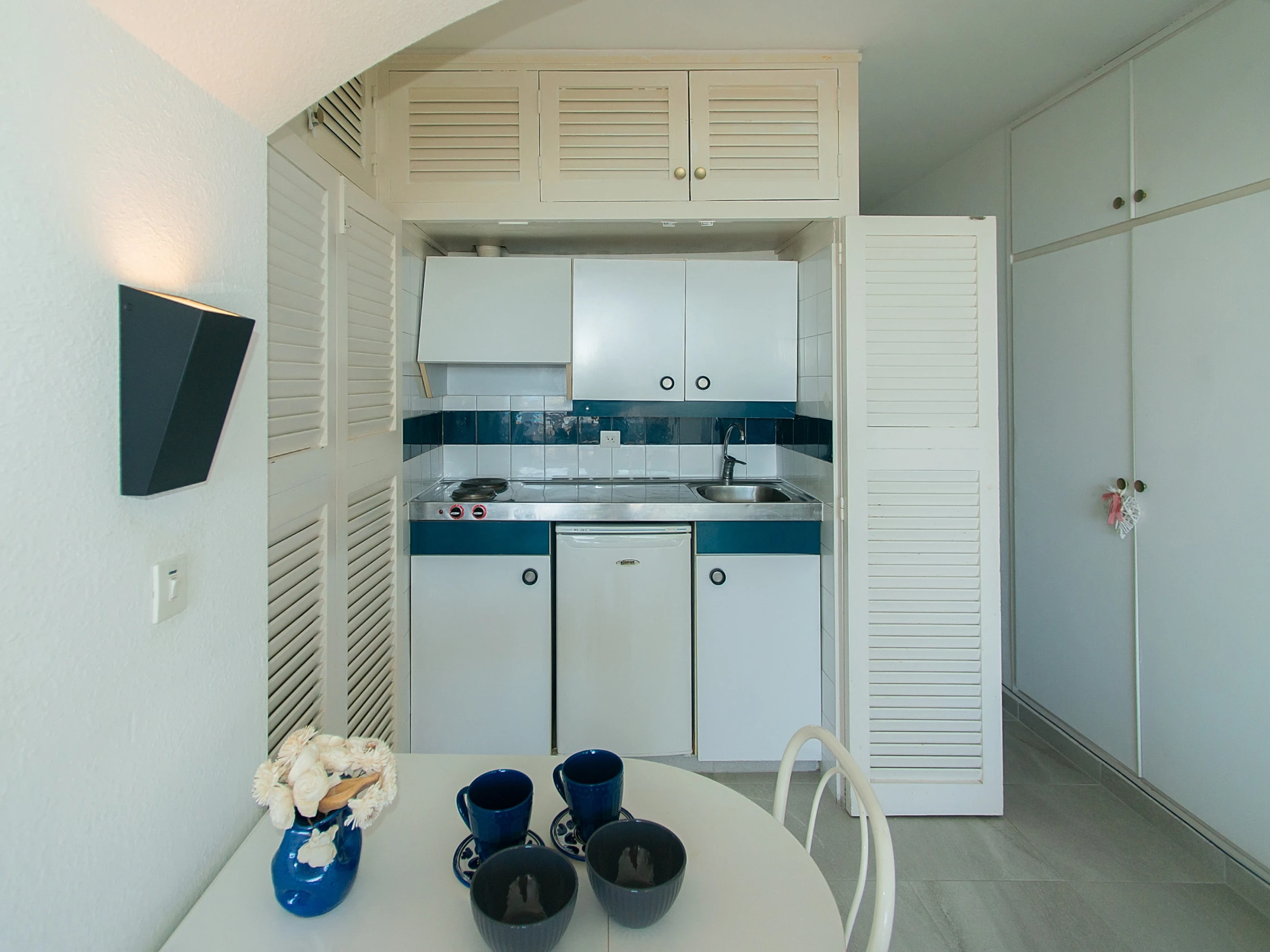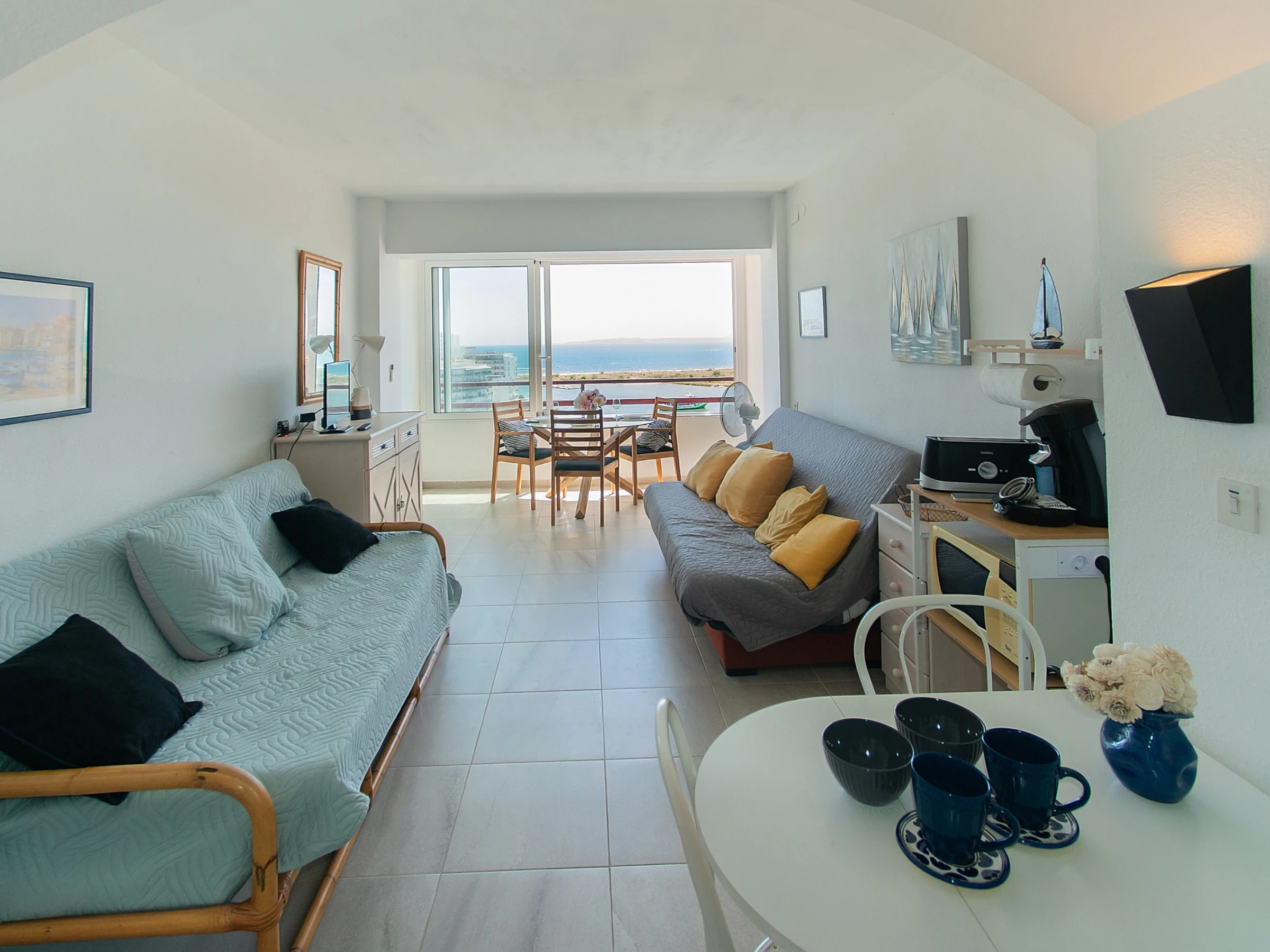 El estudio está equipado con todo lo necesario para una estancia cómoda: un sofá de dos plazas, un sofá de una plaza, televisión y zona de comedor. Aquí se puede relajar después de un día lleno de experiencias o reunirse para cenar con los seres queridos. La zona de cocina está completamente equipada, lo que permite cocinar los platos favoritos disfrutando de la vista al mar.