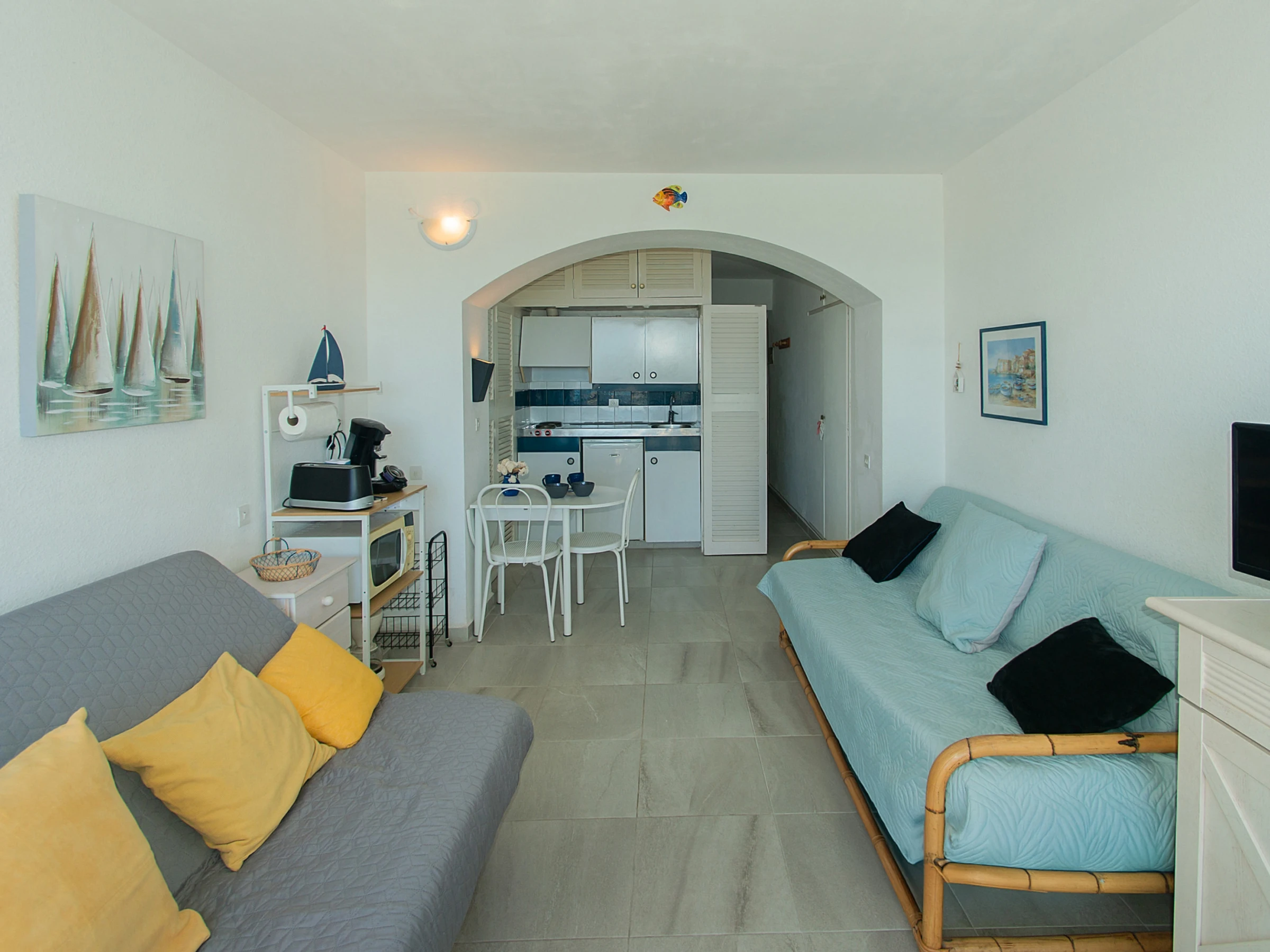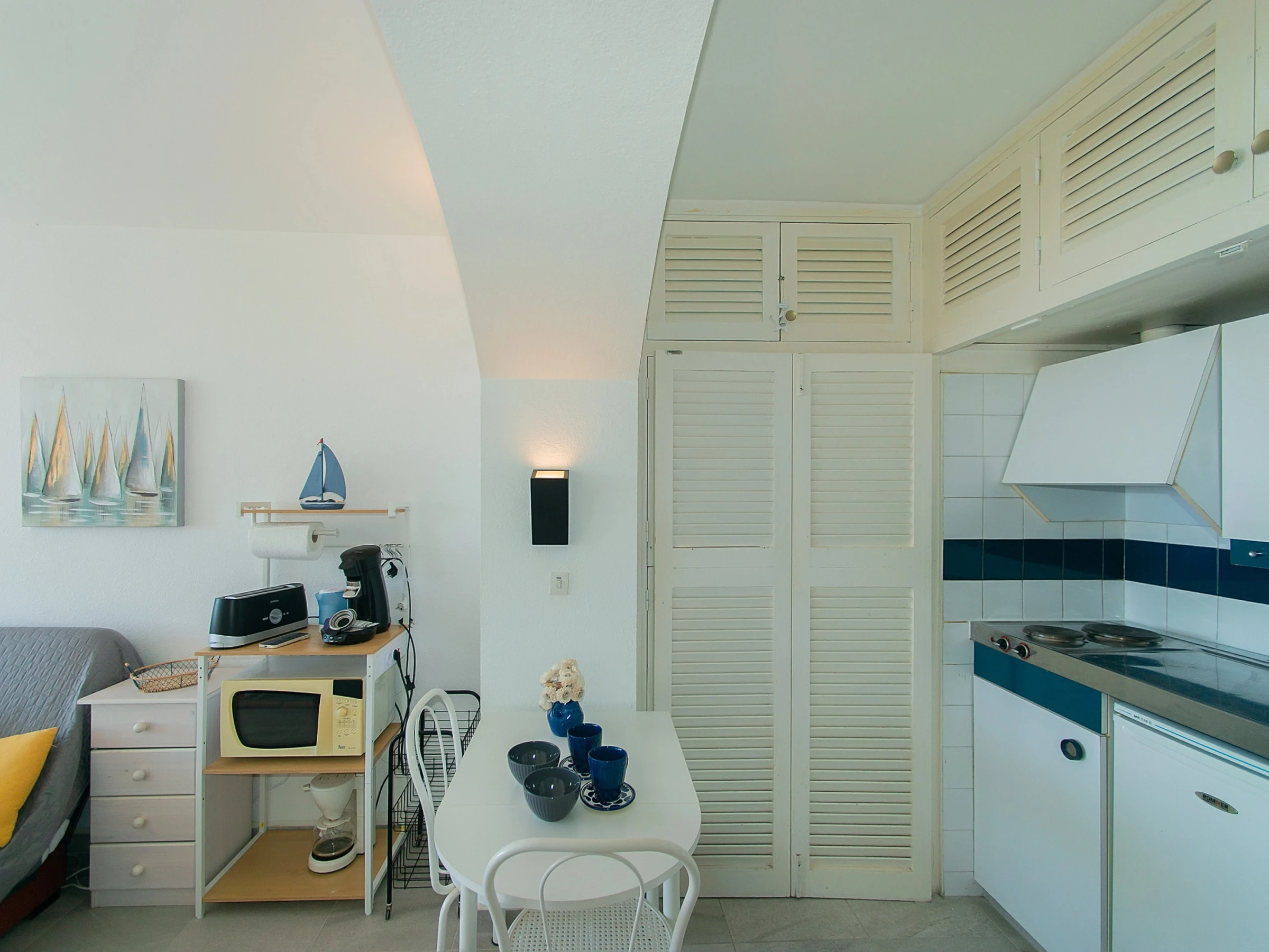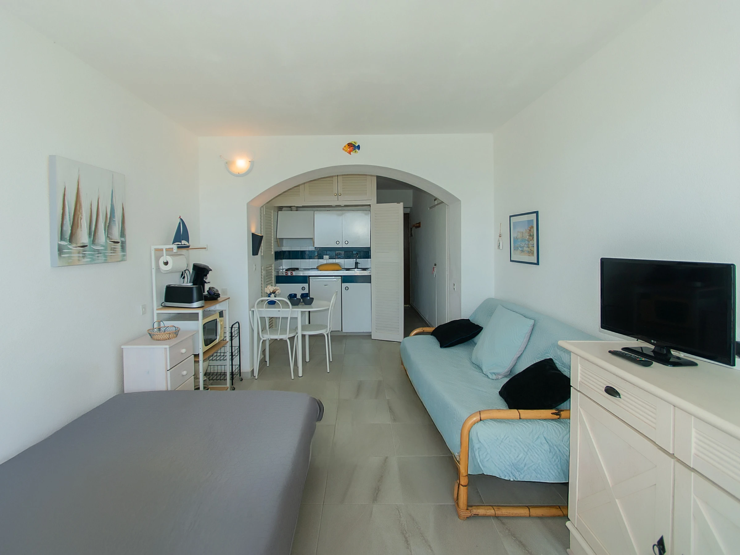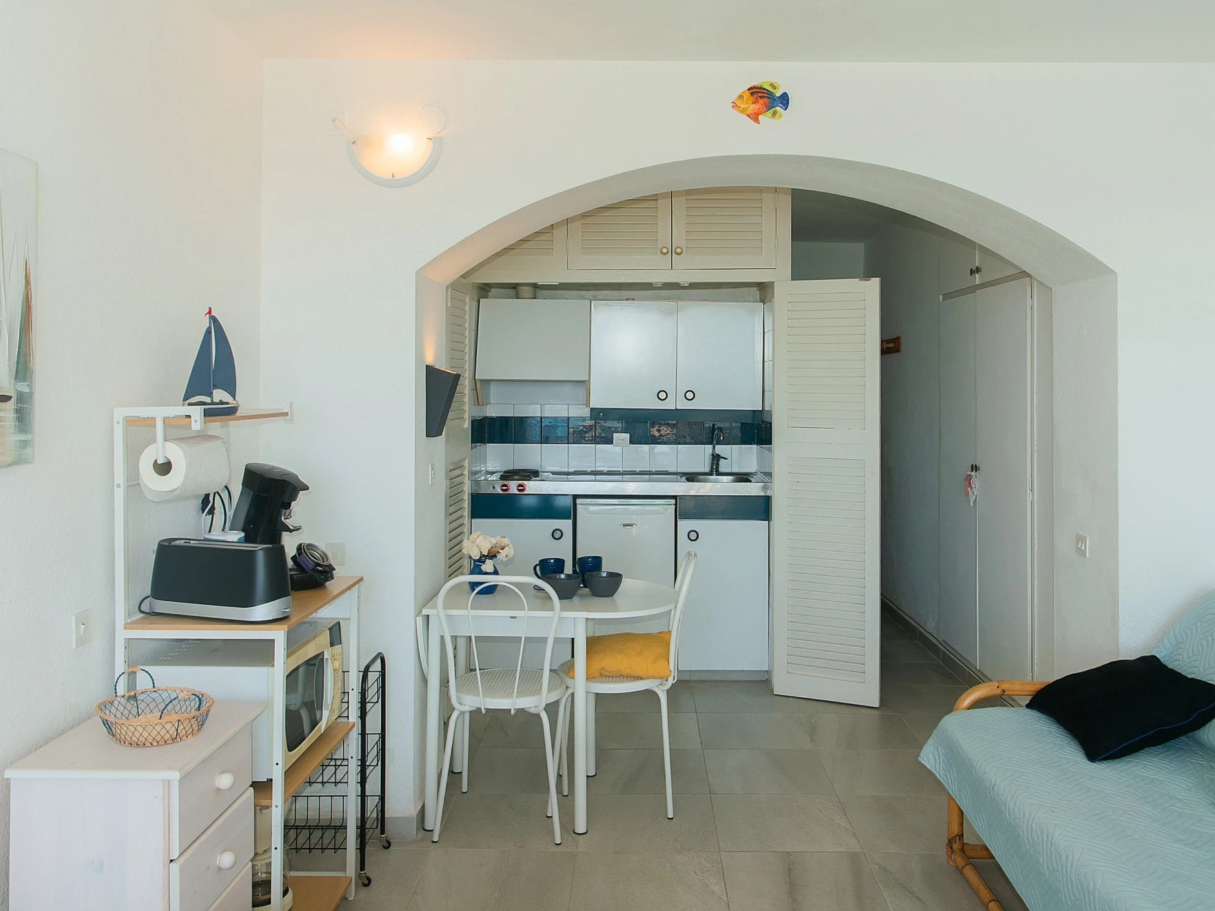 El estudio está equipado con todo lo necesario para una estancia cómoda: un sofá de dos plazas, un sofá de una plaza, televisión y zona de comedor. Aquí se puede relajar después de un día lleno de experiencias o reunirse para cenar con los seres queridos. La zona de cocina está completamente equipada, lo que permite cocinar los platos favoritos disfrutando de la vista al mar.