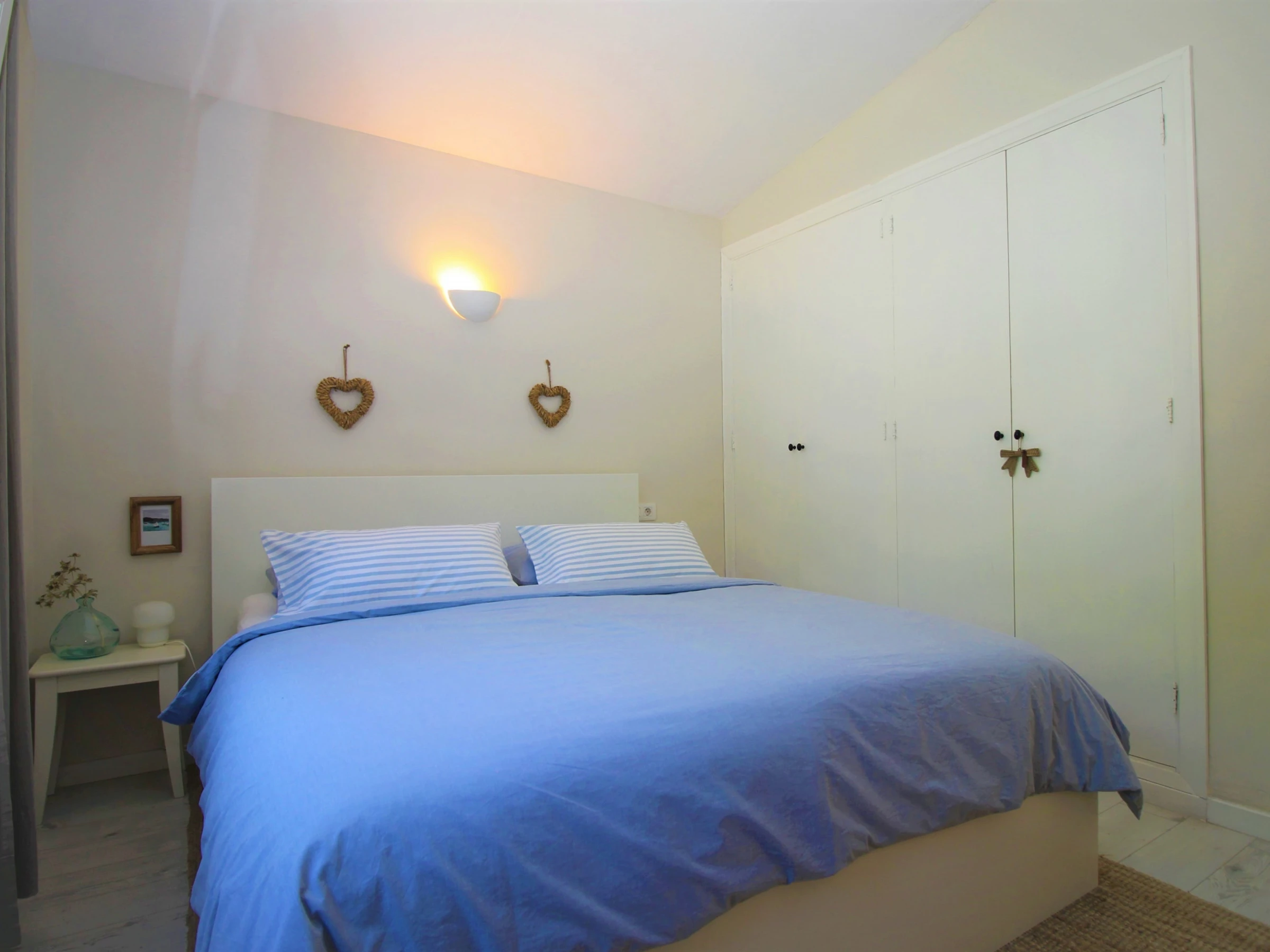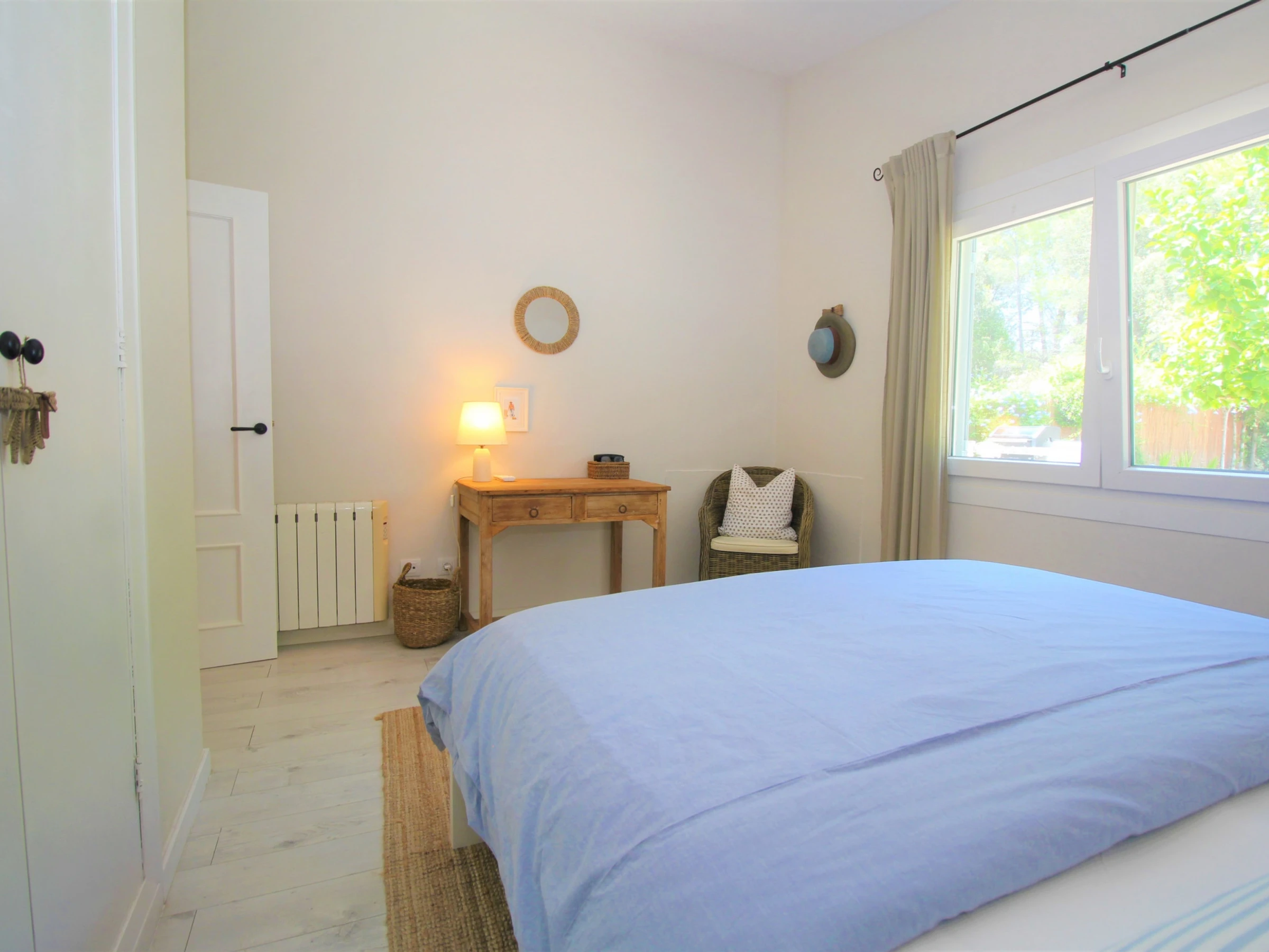 La distribución de la casa es práctica y funcional. El salón tiene una cocina abierta con una zona de comedor y una sala de estar equipada con TV, además de acceso directo al jardín. Los dos dormitorios dobles, ambos con aire acondicionado (frío/calor), cuentan con armarios empotrados y amplias ventanas que ofrecen vistas al jardín, lo que permite disfrutar del entorno natural. El cuarto de baño está equipado con ducha, brindando comodidad y funcionalidad.