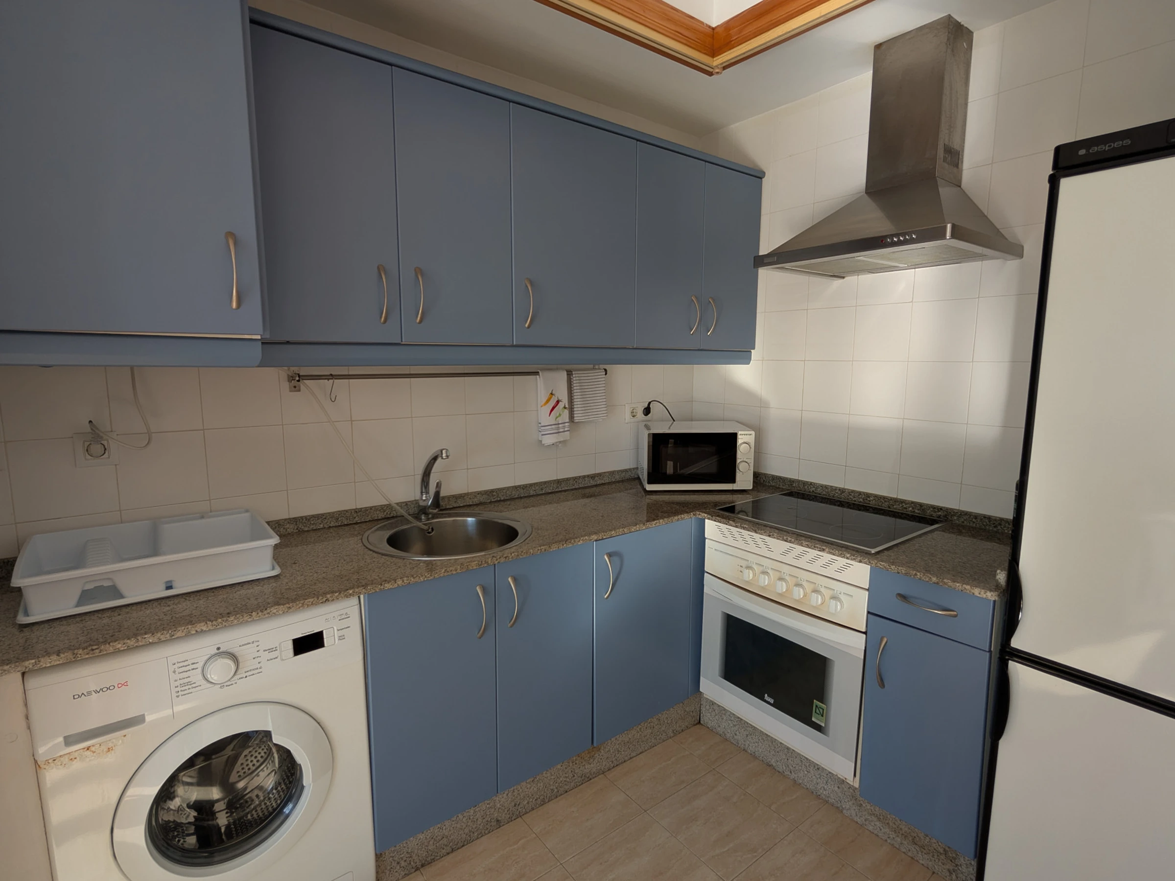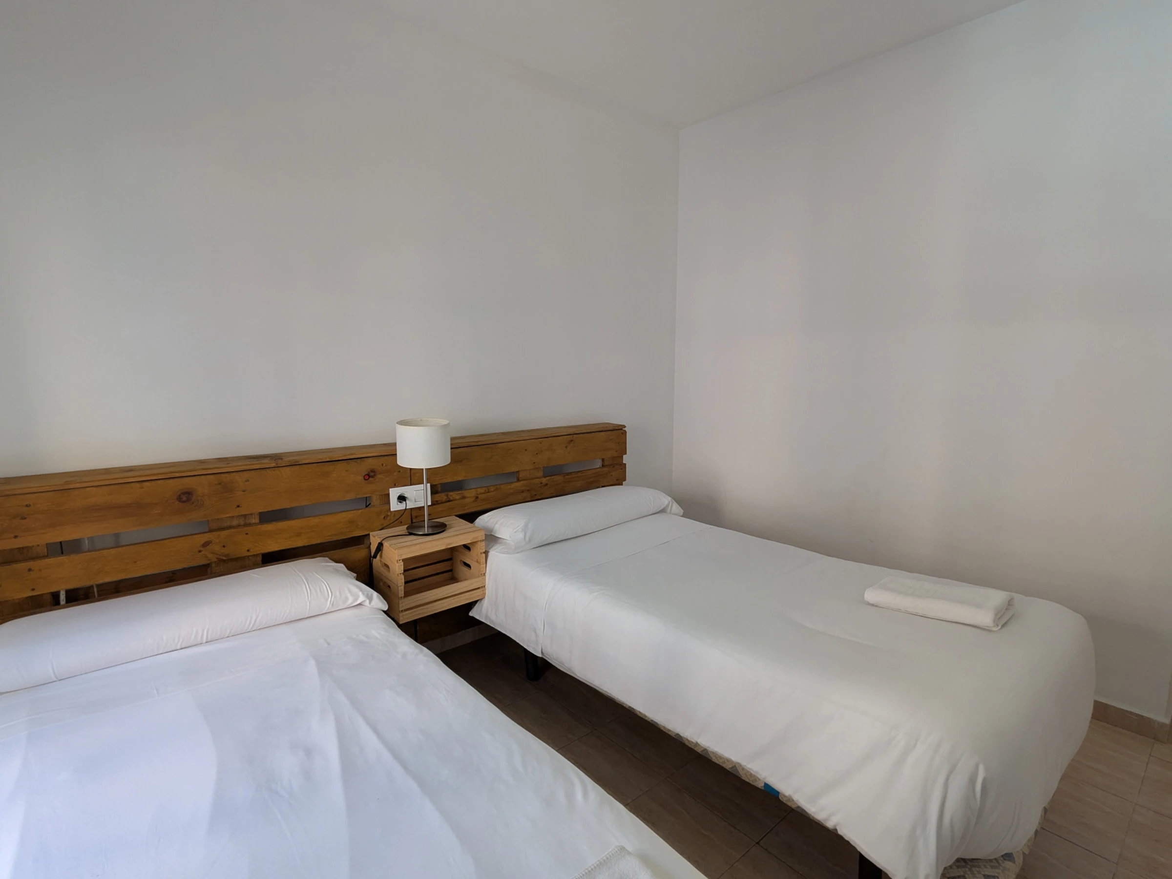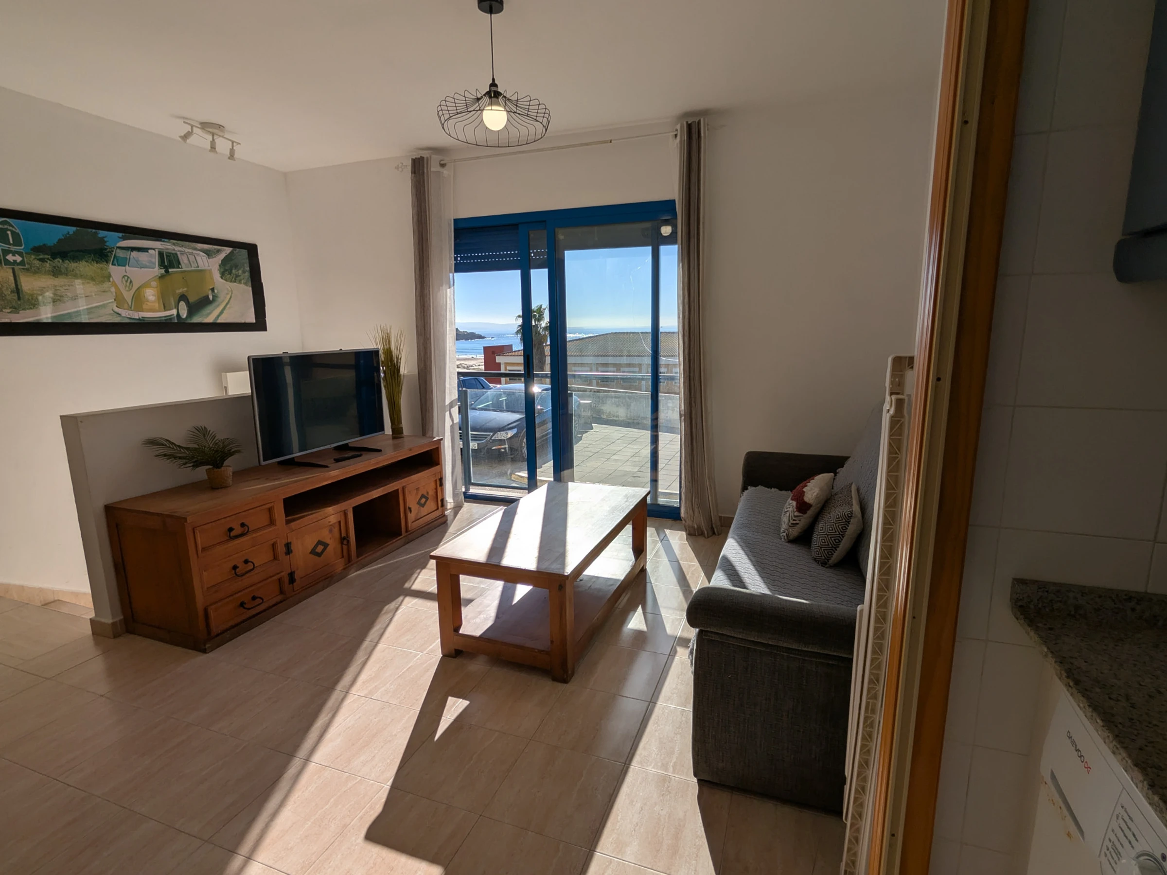 Apartamento con vistas al mar. A la mano de todo, lo primero que nos encontramos al entrar al alojamiento es un amplio y luminoso salón el cual disfruta de vistas al la playa y al mar. La cocina, integrada en la misma estancia, cuenta con todo el equipamiento necesario para cocinar en casa: placa vitrocerámica de 4 fuegos, microondas, nevera-combi, [hidden] pasillo no lleva hasta las habitaciones; una con cama doble y la otra con 2 individuales y al baño (con plato de ducha). Lo mejor de este apartamento es su céntrica situación, sus vistas y su relación precio/calidad.