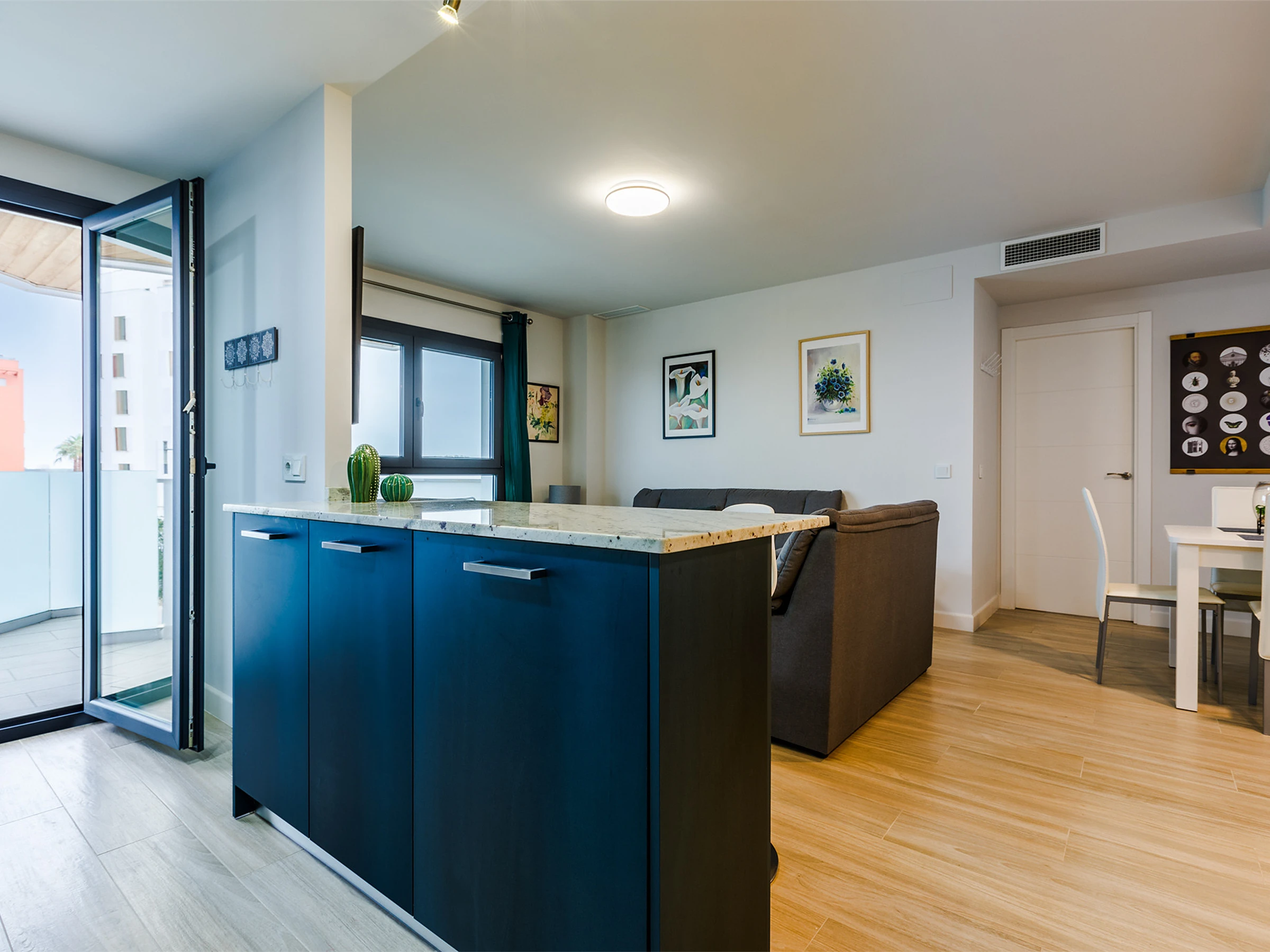 El salón-comedor es amplio y acogedor, con acceso directo a una terraza privada, perfecta para desayunar al aire libre o relajarte al final del día.