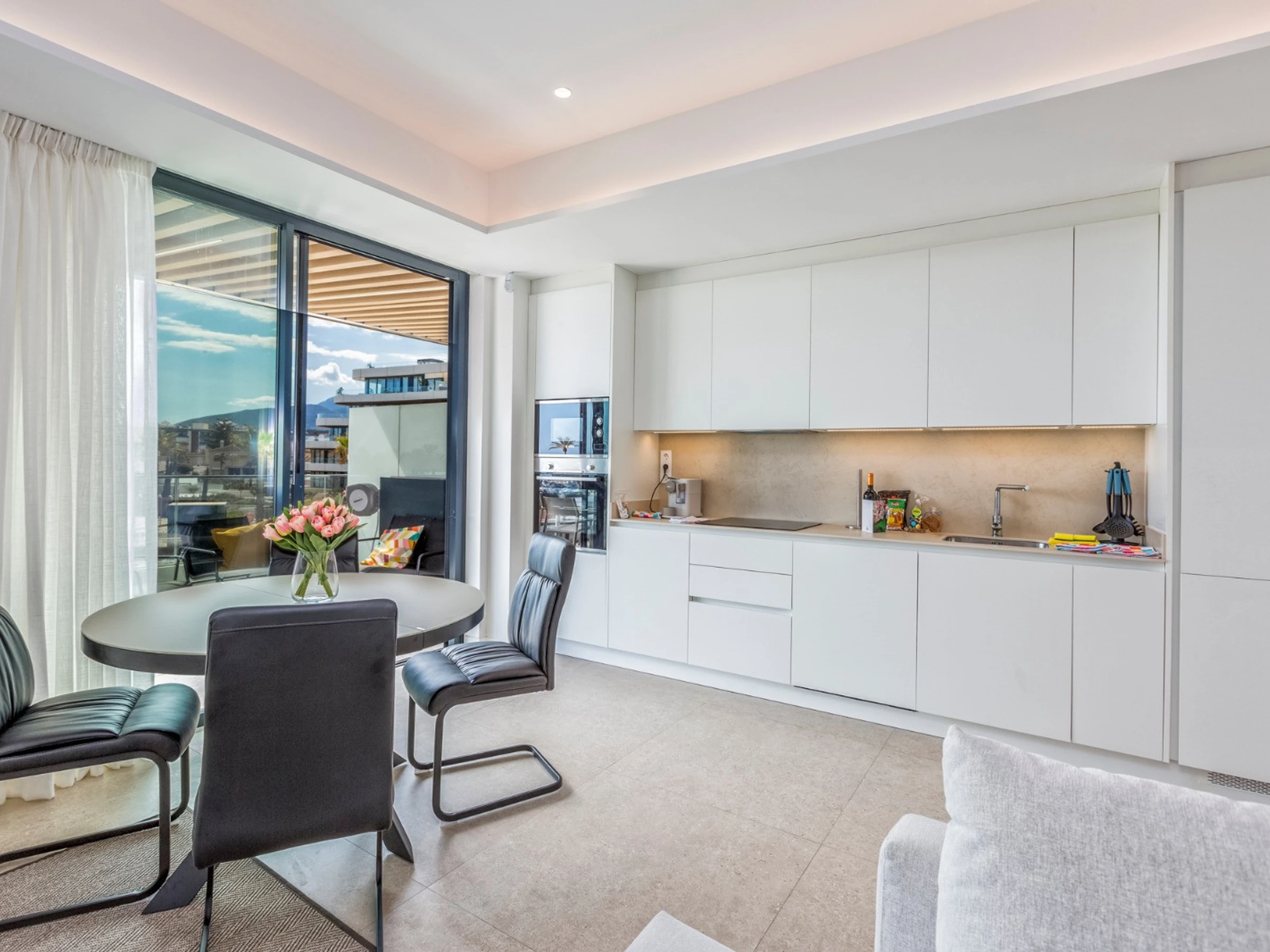 Fuera, puedes disfrutar de la playa y las montañas, una vista impresionante que proporciona el escenario perfecto para un café matutino relajado o una velada tranquila bajo las estrellas.