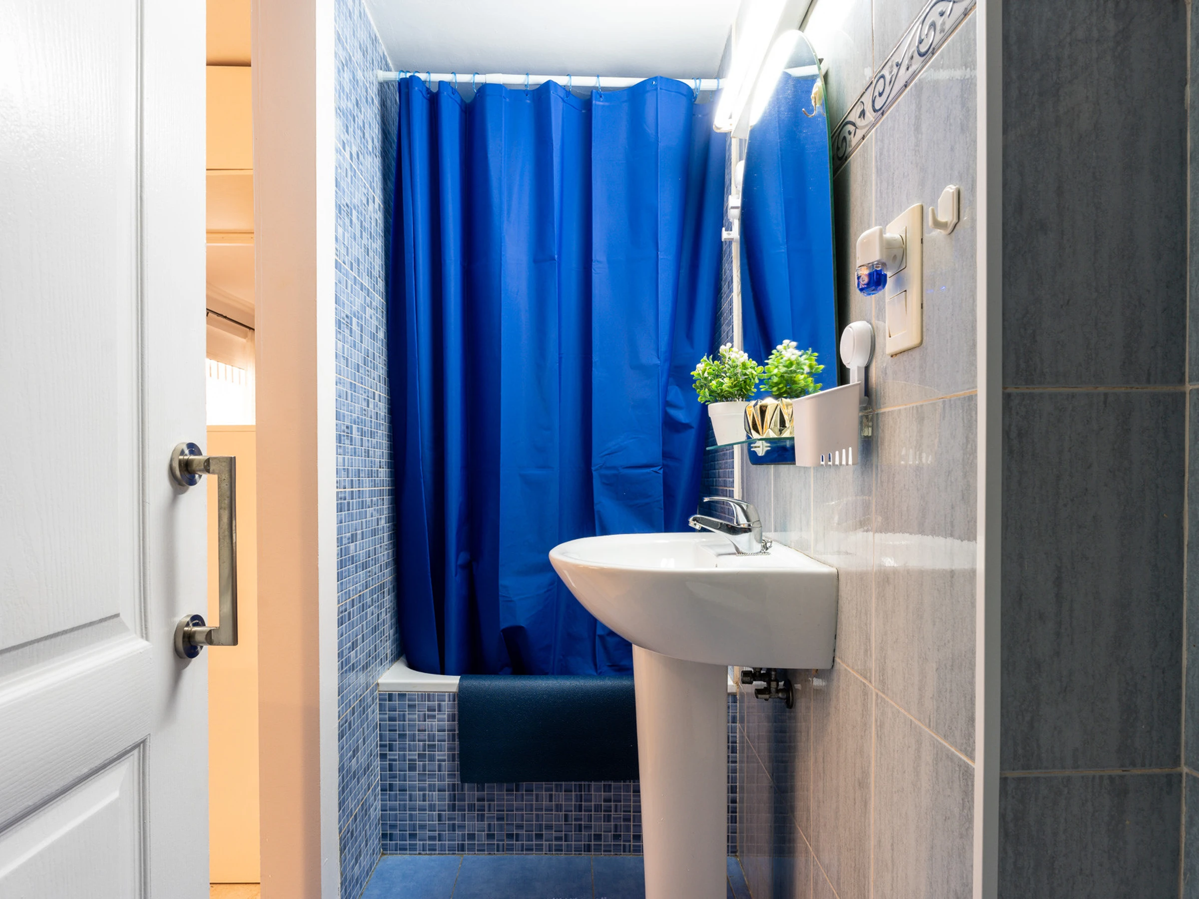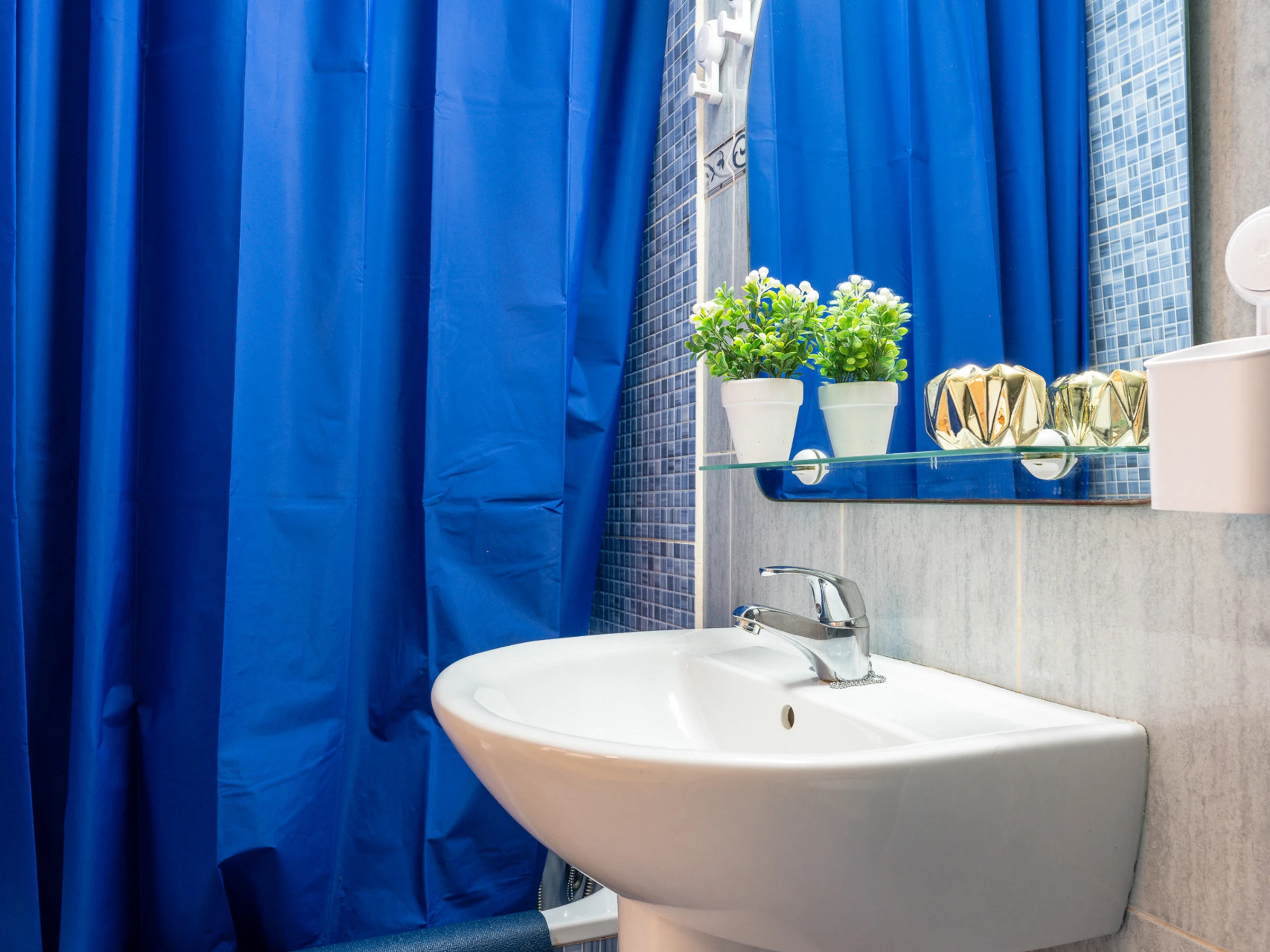 Es pequeño pero bastante acogedor con un amplio sofá cama. Cuenta con un cocina americana que está totalmente equipada con nevera, congelador, microondas, cafetera, tostadora, lavadora..