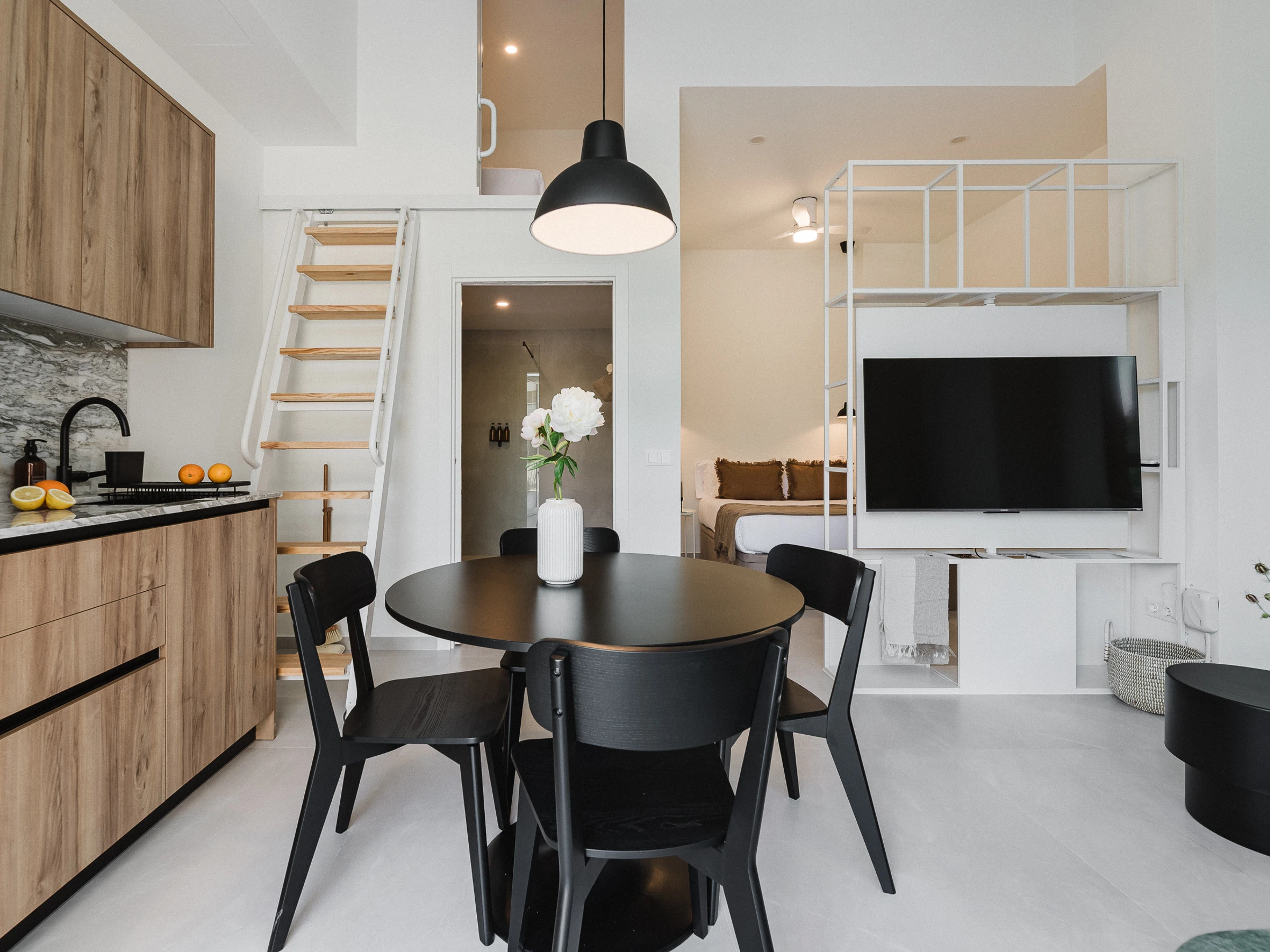 • Recámara semi privada con cama queen size (1.60 m), ubicada en el espacio principal y delimitada del salón por un mueble de TV giratorio.
