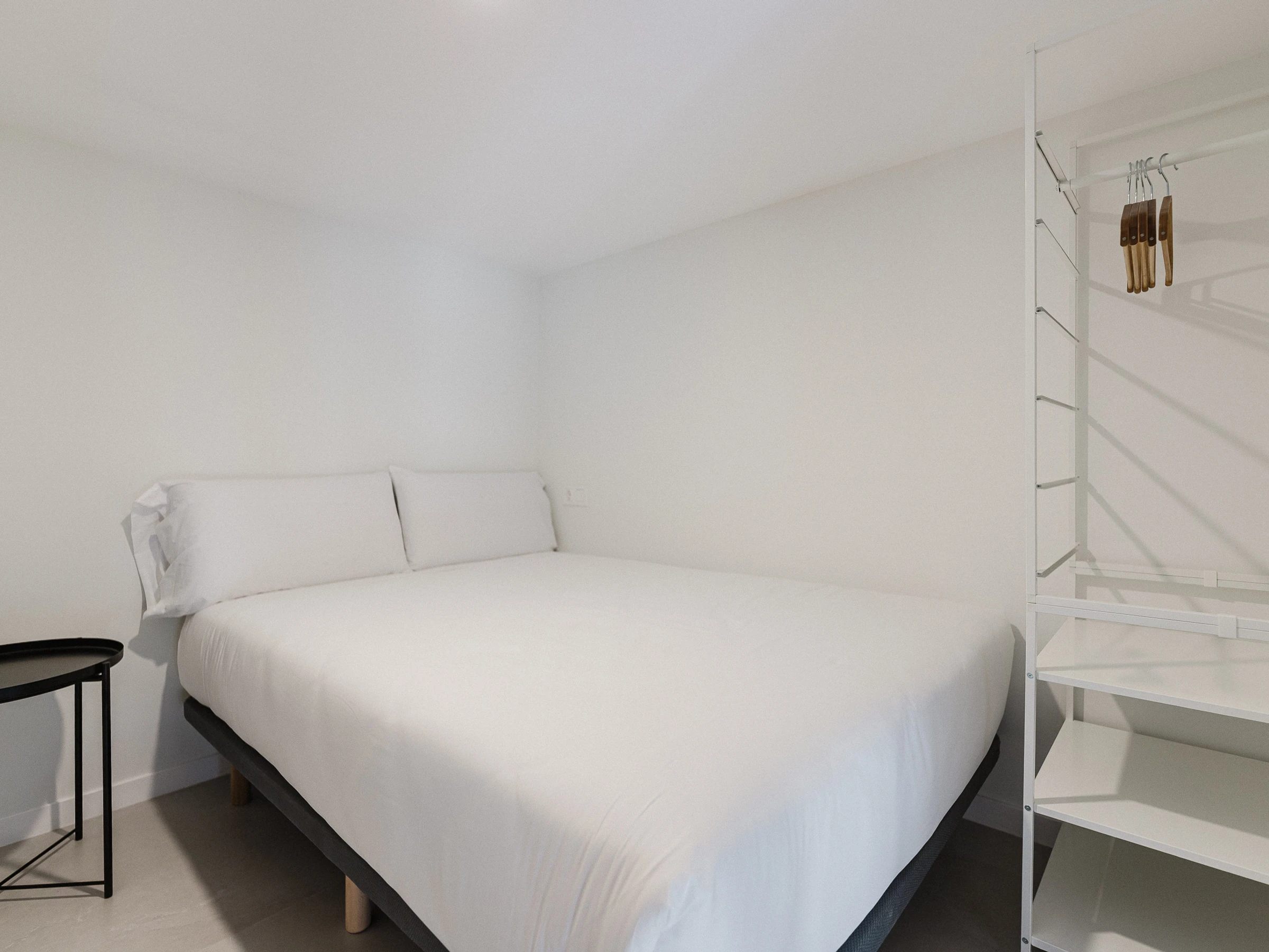 • Recámara semi privada con cama queen size (1.60 m), ubicada en el espacio principal y delimitada del salón por un mueble de TV giratorio.