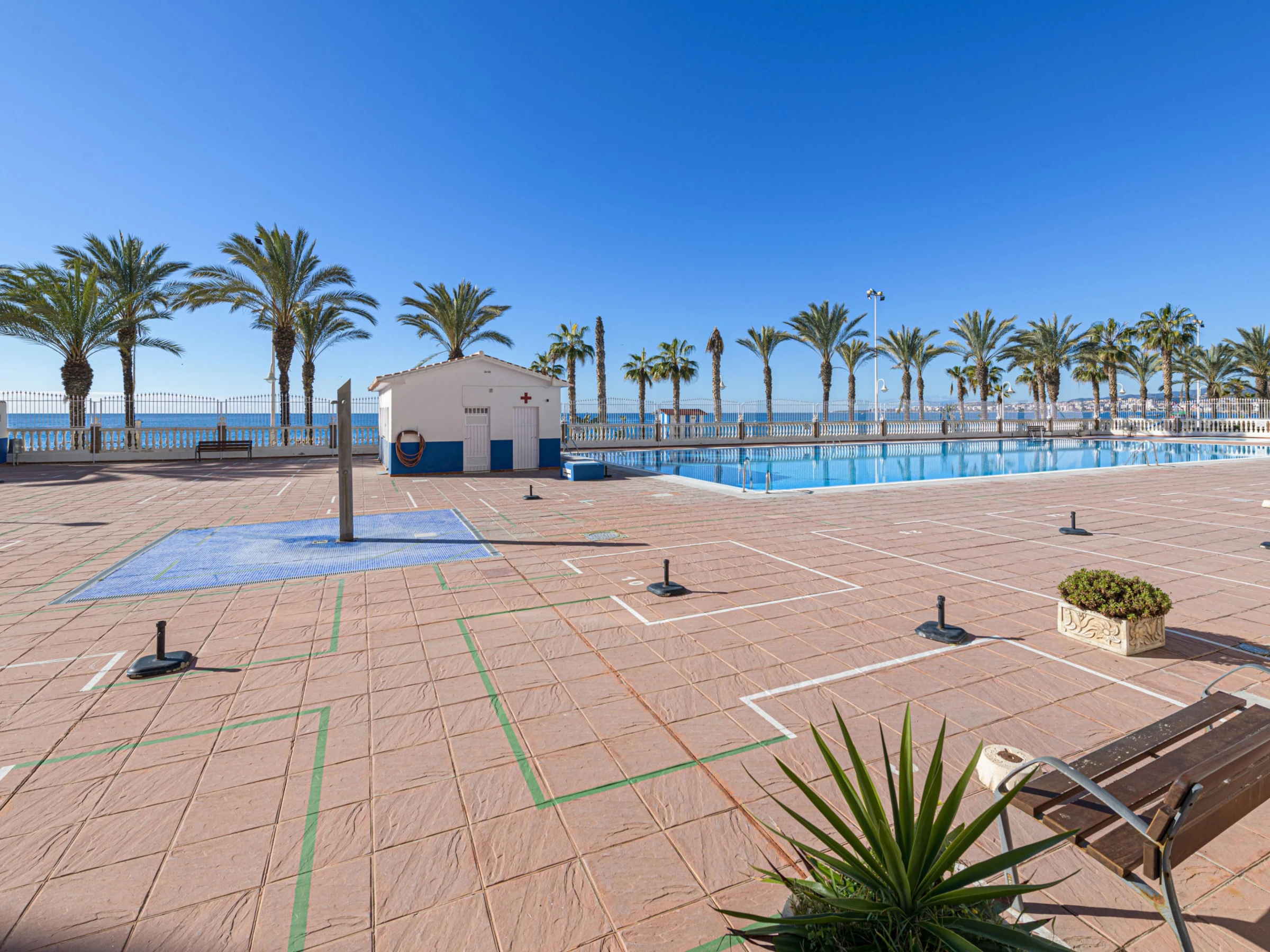À l'extérieur, vous trouverez tout le confort imaginable, notamment une piscine au chlore de 32 m x 14 m, d'une profondeur réglable de 0,8 m à 2,2 m, ainsi qu'une pataugeoire où les plus petits pourront se rafraîchir et jouer en toute sécurité. Les sportifs apprécieront le court de tennis sur place. Veuillez noter que l'appartement se trouve dans une résidence, vous aurez donc des voisins directs et l'intimité est partielle.