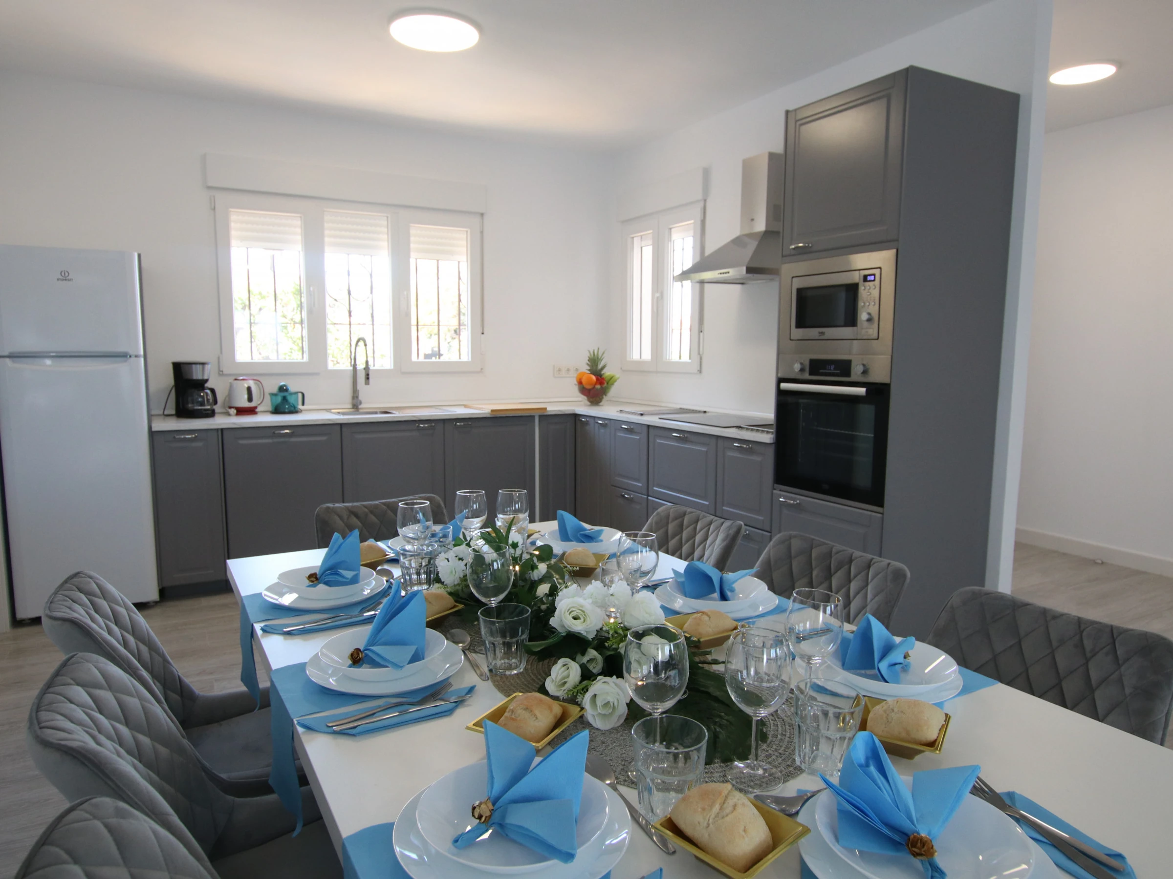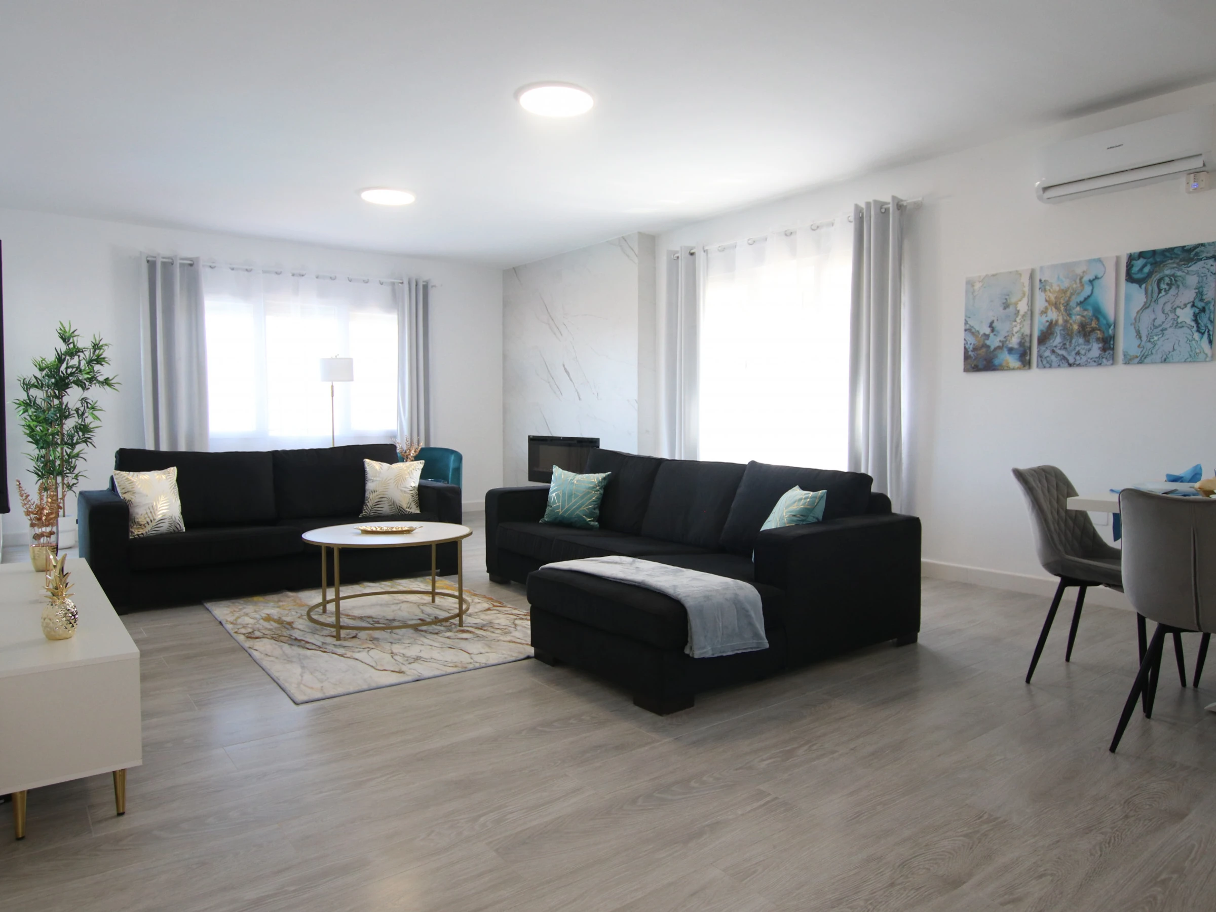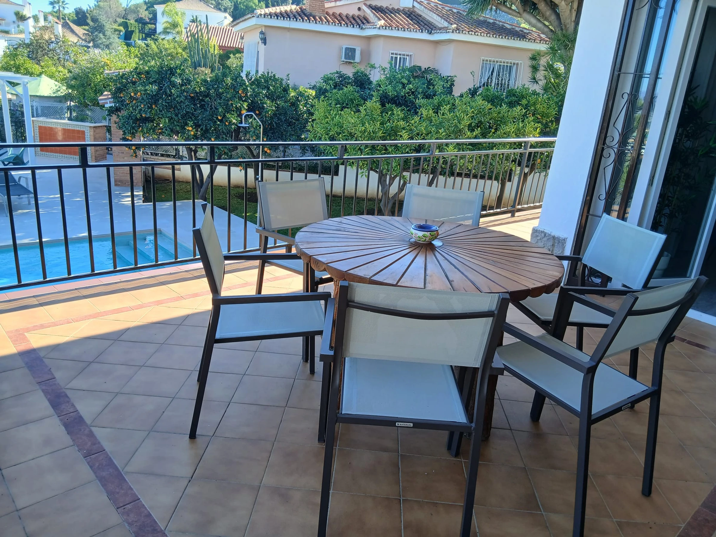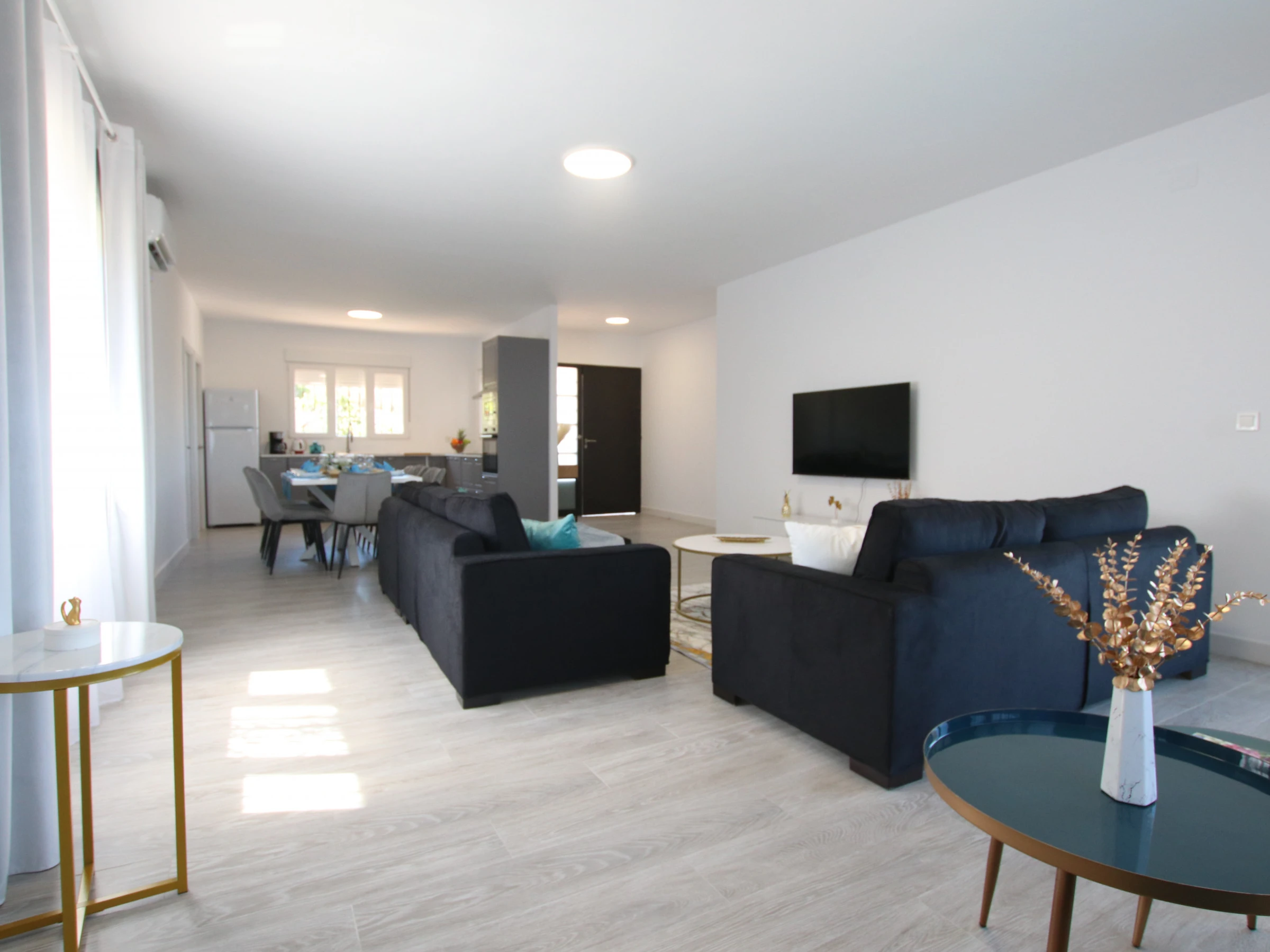 -SALON : conçu avec goût et assez spacieux, avec deux grands canapés, une télévision Full HD, la climatisation et de grandes fenêtres qui donnent accès à une grande terrasse avec vue sur le jardin et la piscine. Très lumineuse et spacieuse. Il dispose également d'une cheminée électrique fonctionnelle et d'un coin lecture avec deux fauteuils séparés. Une connexion Internet et WIFI est disponible dans la maison.