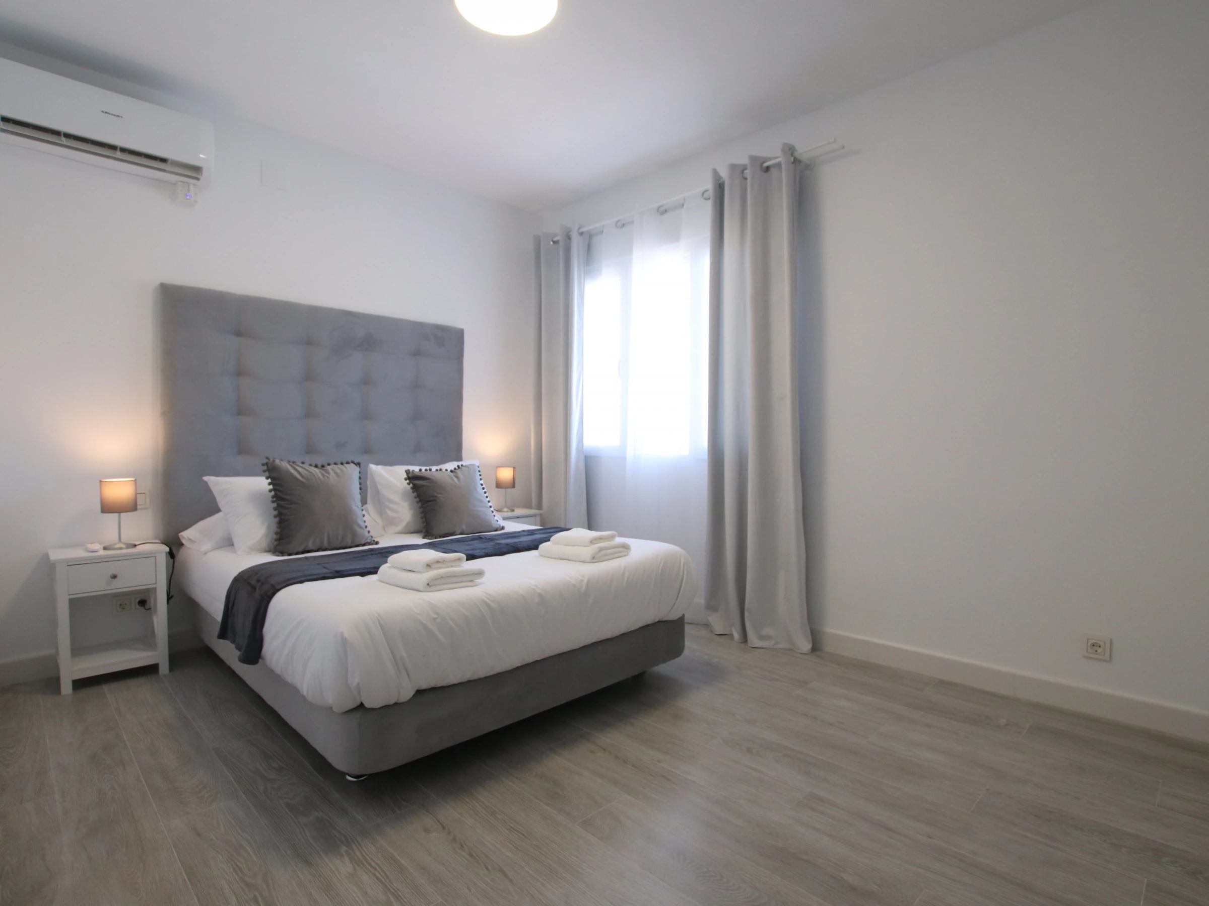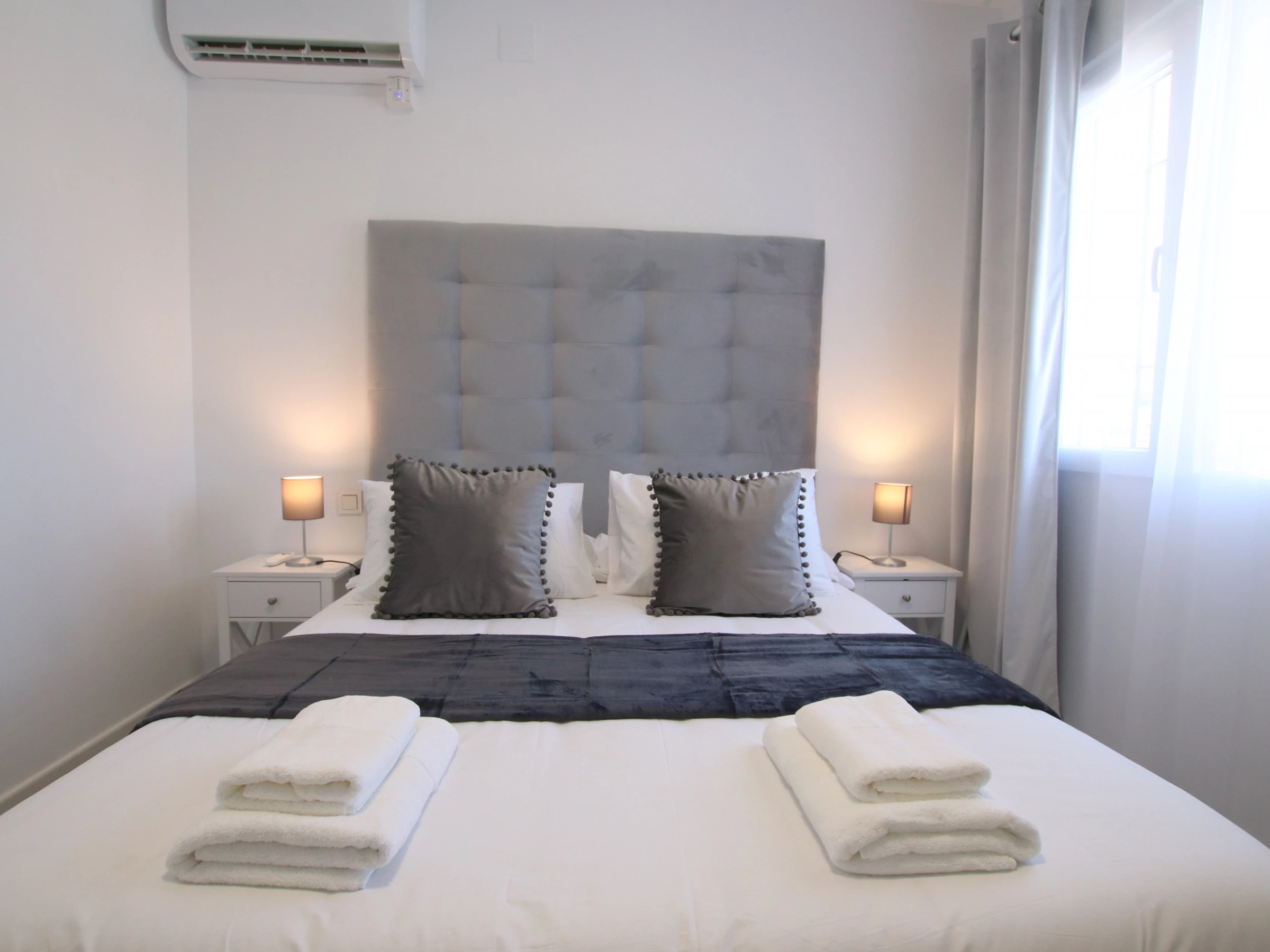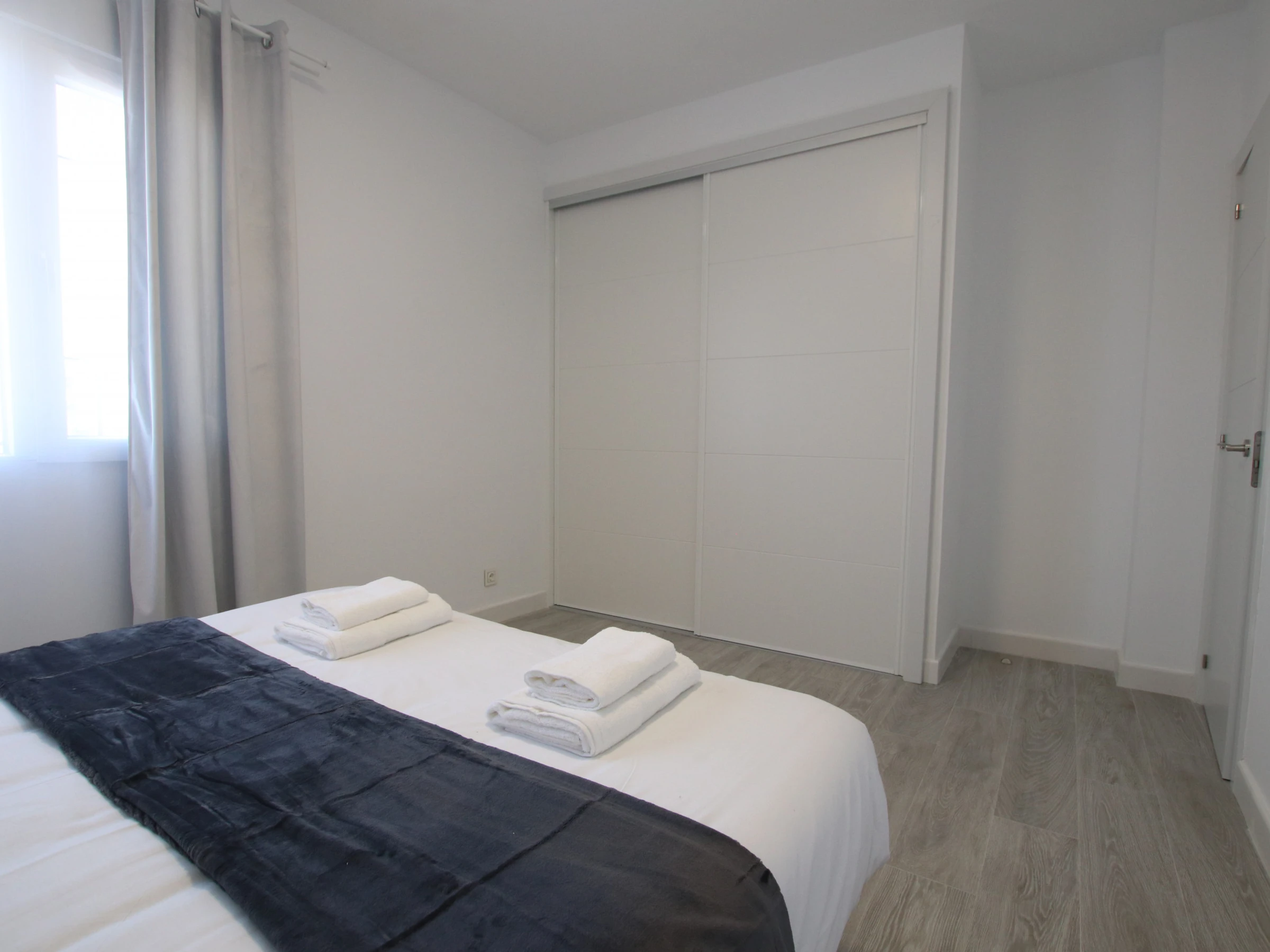 -CHAMBRE A : comprend un lit double de 150x200cm, l'air conditionné, une armoire encastrée et des fenêtres avec stores et rideaux occultants.