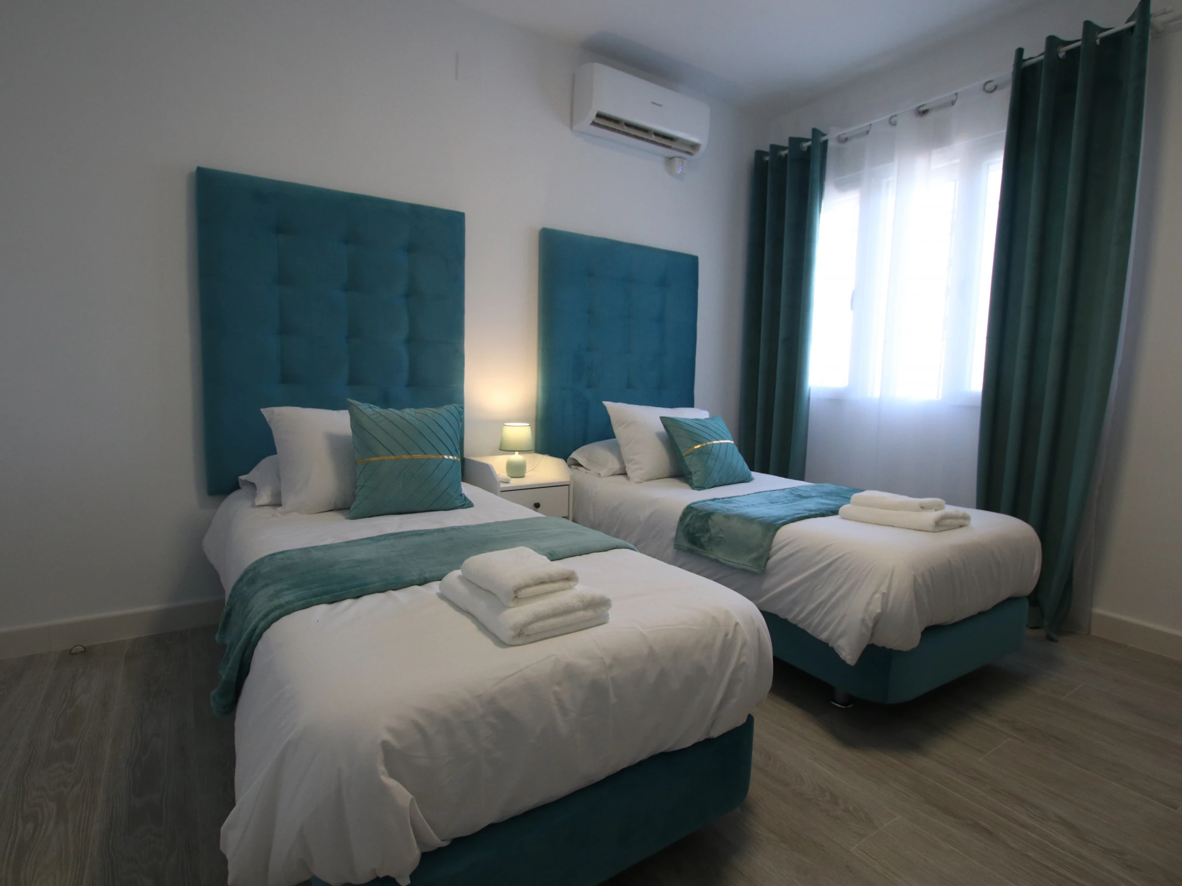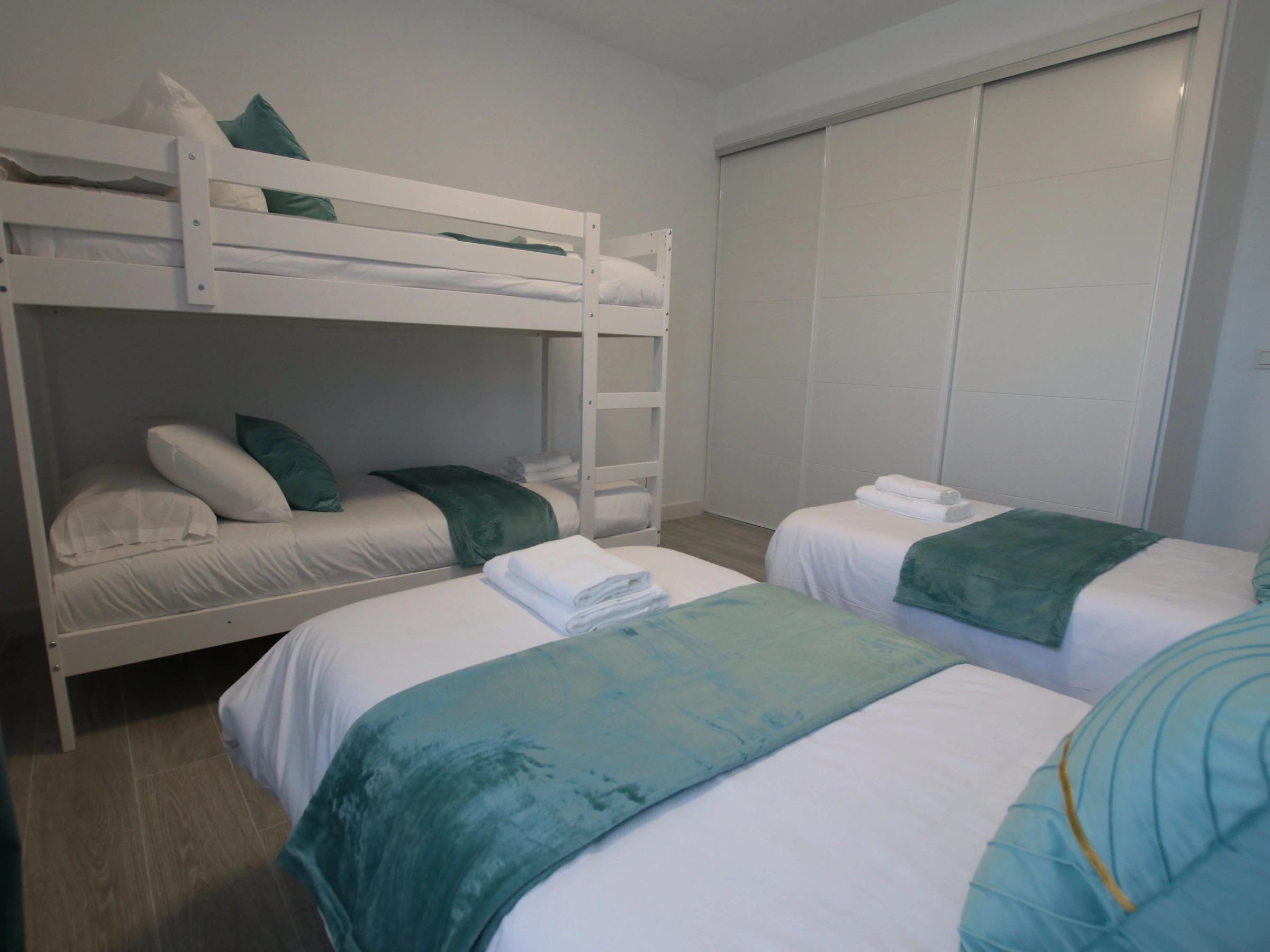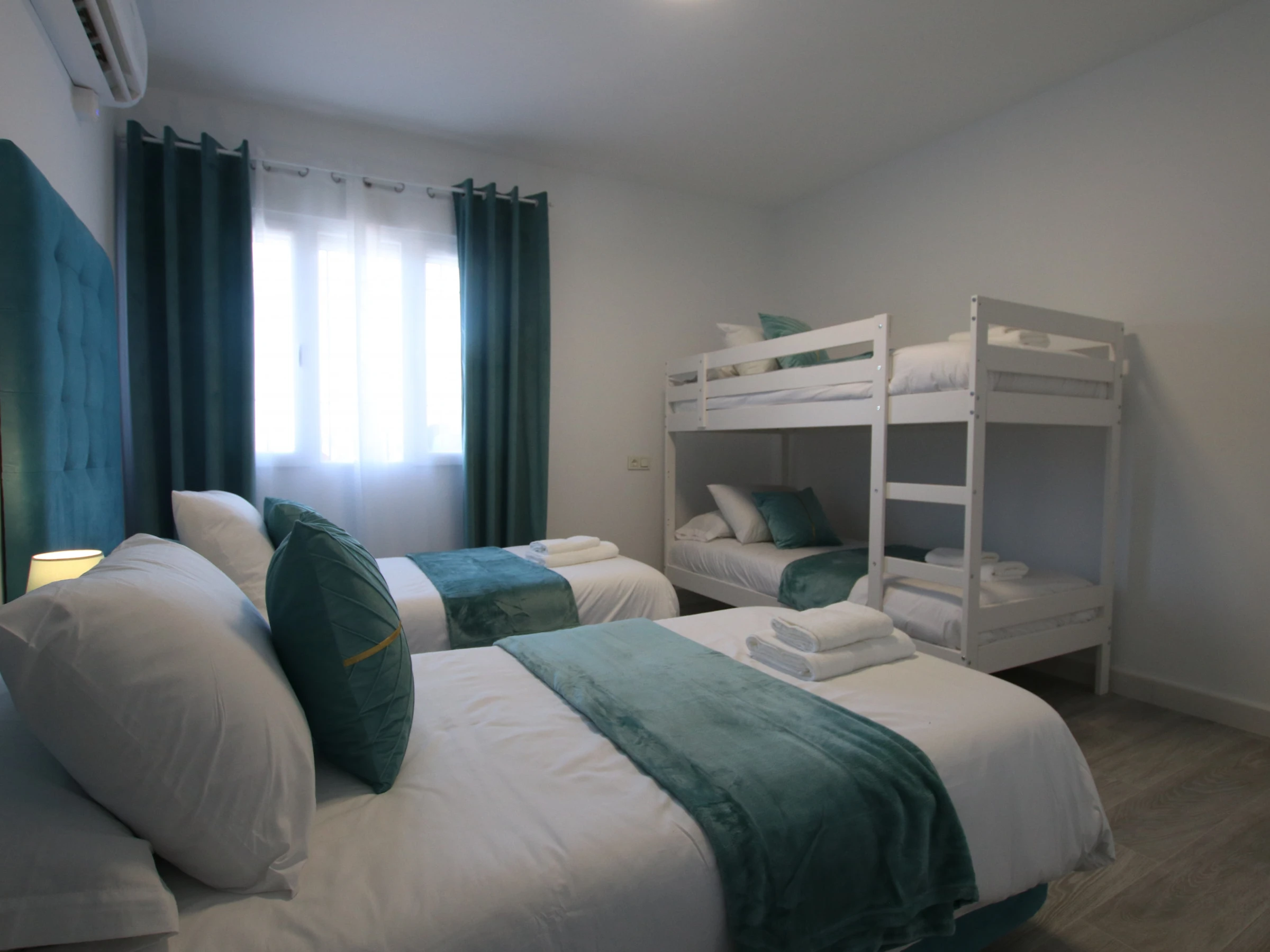 -CHAMBRE C : comprend deux lits simples de 90x200cm et un lit superposé, avec air conditionné, armoire encastrée et fenêtre avec store et rideaux occultants.