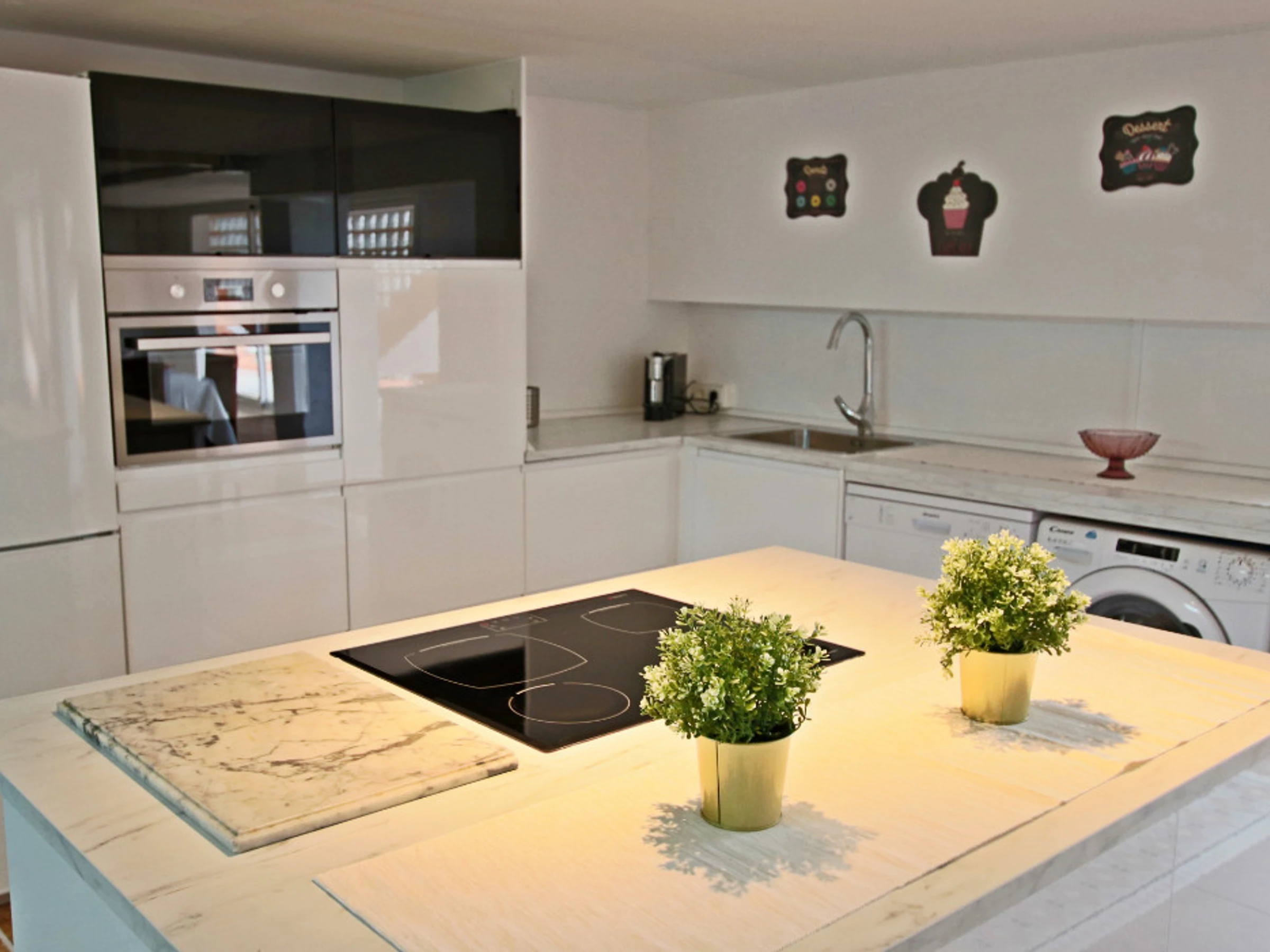 Au rez-de-chaussée, on trouve la deuxième cuisine entièrement équipée avec un bel îlot très moderne et confortable car elle est très proche de la piscine.