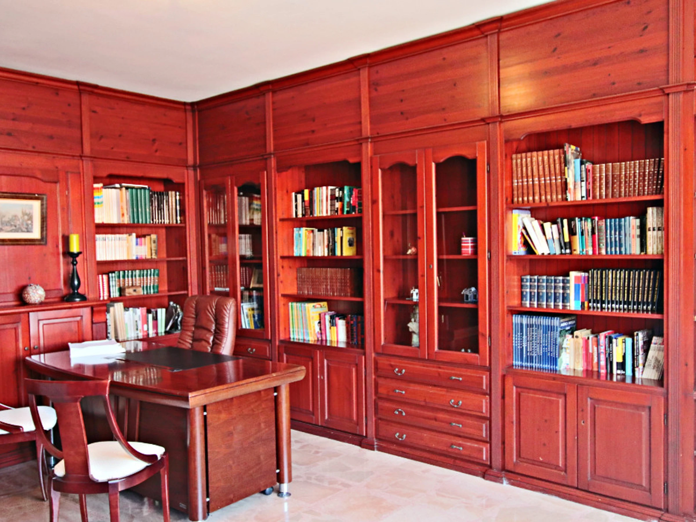 Au rez-de-chaussée, nous trouvons une sixième chambre (avec un lit de 140 x 200), avec air conditionné et chauffage, un coin bureau et bibliothèque et de grandes fenêtres avec vue sur les montagnes. Nous trouvons également une septième chambre (avec quatre lits simples de 90 x 200), avec air conditionné et chauffage, un espace pour enfants, des jeux pour enfants et des jeux de société.