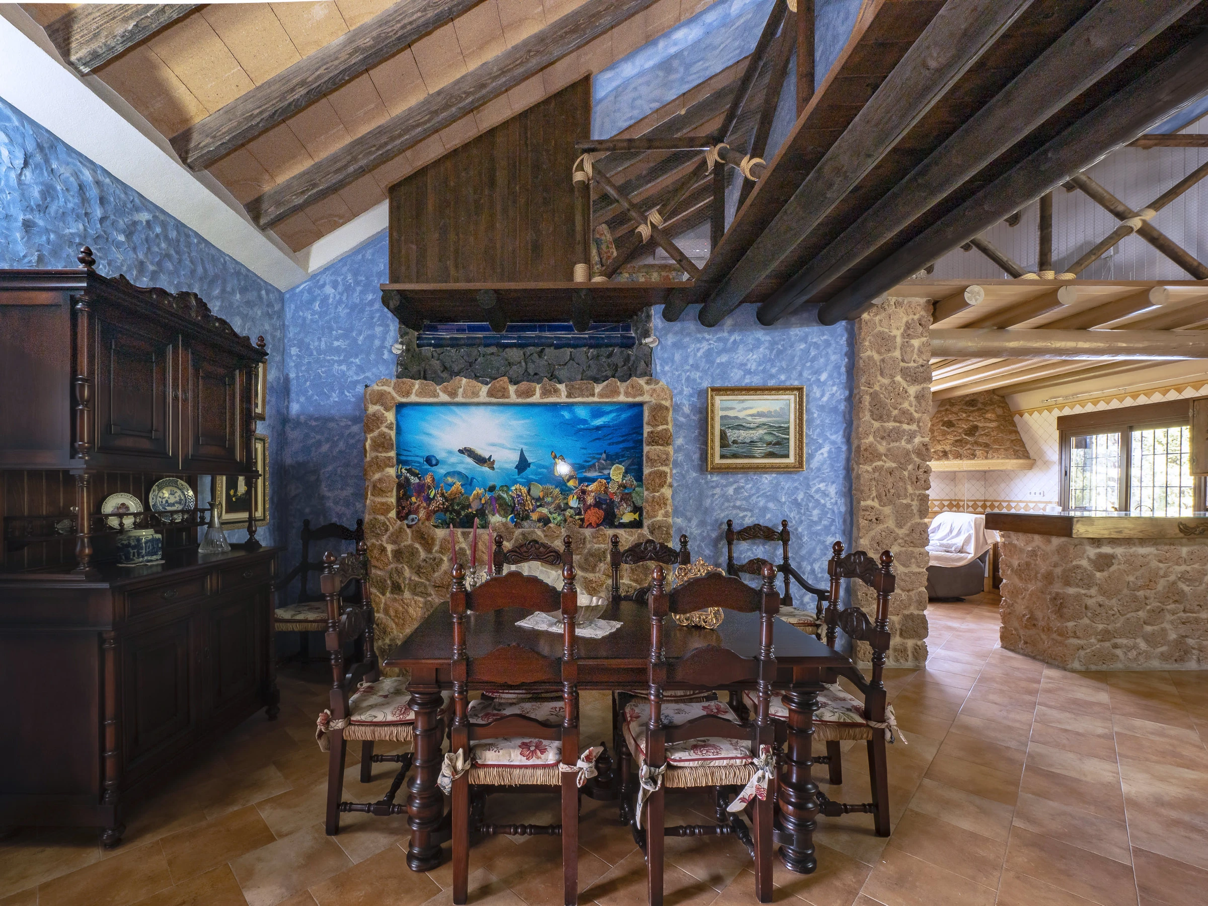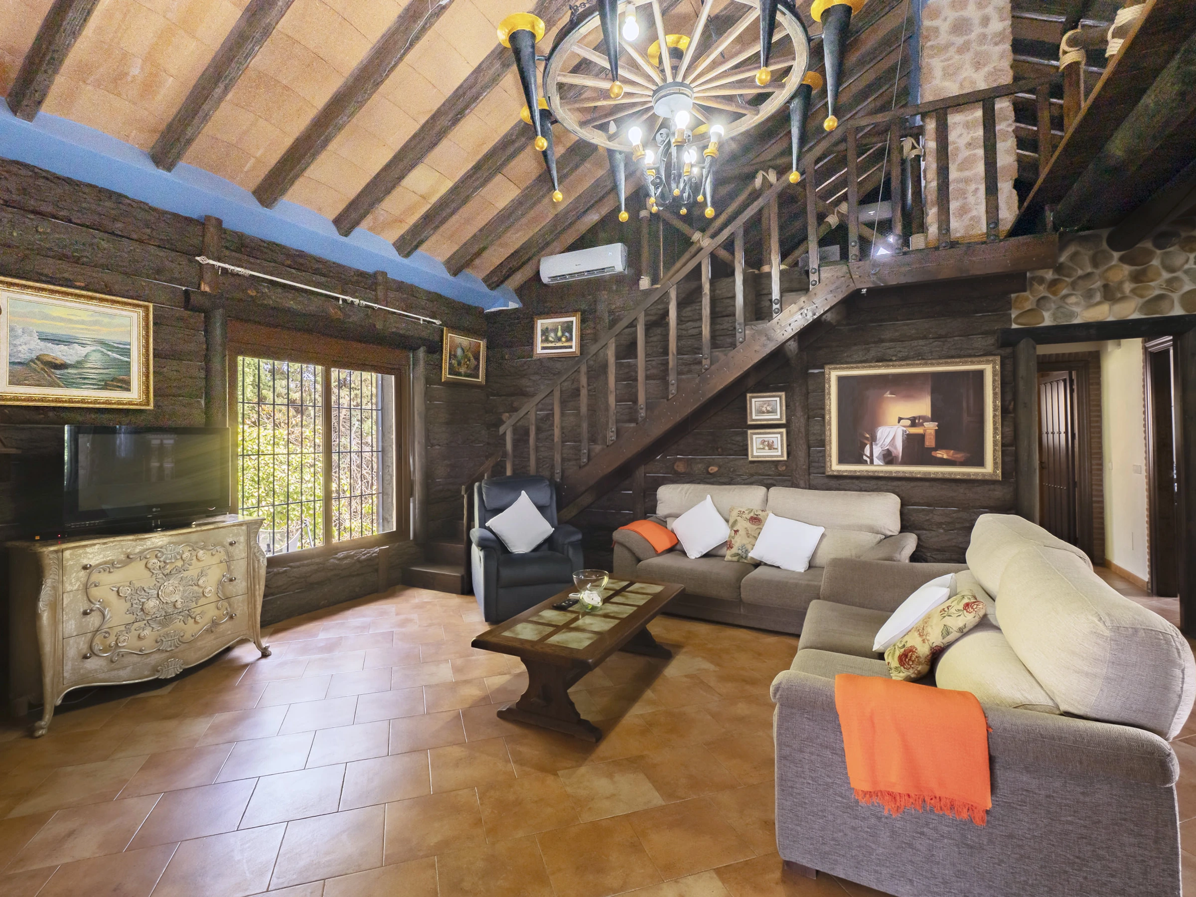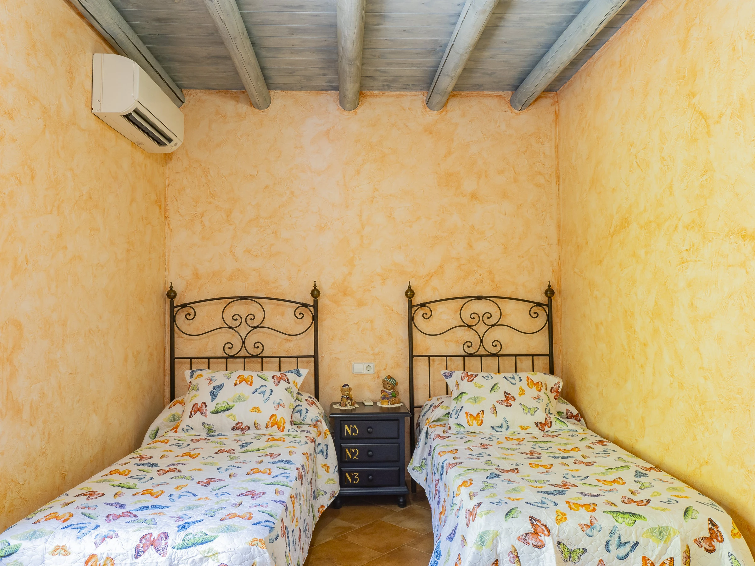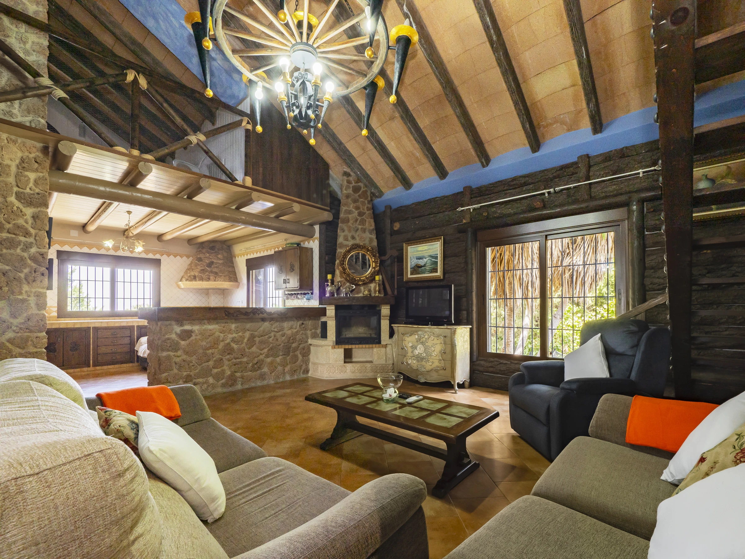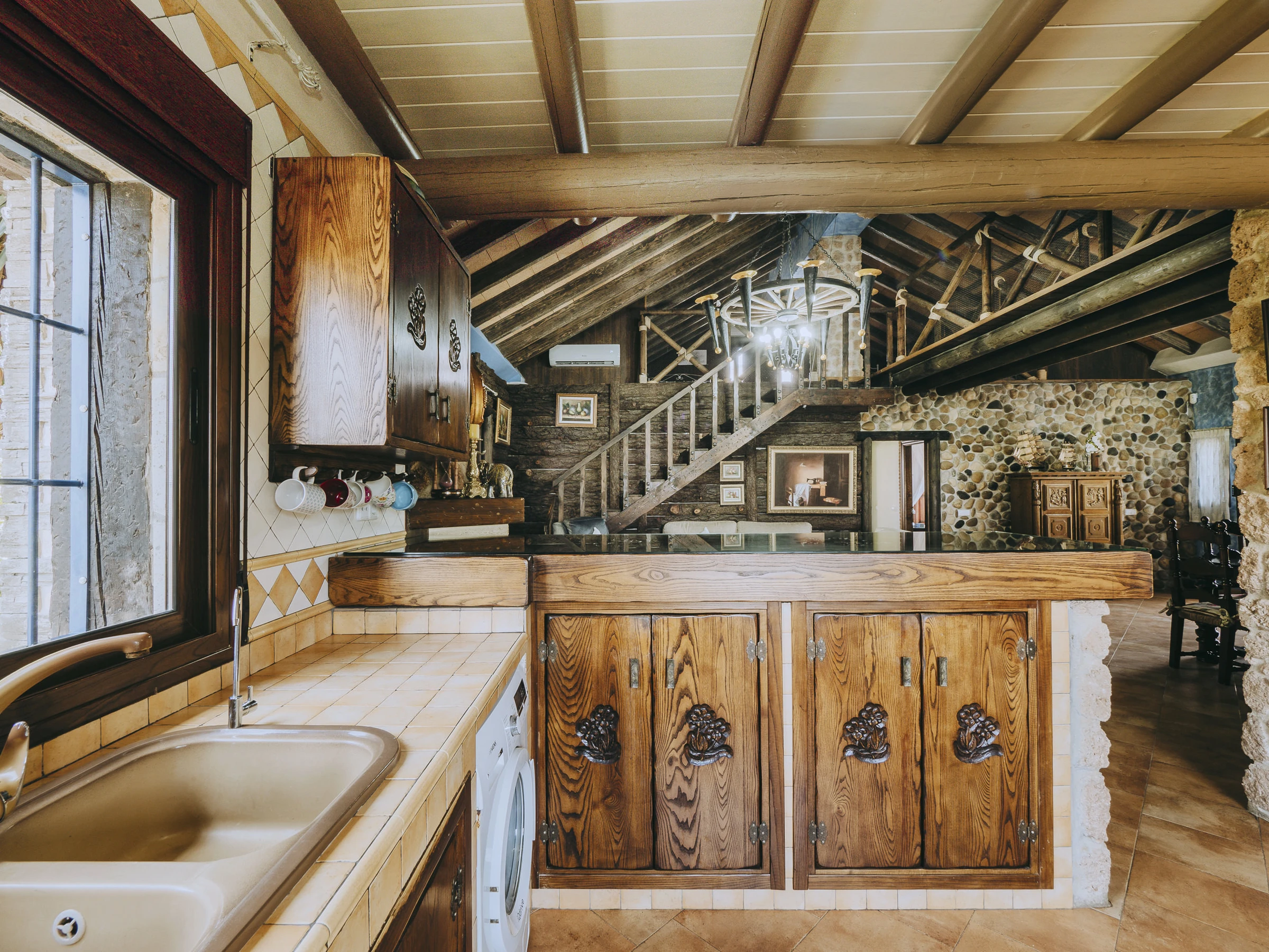 La villa se distingue par son style rural chaleureux, combinant bois et pierre qui apportent chaleur et confort. Elle dispose de trois chambres : au rez-de-chaussée, une chambre principale avec un lit king size et une autre avec deux lits individuels, toutes deux avec climatisation et espace pour ranger vos bagages. À l'étage, sous des toits à deux pentes avec des poutres en bois, vous trouverez deux lits doubles et une zone de repos avec un bureau, idéale si vous devez travailler ou étudier pendant votre séjour 💻.