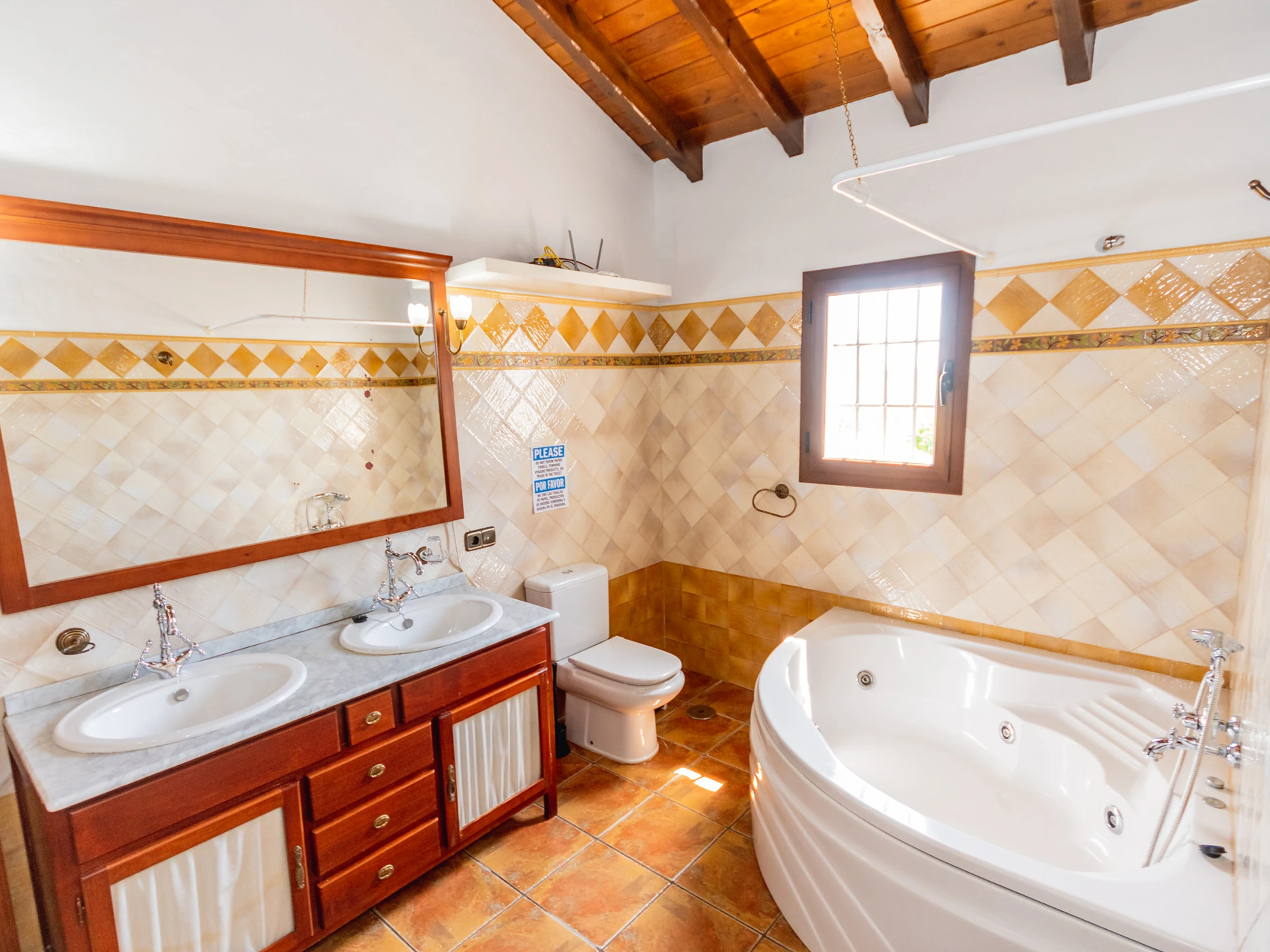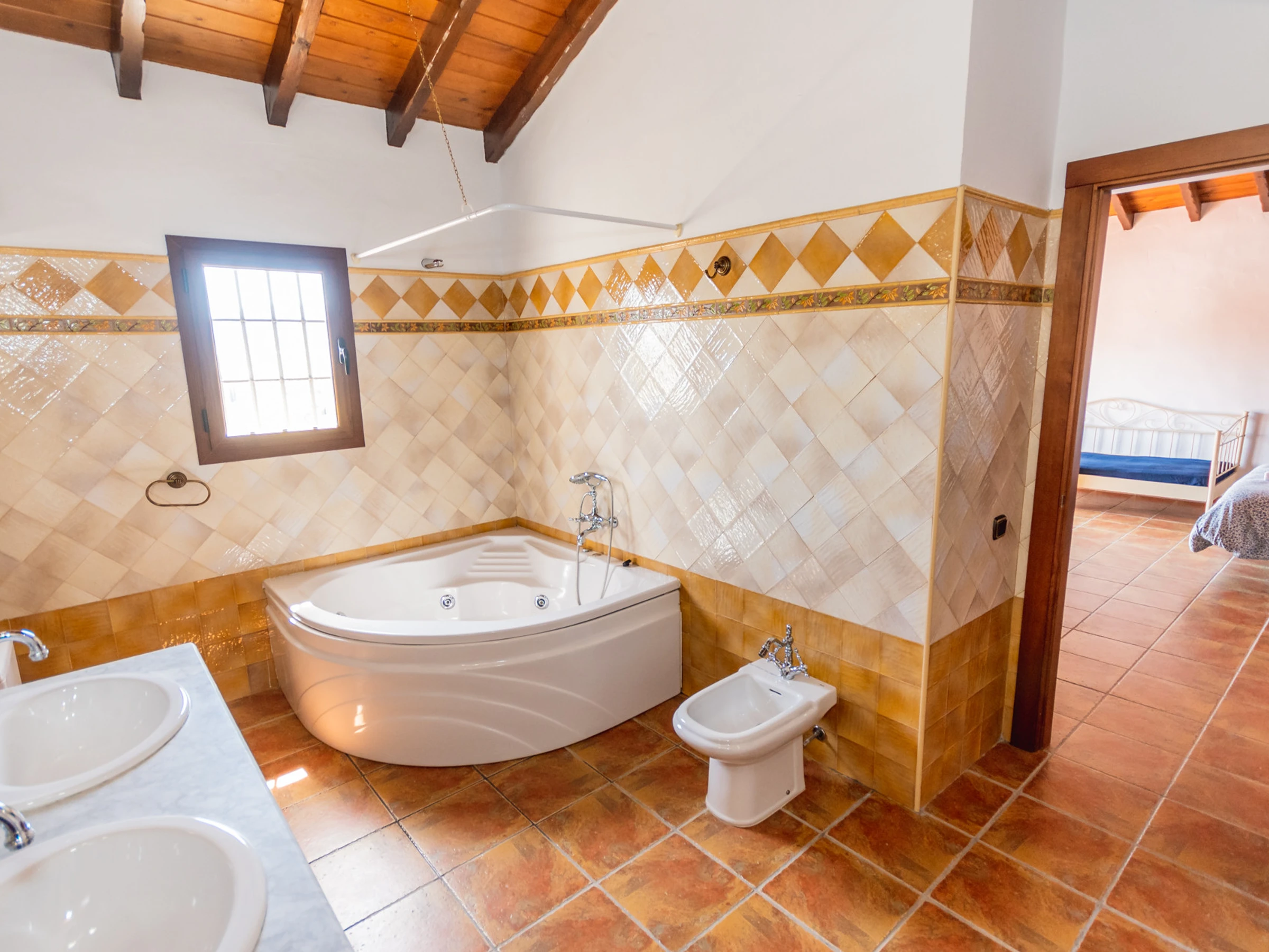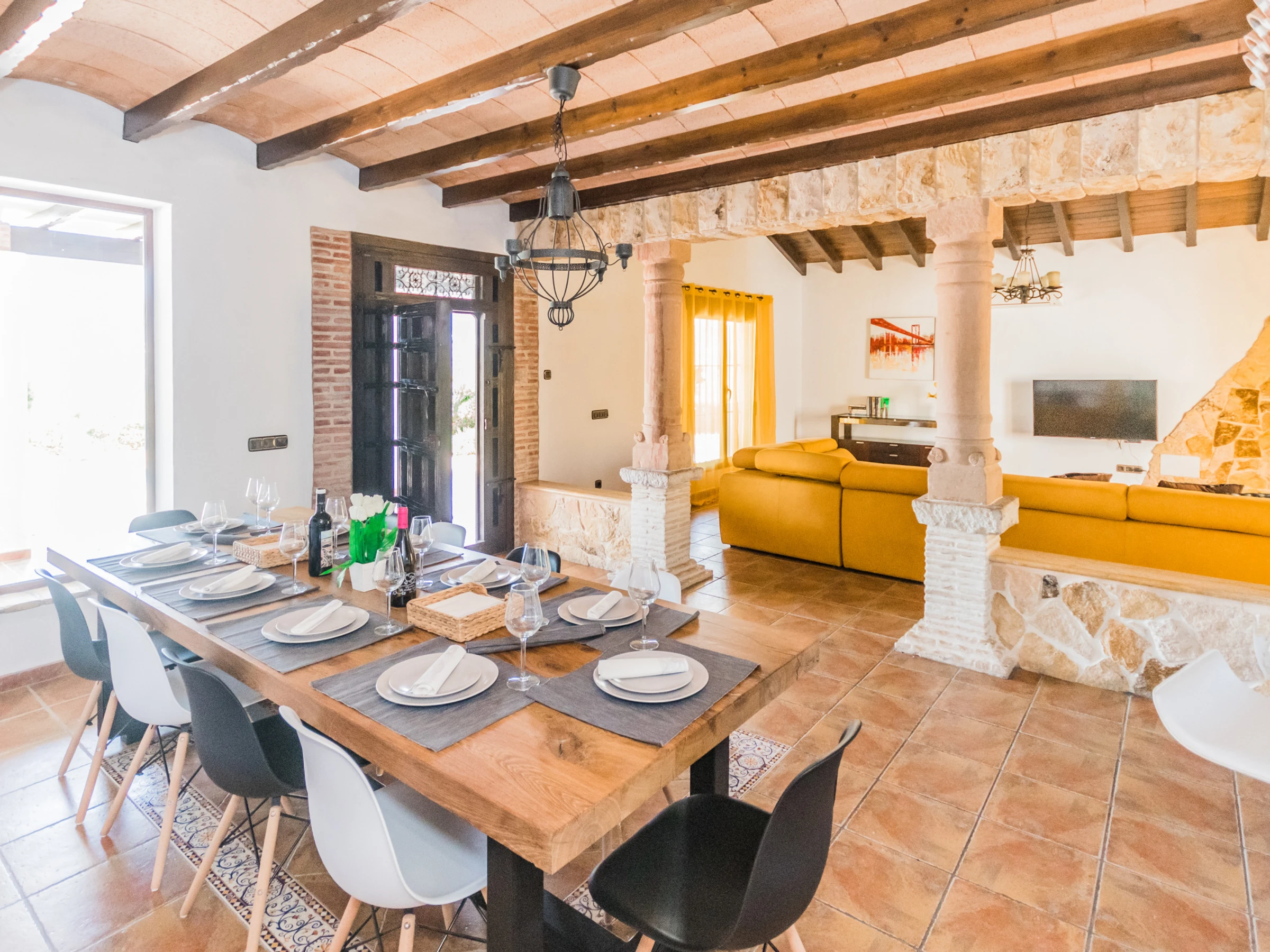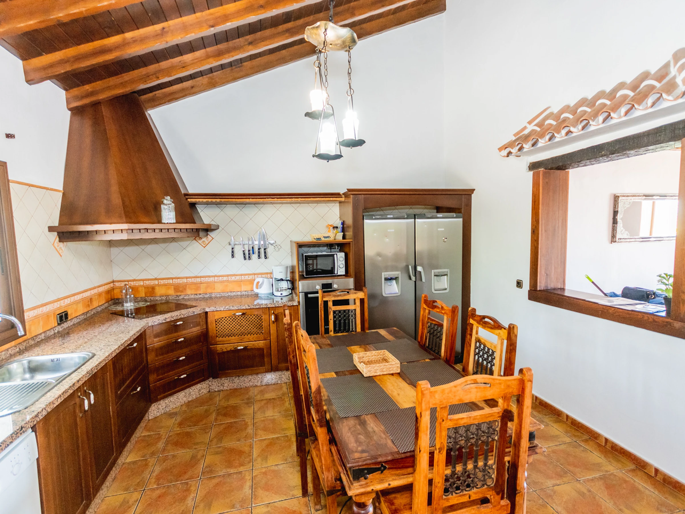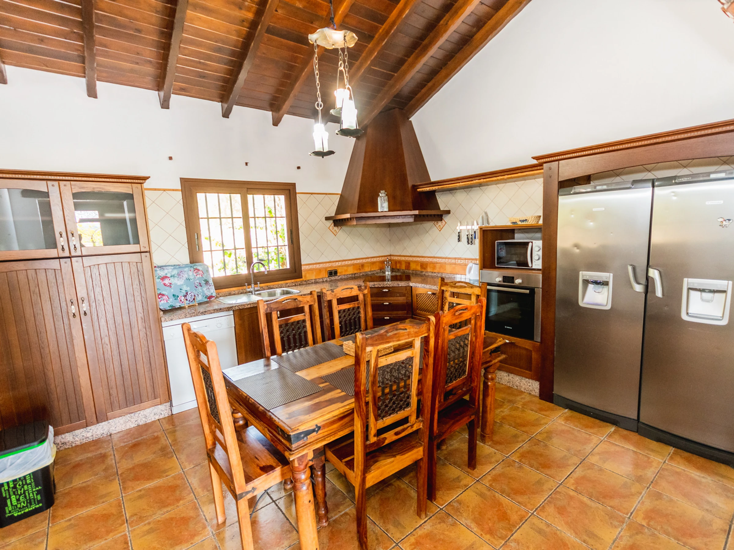 L'intérieur est conçu pour votre confort, avec une cuisine indépendante entièrement équipée qui comprend une plaque vitrocéramique, un réfrigérateur, un micro-ondes, un four, un congélateur, un lave-linge, un lave-vaisselle et de petits appareils électroménagers comme une cafetière et un grille-pain. Le salon-salle à manger est accueillant, parfait pour partager des moments en groupe. De plus, il y a deux salles de bains avec baignoire, une salle de bains avec douche et un toilette supplémentaire, pour assurer que le séjour soit confortable et pratique.