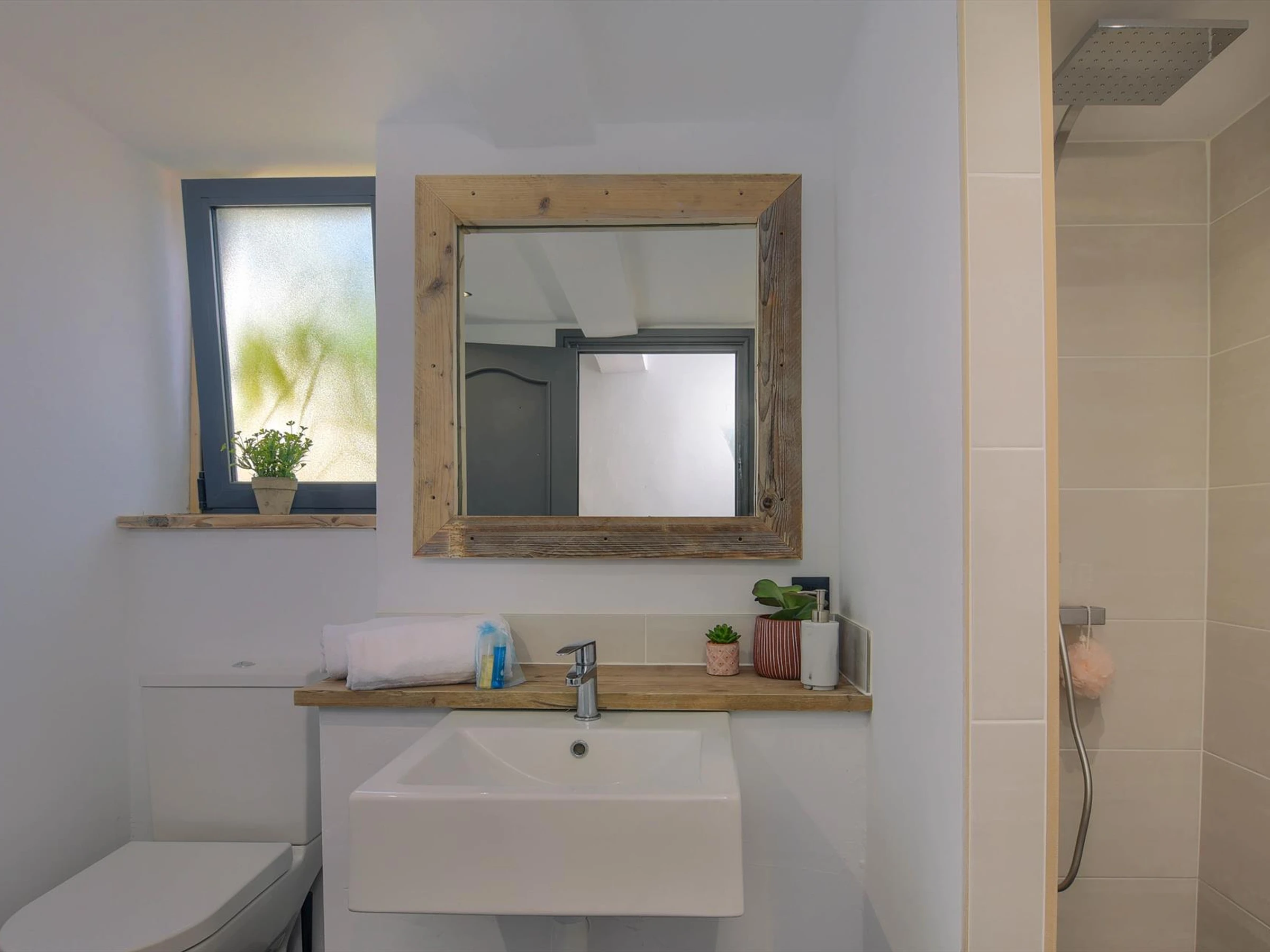 * salle de bain en suite avec lavabo simple, douche et toiletteExtérieur de
