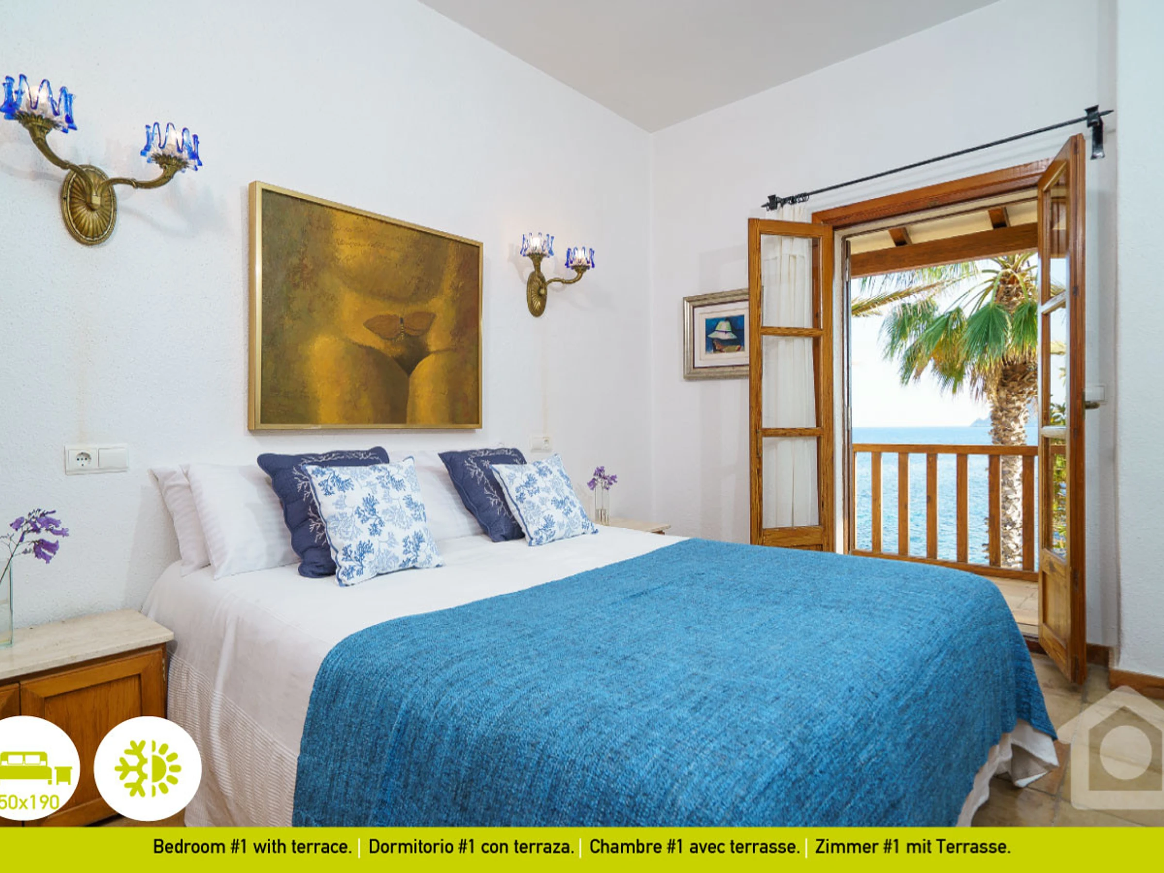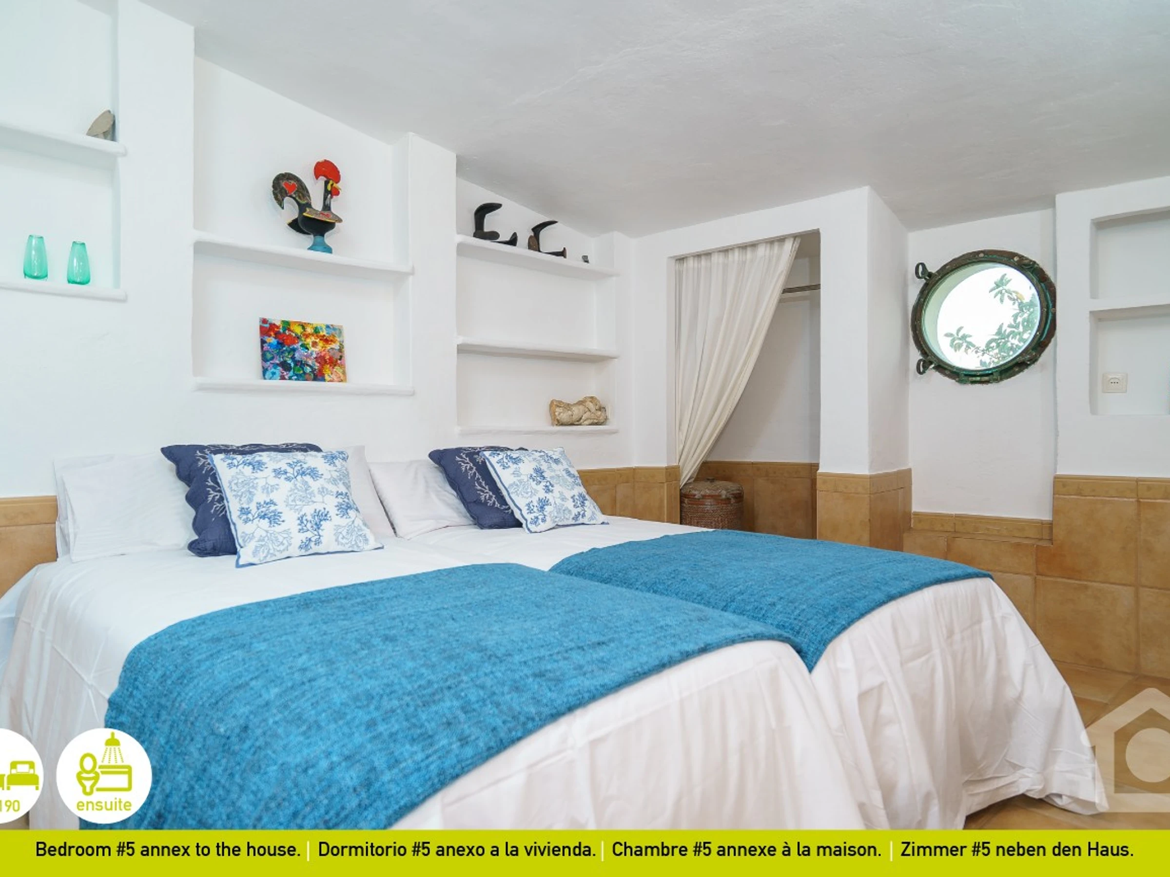 La maison principale se divise en 2 étages reliés par un escalier intérieur. À l’étage supérieur se trouvent 3 chambres doubles, toute équipées avec air-conditionné (deux d’entre elles avec lit double et la troisième avec 2 lits individuels) et une salle de bain avec baignoire. Les 3 chambres offrent toutes de magnifiques vues panoramiques sur la mer et les deux chambres doubles disposent chacune d’un agréable balcon. À l’étage inférieur se trouve la chambre numéro 4, également équipée avec air-conditionné et sa salle de bains avec douche est attenante. La cinquième chambre offre aussi l´air-conditionné et salle de douche en suite, elle est située dans un édifice annexe à la maison et dispose de son propre accès indépendant.