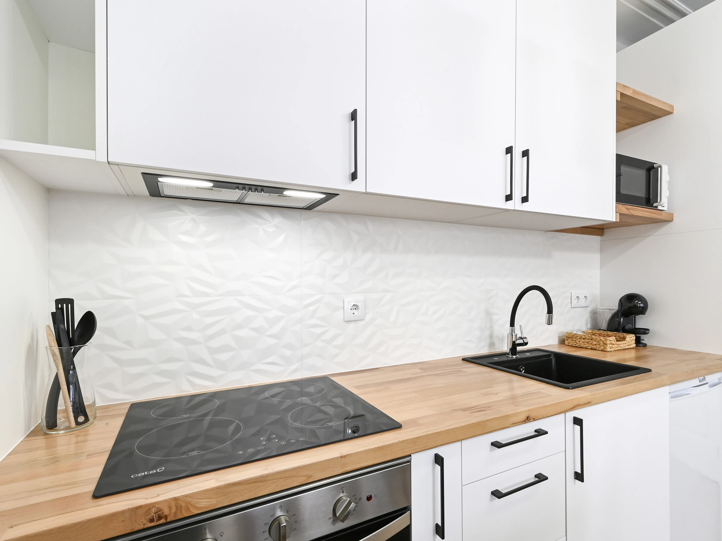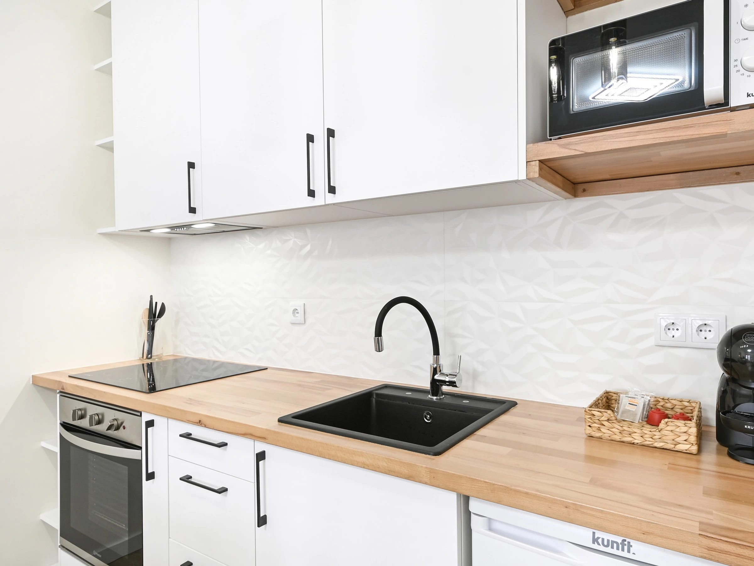 La cuisine américaine, est équipée avec réfrigérateur, micro-ondes, four, congélateur, vaisselle/couverts, ustensiles/cuisine, cafetière, grille pain et bouilloire.