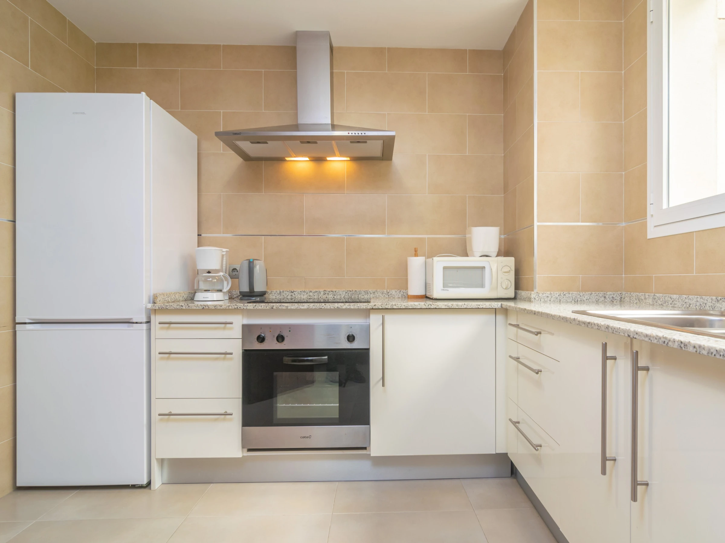 La cuisine, est équipée avec micro-ondes, congélateur, cafetière et grille pain.