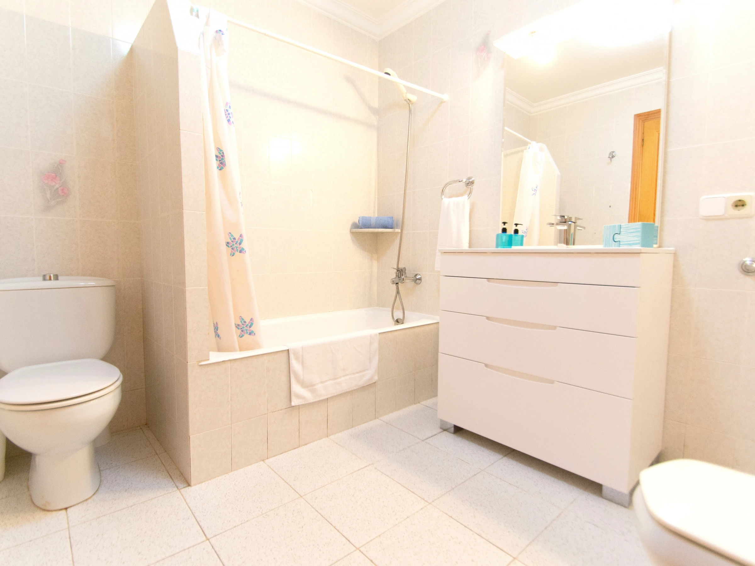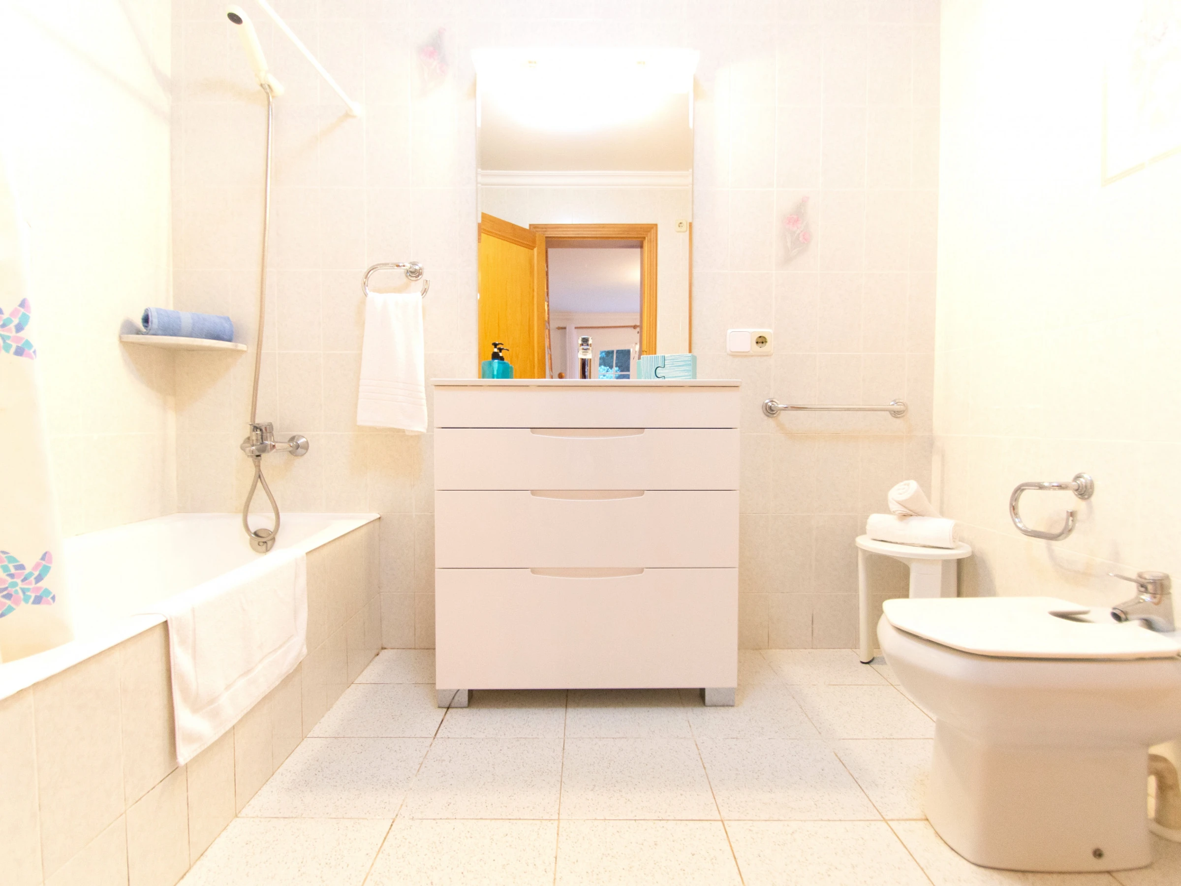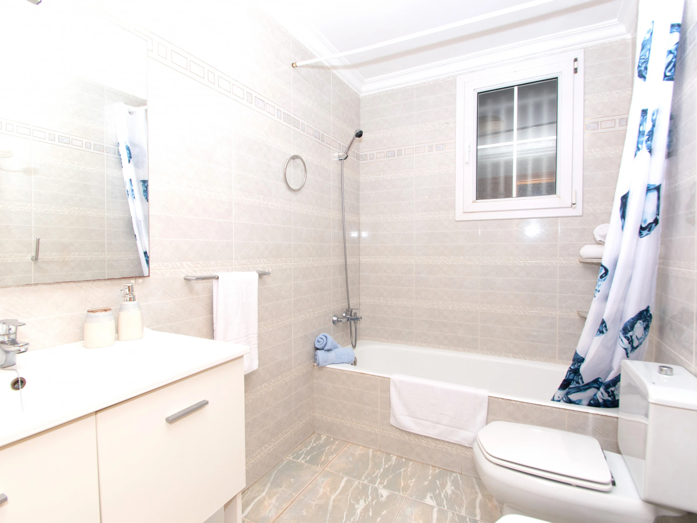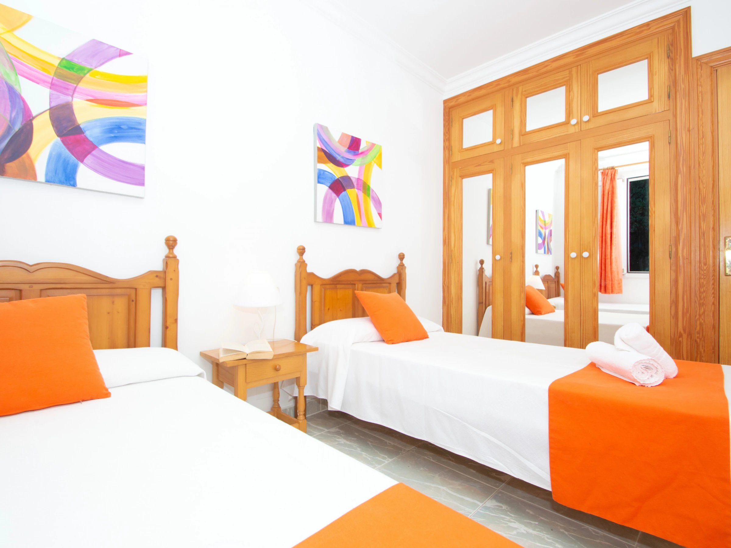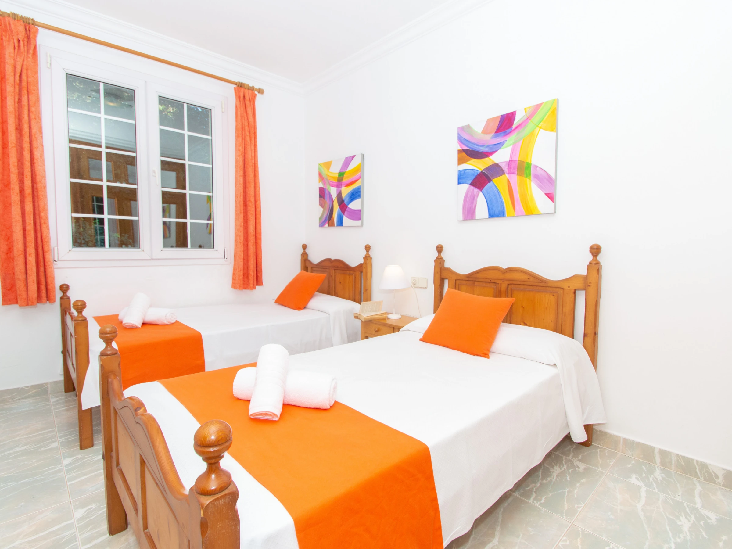 La villa en location à Minorque est répartie sur deux niveaux. Au premier étage se trouve la chambre principale avec lit double, climatisation et grande armoire encastrée. Sur ce même étage se trouvent deux autres chambres doubles, également climatisées : l’une avec deux lits simples et l’autre avec un lit double et un accès à la terrasse. Toutes les chambres disposent d’armoires encastrées et partagent une salle de bains complète équipée d’une baignoire et d’un sèche-cheveux.