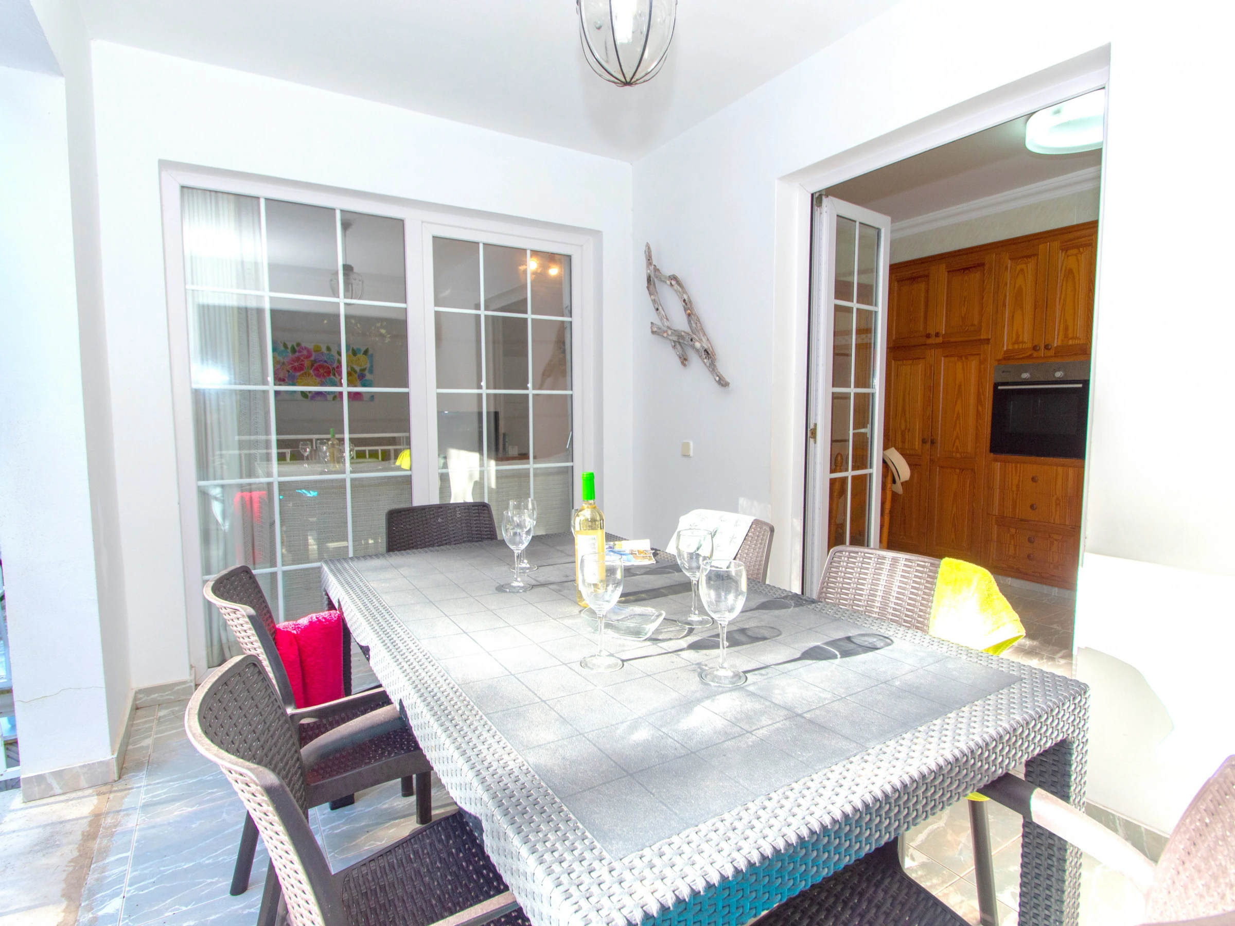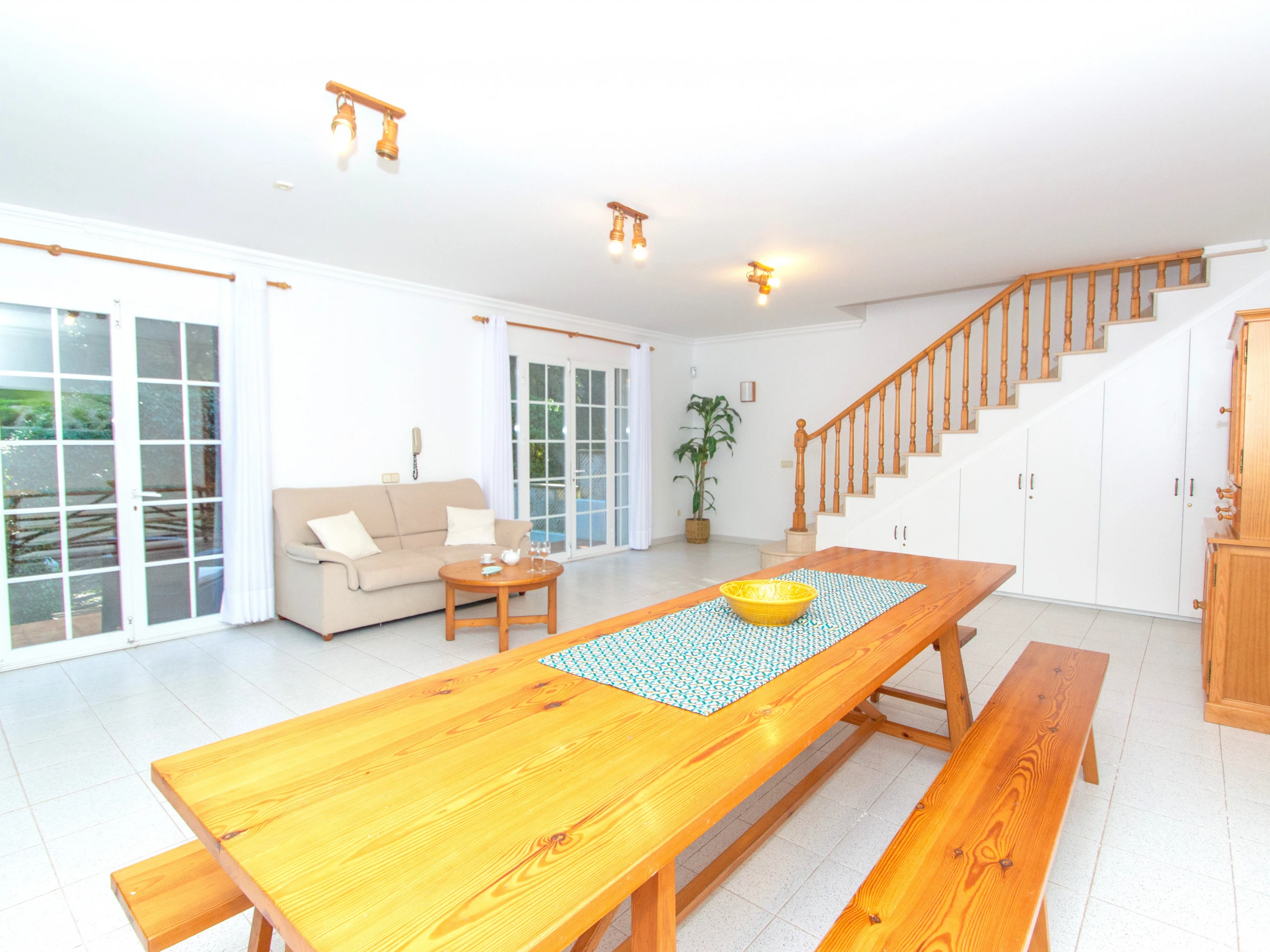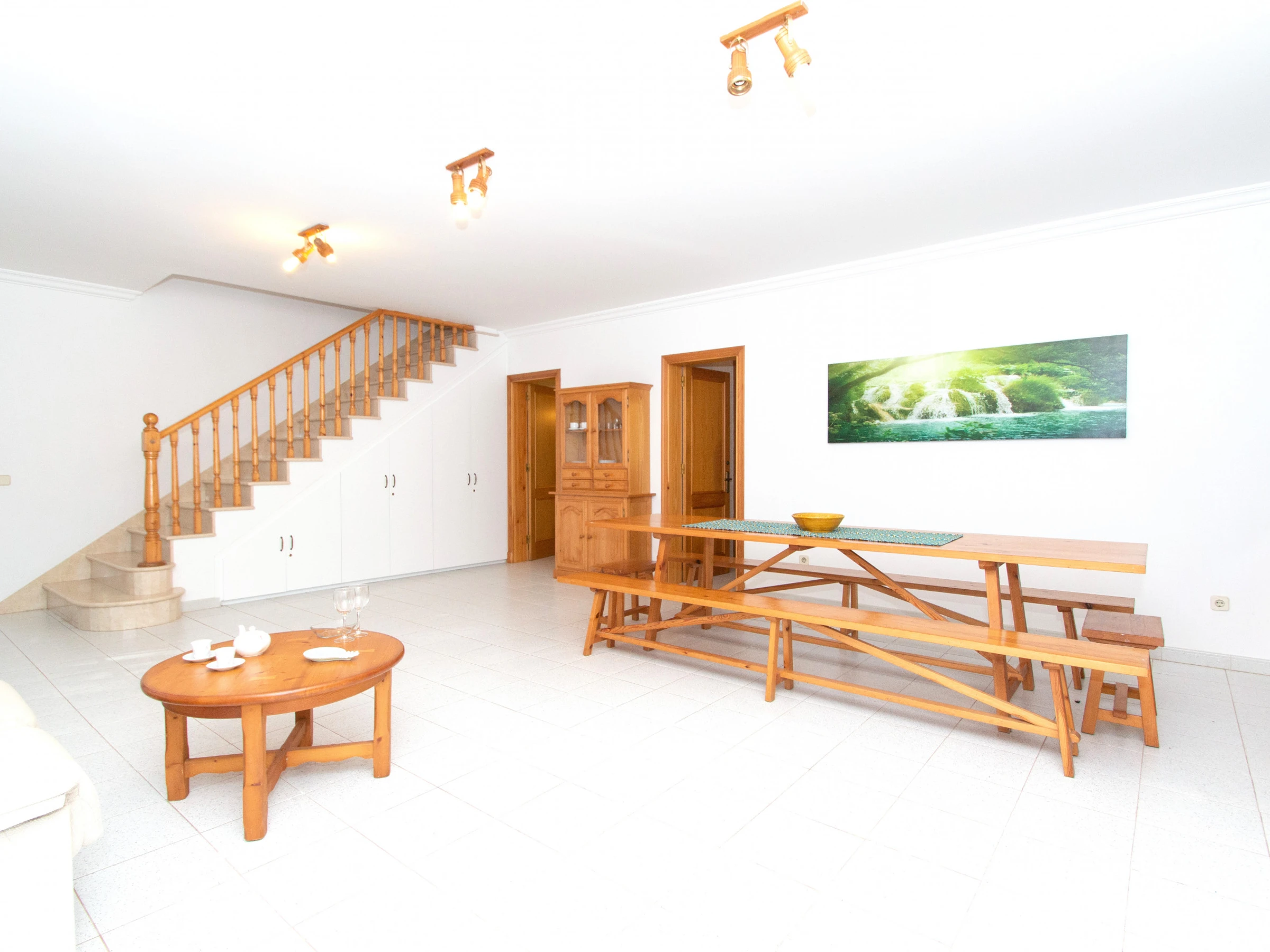 Au rez-de-chaussée se trouve une autre chambre double avec lit double et armoire. À ce niveau se trouve également une salle de bains complète avec baignoire. Dans ce même espace se trouve une grande salle à manger climatisée, idéale pour les barbecues, équipée d’une table typiquement minorquine pour partager les repas en famille.