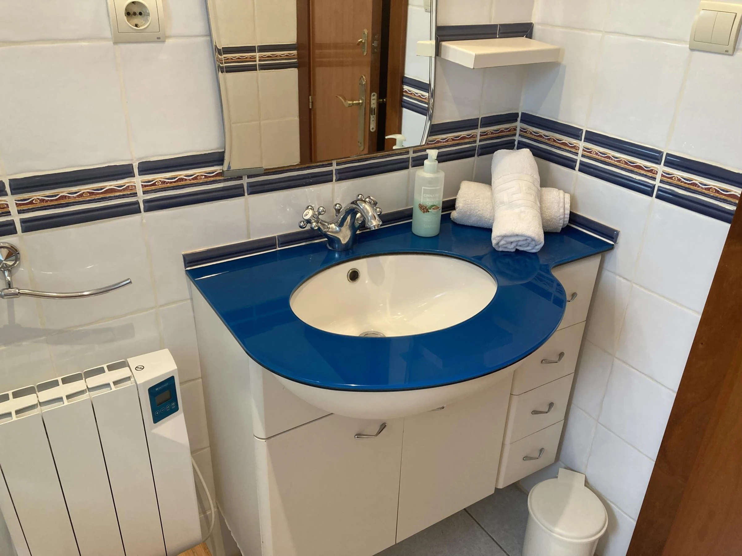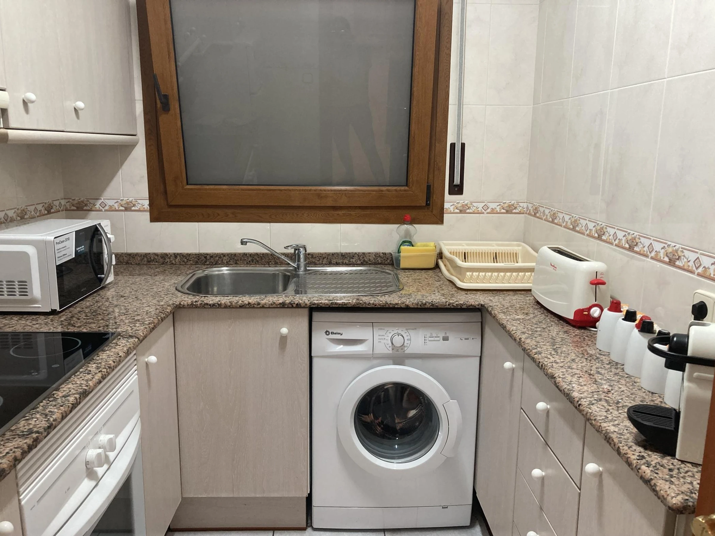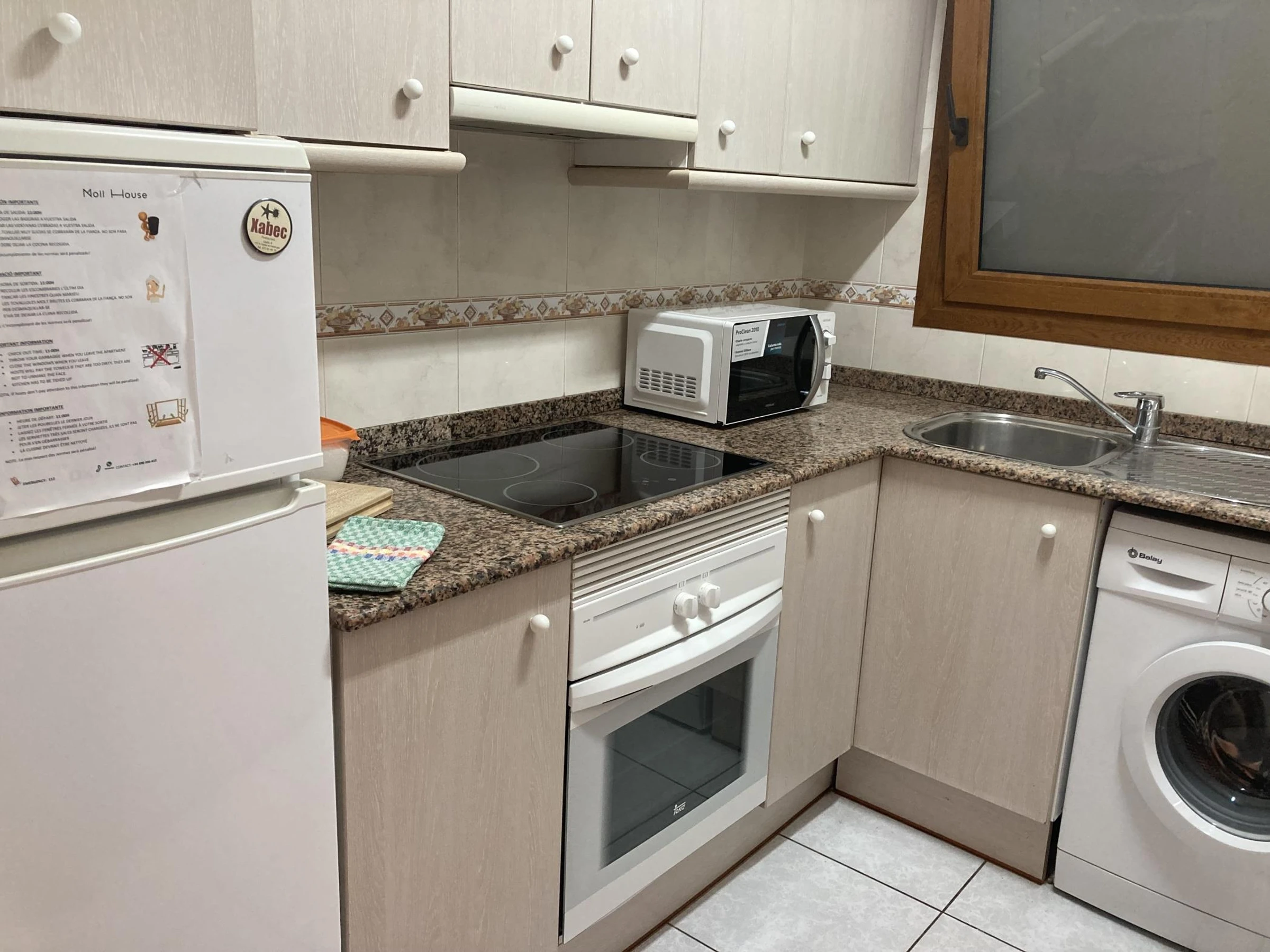 Le salon est un espace partagé avec la salle à manger, il y a des canapés, une télévision et une table avec des chaises pour manger. La cheminée ne fonctionne pas. Depuis le salon, vous pouvez accéder à la terrasse avec vue sur la mer. La cuisine est entièrement équipée avec four, réfrigérateur, micro-ondes, machine à café Nespresso et ustensiles de cuisine. Nous avons installé des ventilateurs de plafond dans les 4 pièces pour offrir un meilleur confort dans tout l'appartement.