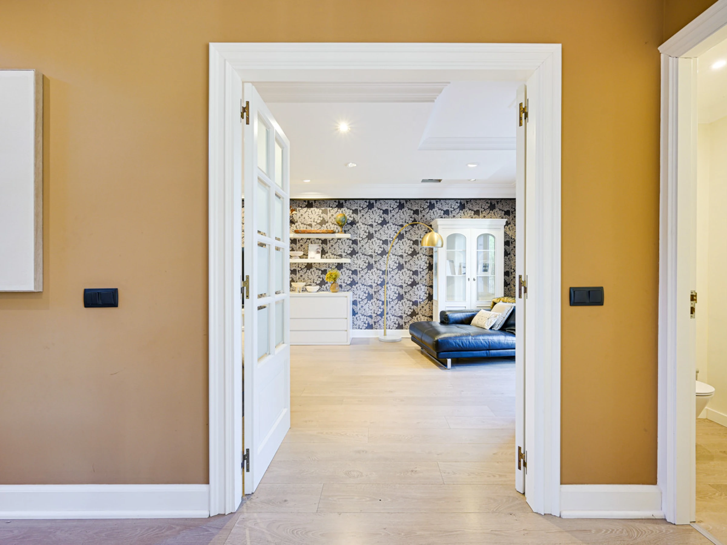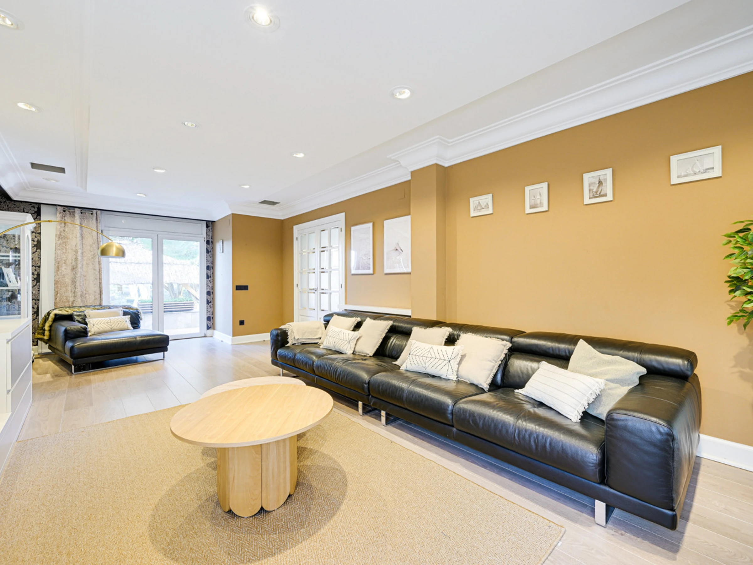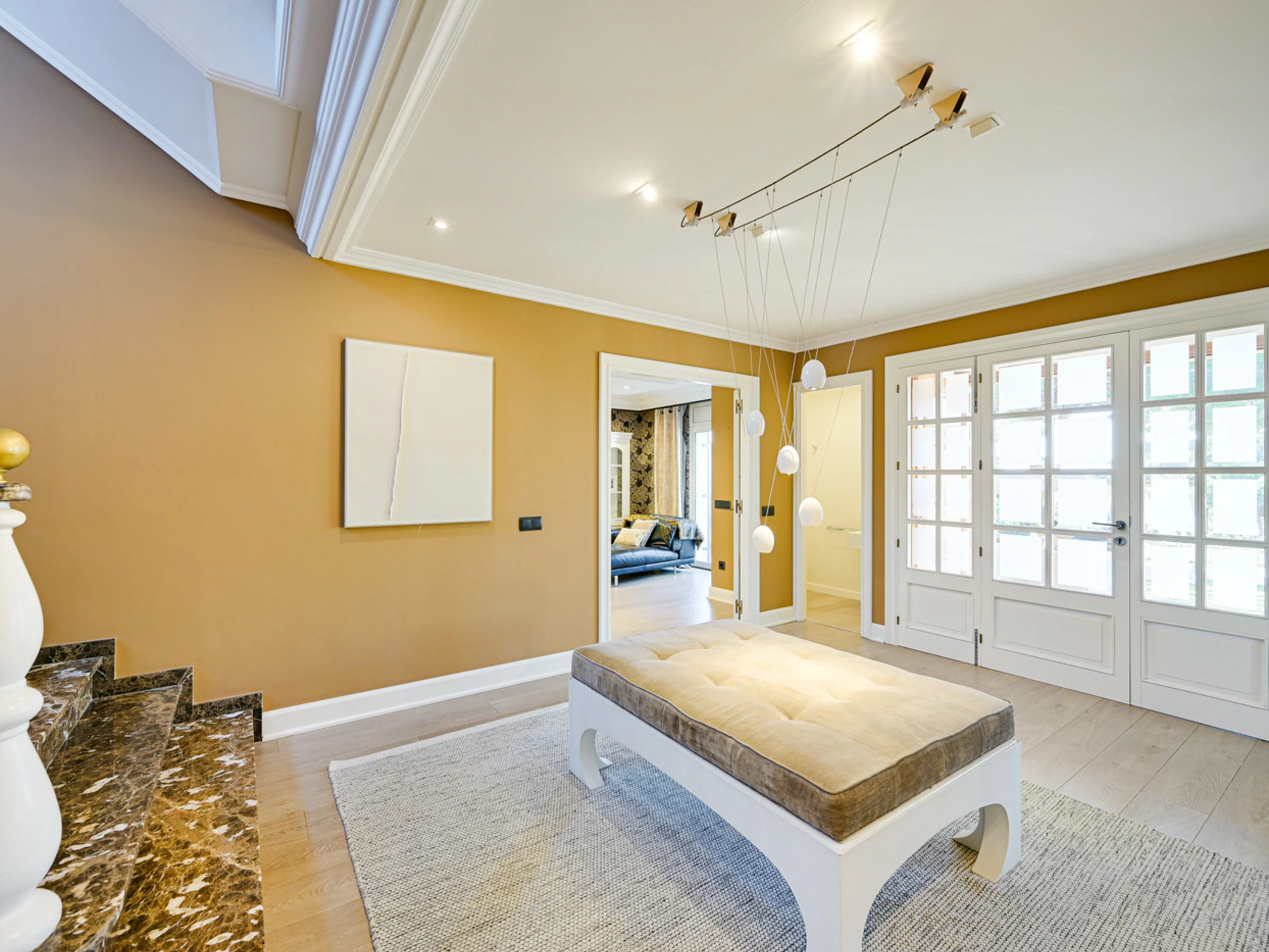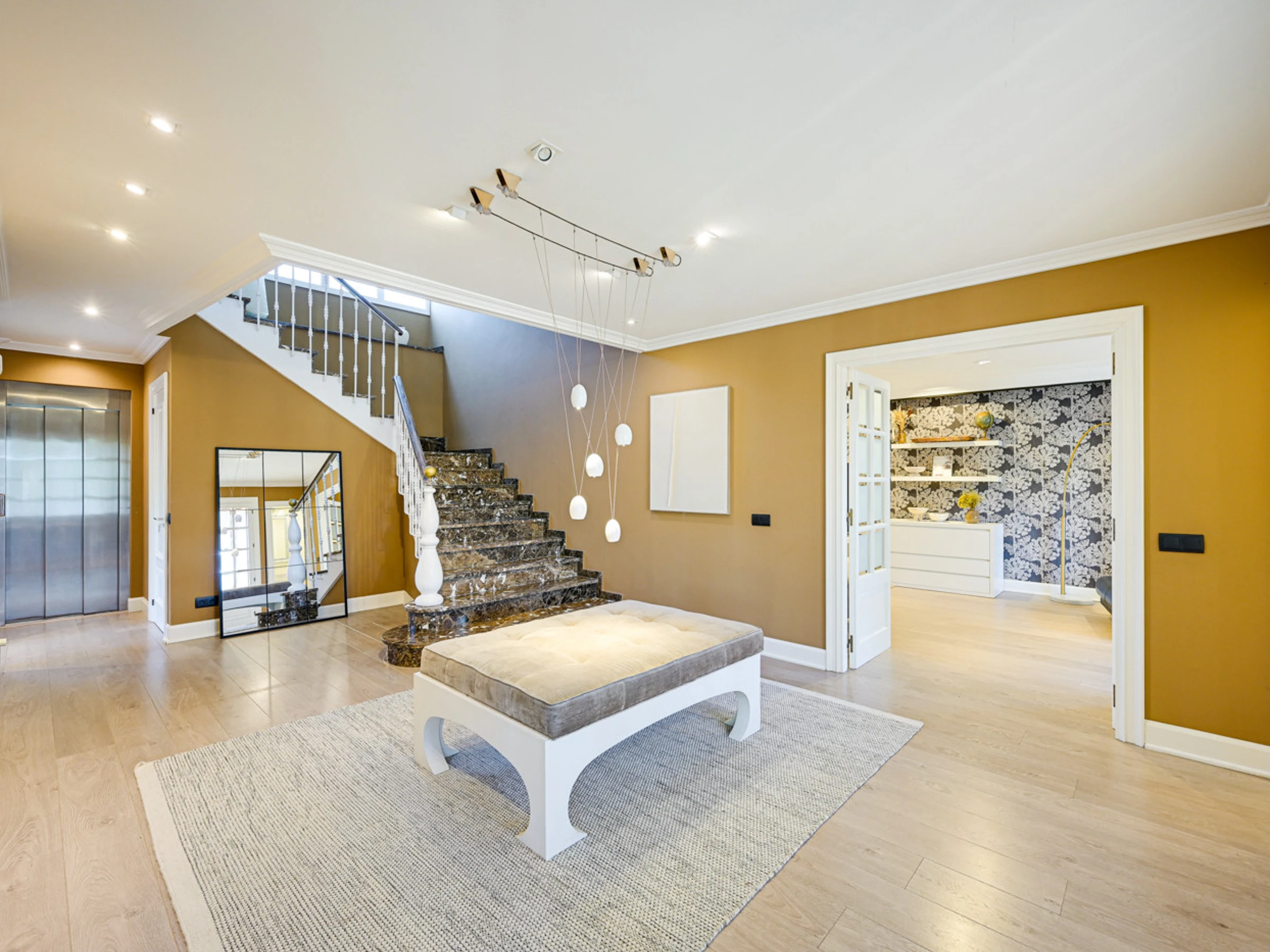 Un niveau plus haut se situe l’espace de vie principal, accessible par un hall d’entrée spacieux.
