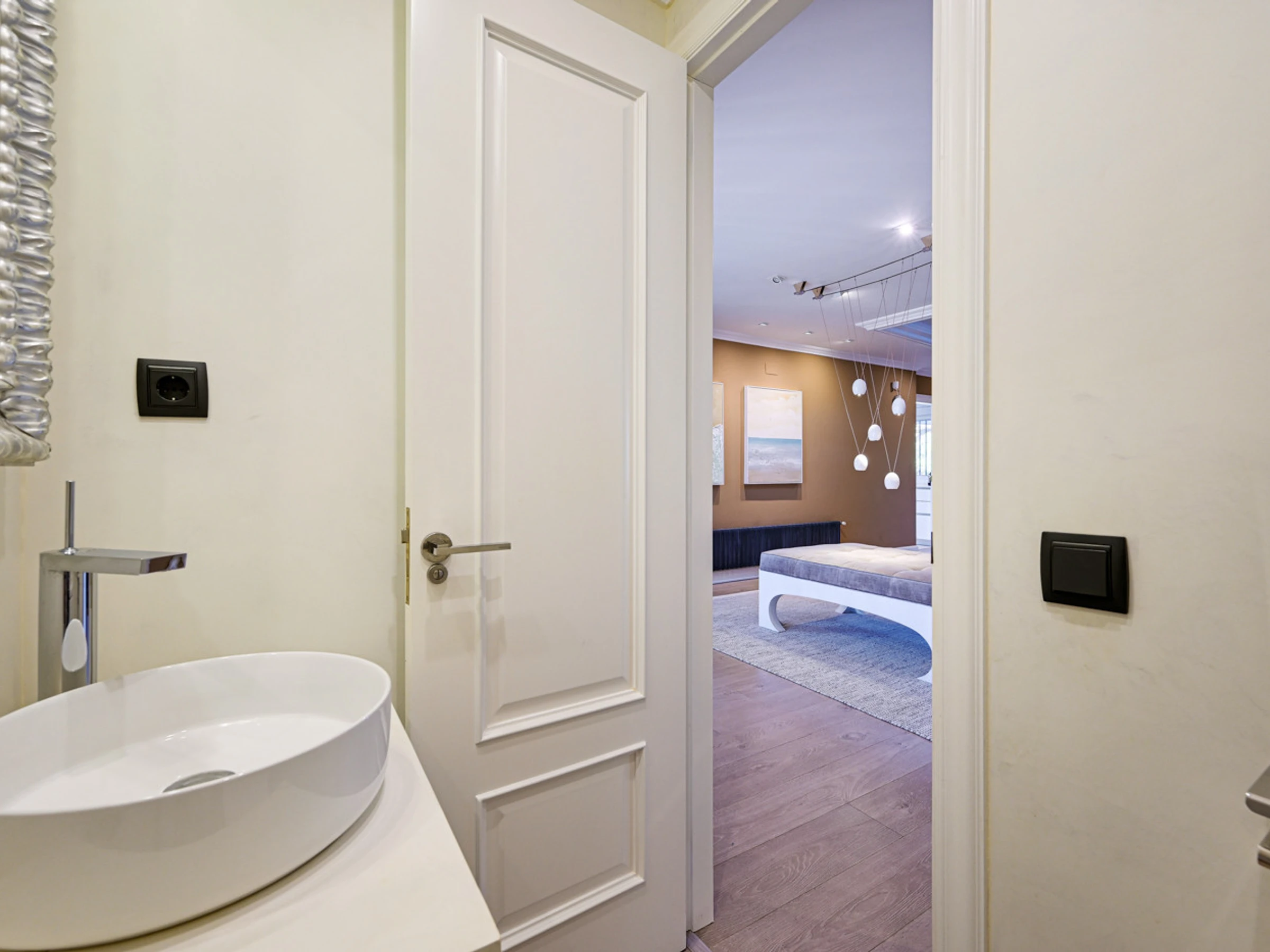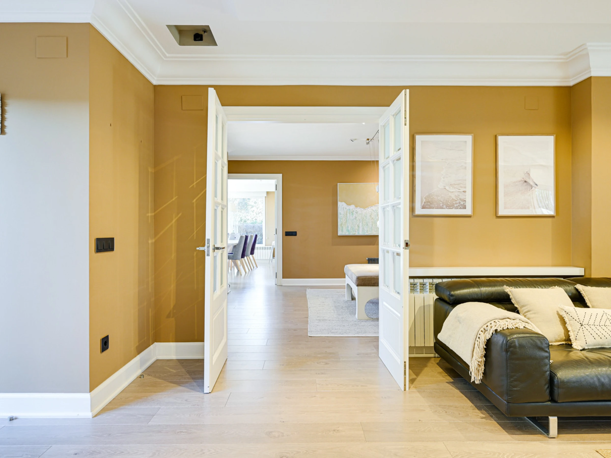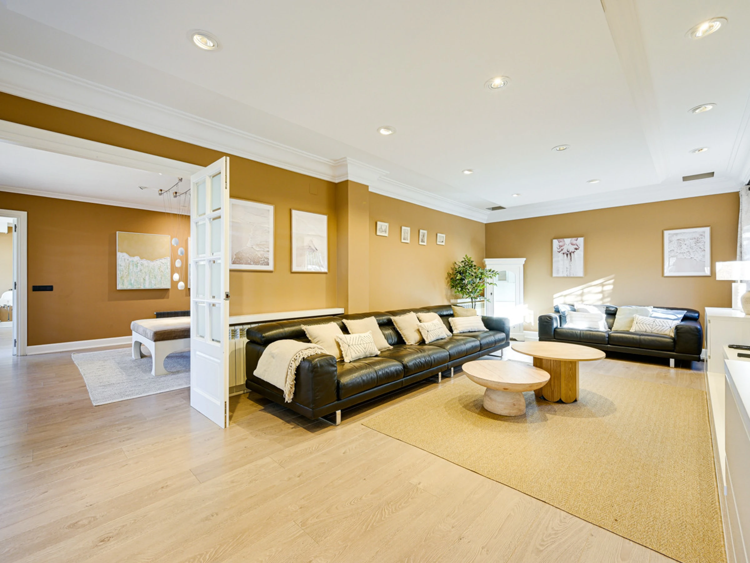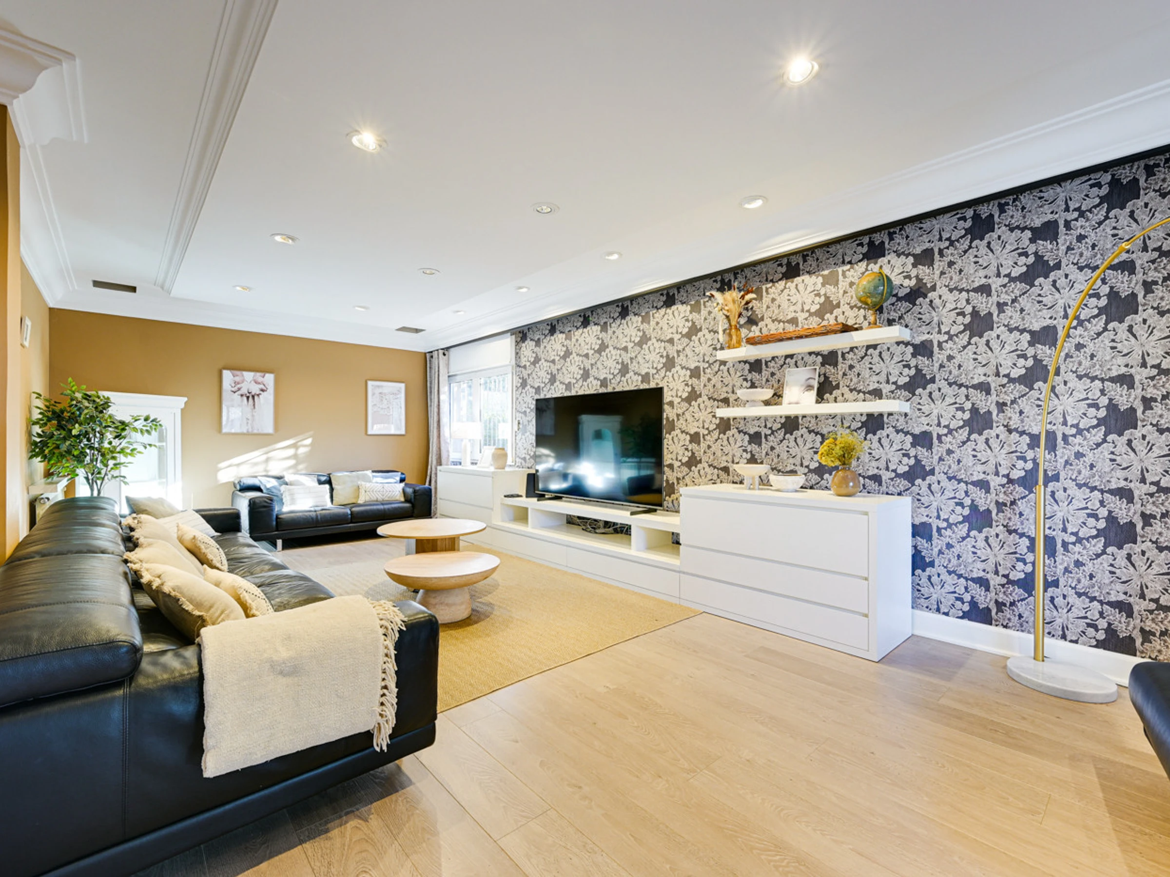 Un niveau plus haut se situe l’espace de vie principal, accessible par un hall d’entrée spacieux.