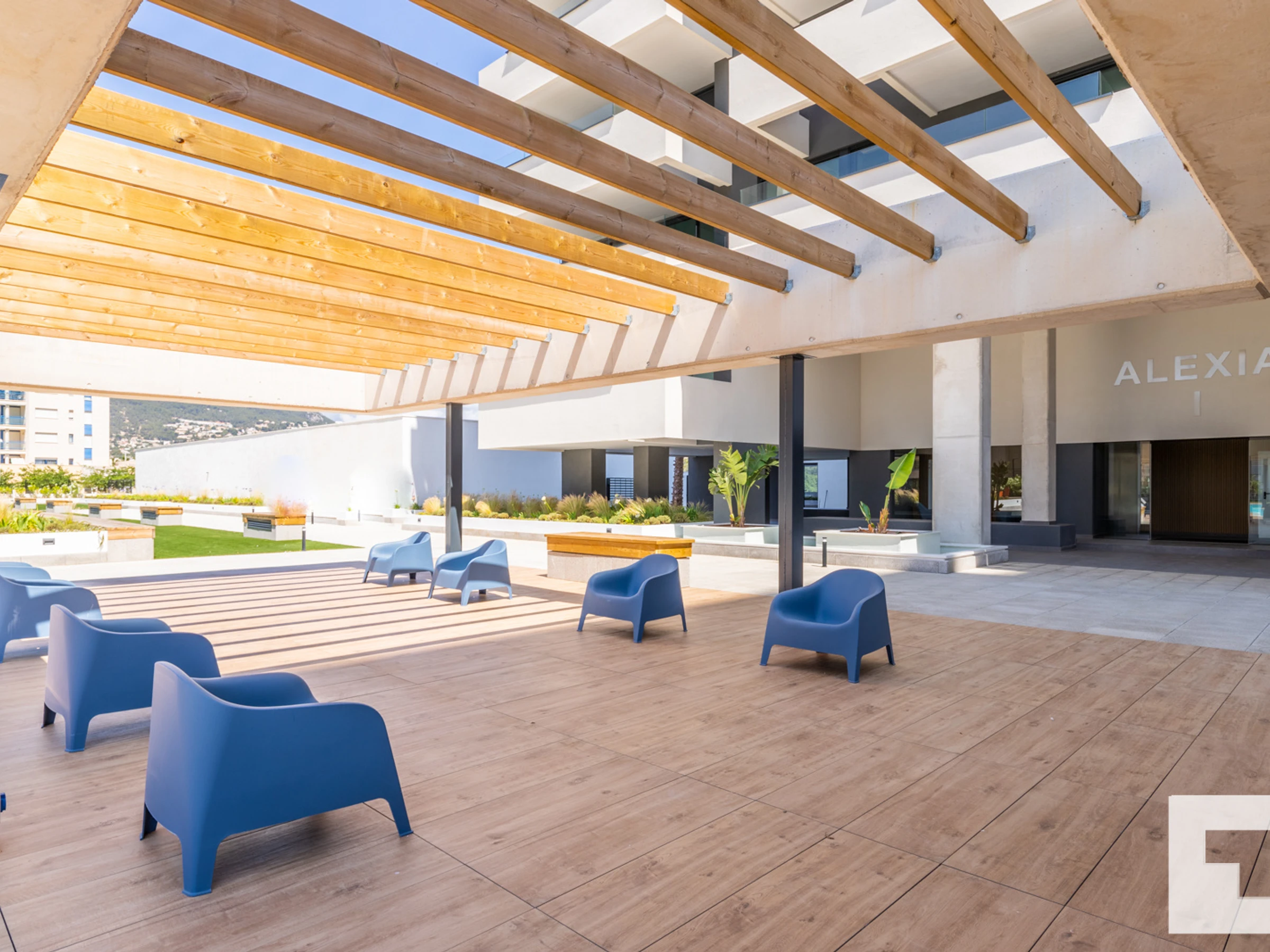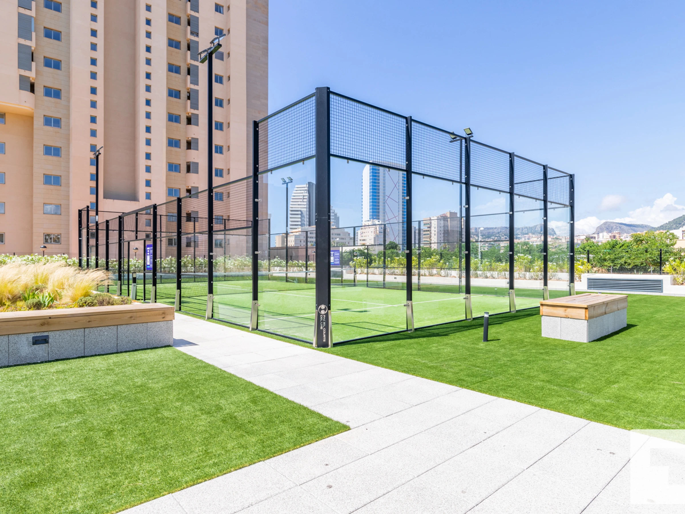 une piscine commune, une aire de jeux pour les plus petits et un court de padel