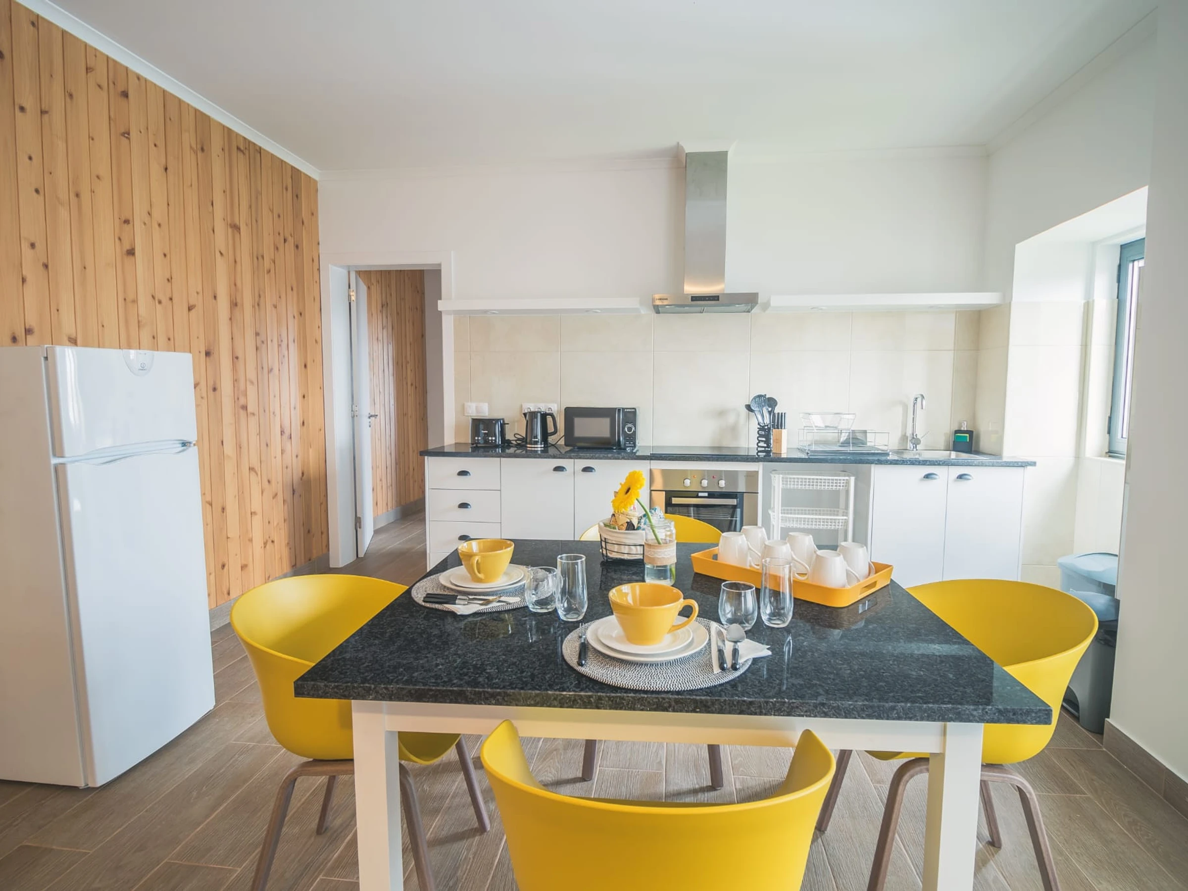 La cuisine, est équipée avec réfrigérateur, micro-ondes, four, congélateur, vaisselle/couverts, ustensiles/cuisine, grille pain et bouilloire.