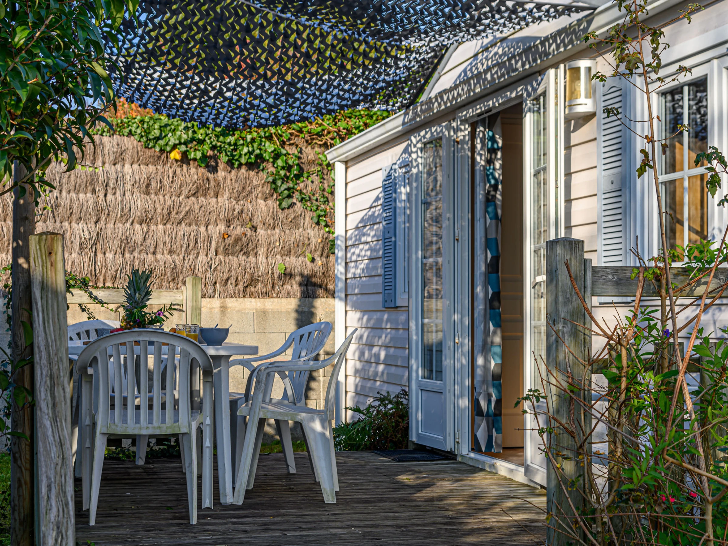 "La Spatule", 3 pièces mobil home 36 m2. Aménagement confortable: séjour/salle à manger avec TV. Sortie sur la terrasse. 1 chambre avec 1 lit double (140 cm, longueur 190 cm). 1 chambre avec 2 lits (80 cm, longueur 190 cm). Coin cuisine (4 plaques de cuisson, grille-pain, bouilloire électrique, micro-ondes, cafetière électrique). Douche, WC séparé. Terrasse 5 m2. Meubles de terrasse. A disposition: sèche-cheveux. Internet (Connexion WIFI, gratuit). Place de parking. Veuillez noter: maximum 1 animal/ chien autorisé. Détecteur de fumée. Annonce d'un professionnel (art 155, IV du CGI)