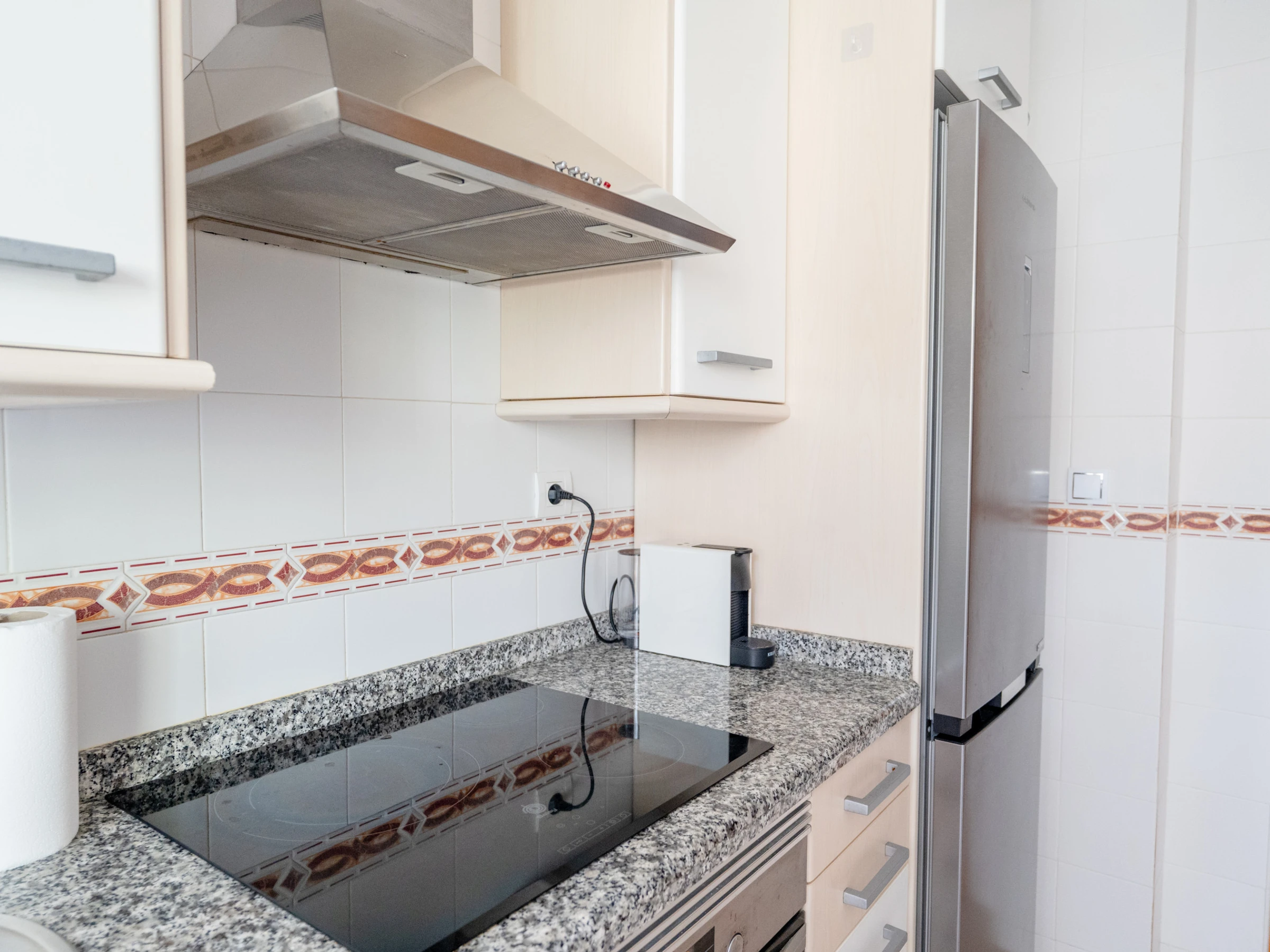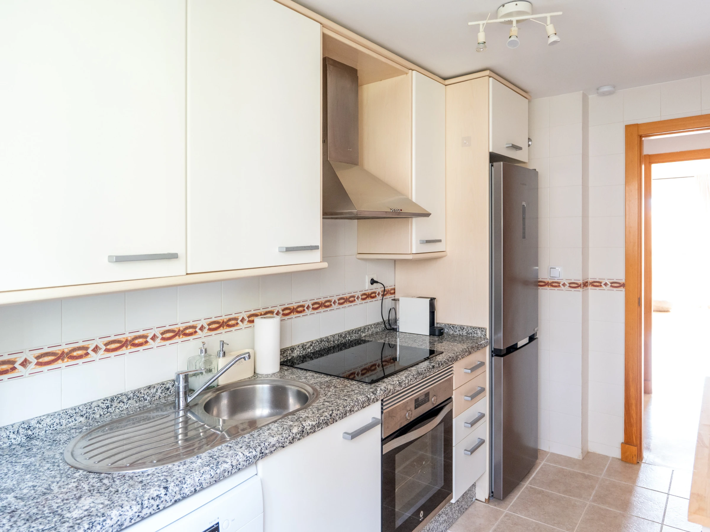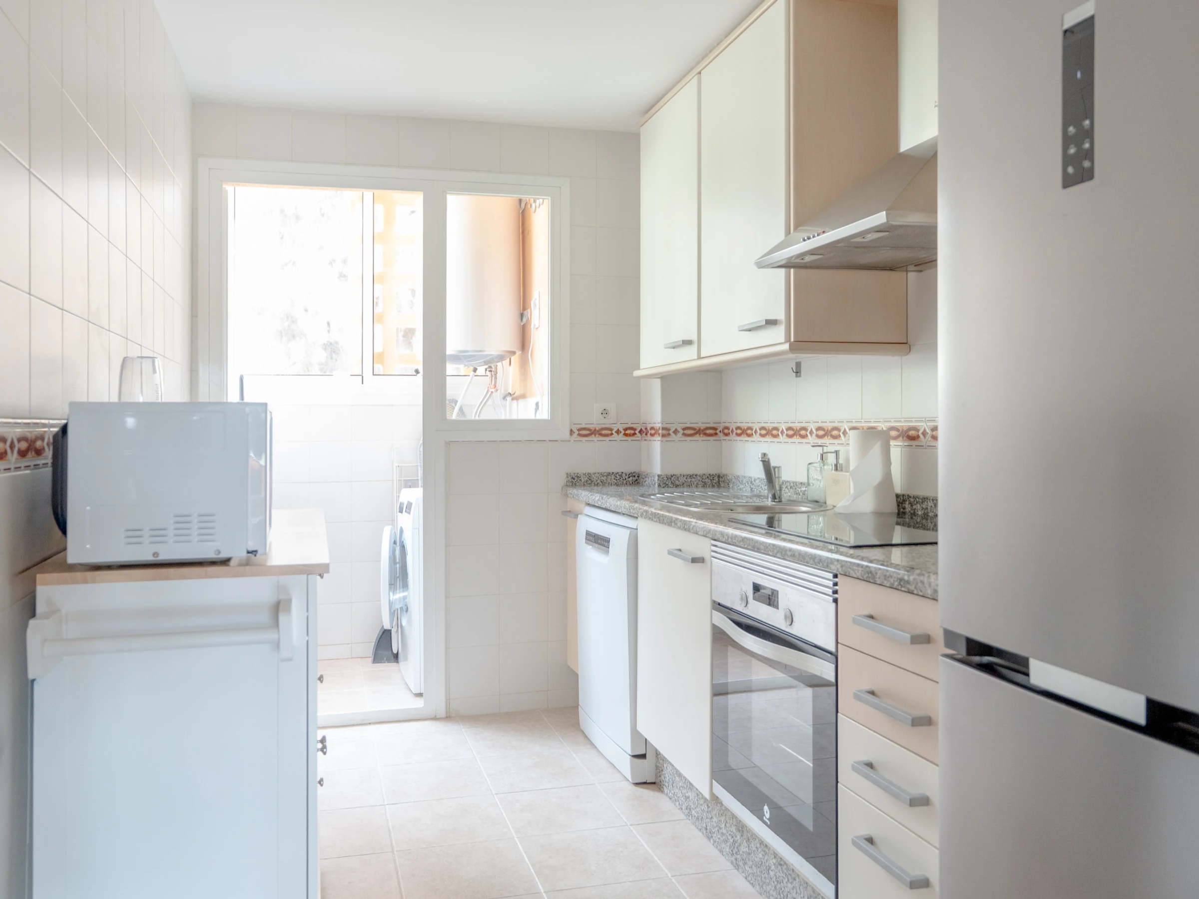 La cuisine indépendante, à vitrocéramique, est équipée avec réfrigérateur, micro-ondes, four, congélateur, lave-vaisselle, vaisselle/couverts, ustensiles/cuisine, cafetière et grille pain.