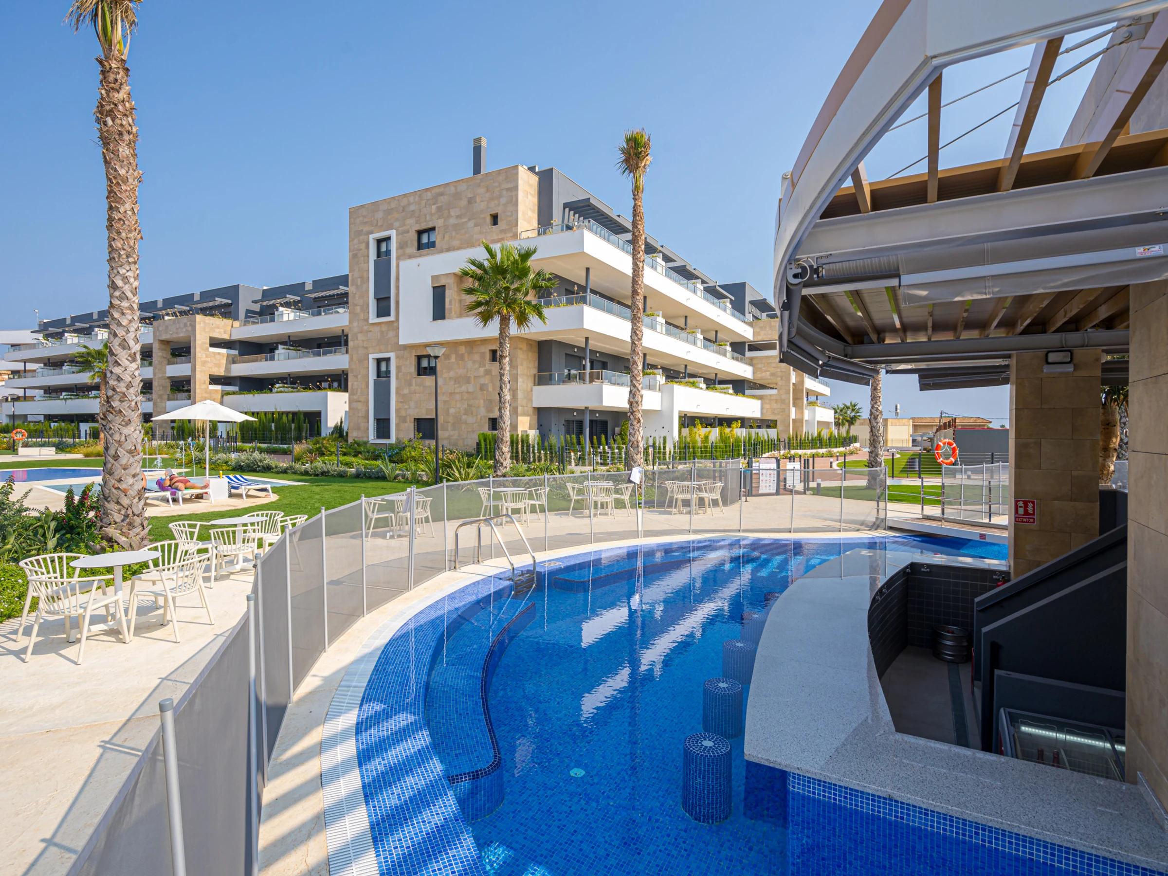 Elle dispose de ascenseur, mobilier de jardin, 25 m² de terrasse, lave-linge, fer à repasser, accès internet (wifi), sèche-cheveux, zone pour les enfants, salle de sport, spa, chauffage central, climatisation dans tout le logement, piscine collective, piscine chauffée collective, parking couvert même bâtiment, 1 Télévision, tv satellite (Langues: Espagnol).