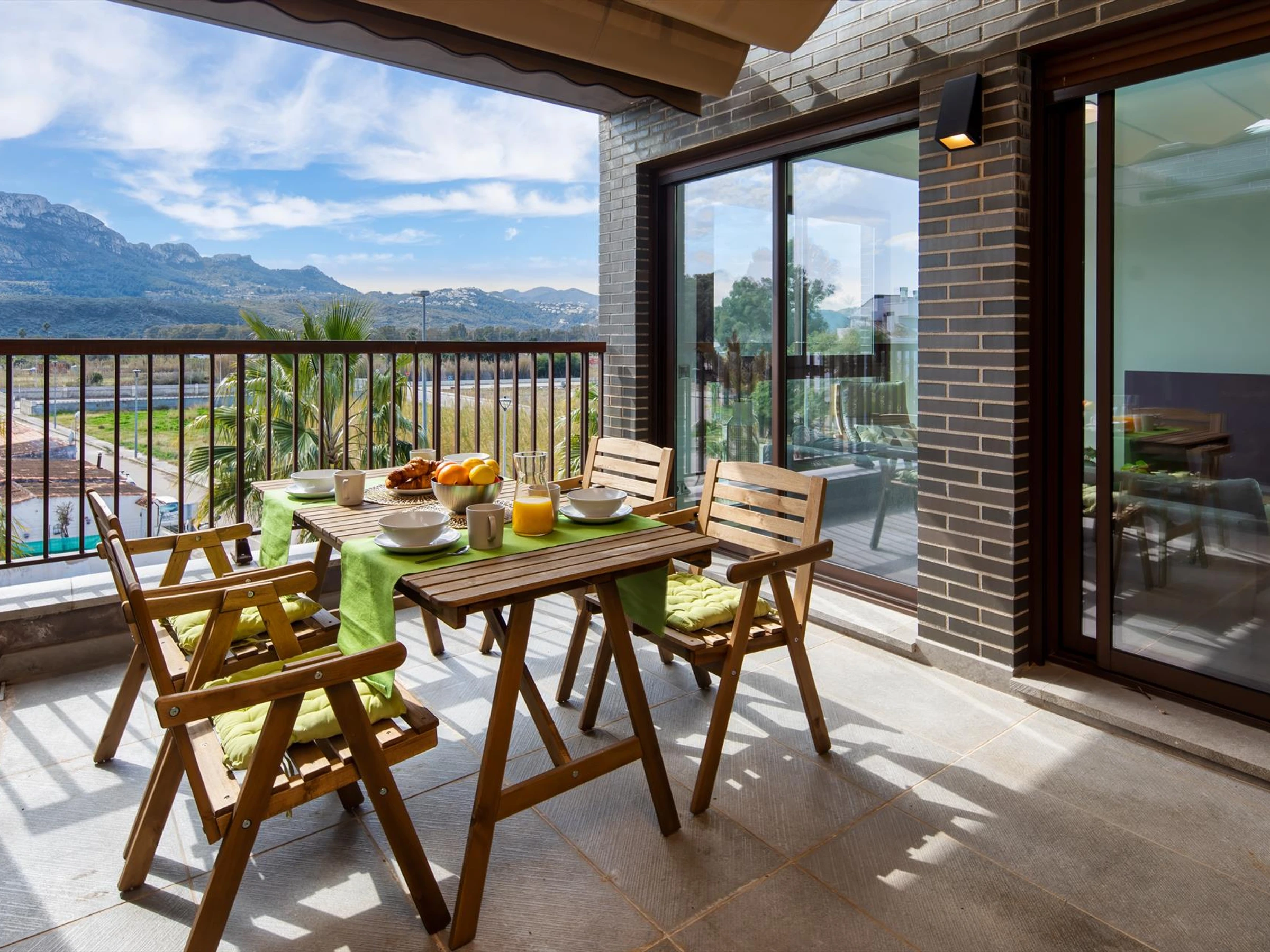 * Grande terrasse avec coin repas, avec auvent pliant et vue magnifique sur