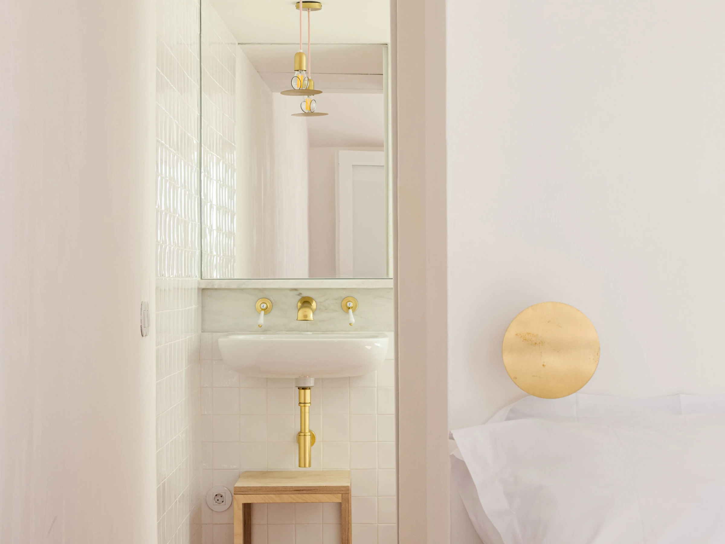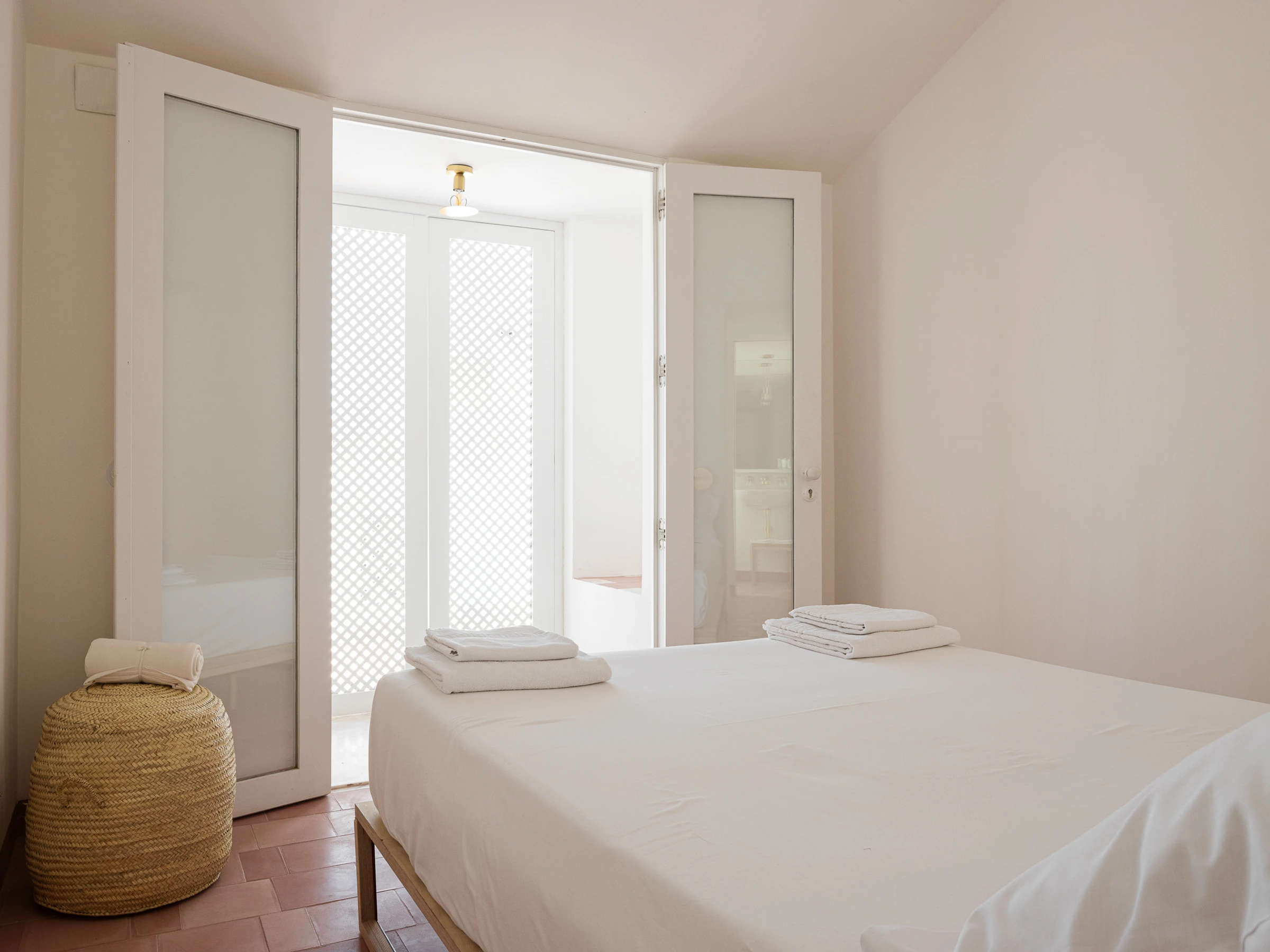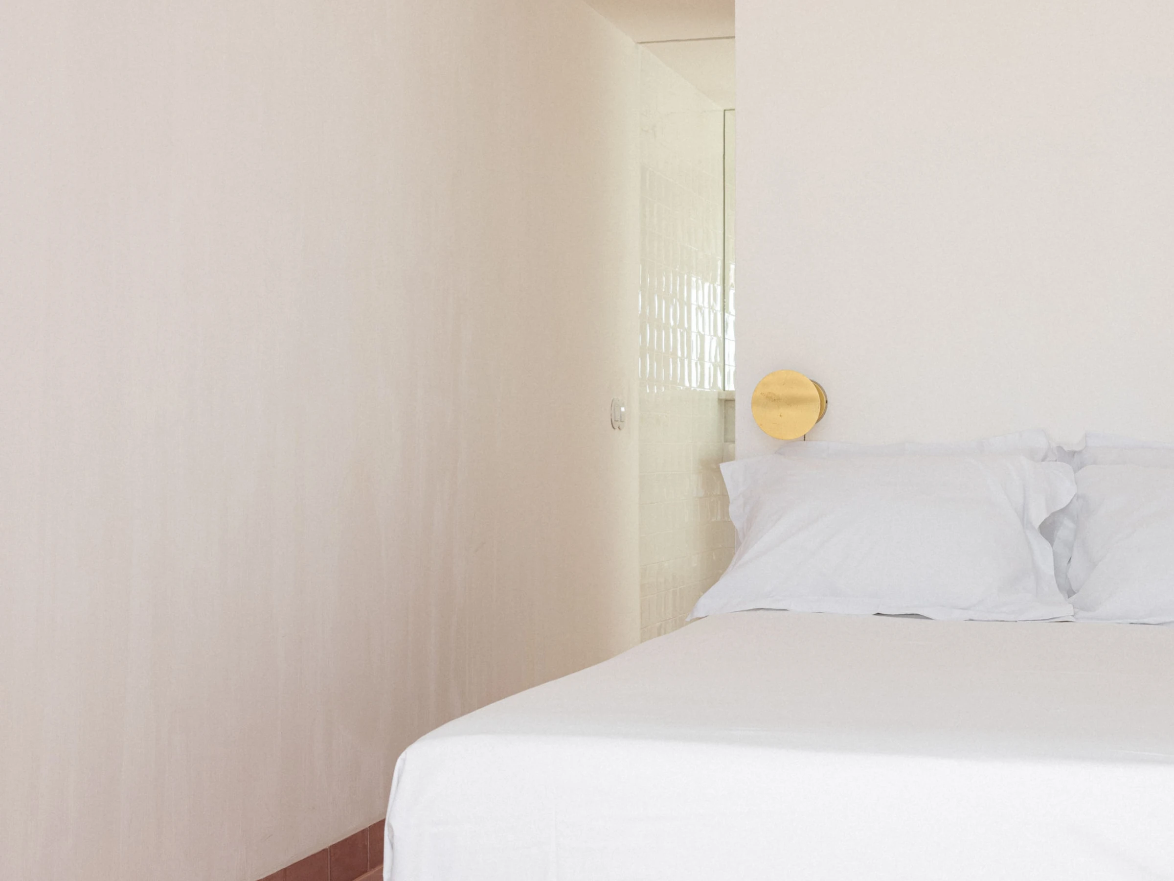 Situé au premier étage (accessible uniquement par des escaliers), ce T2 présente deux chambres avec un design élégant et fonctionnel, où le blanc et les tons de terre cuite créent une ambiance sereine. Chaque chambre dispose d'une salle de bain privative, soigneusement séparée par un mur en retrait, garantissant intimité et confort. L'éclairage naturel, les finitions en laiton et les matériaux nobles renforcent le soin esthétique de l'ensemble de l'espace. La cuisine, dissimulée derrière des panneaux en bois et équipée de l'essentiel, se connecte à une zone de vie simple et pratique, valorisée par la luminosité naturelle de l'espace. L'appartement dispose également de la télévision avec des chaînes internationales, d'internet à haute vitesse et d'un accès à une piscine — un véritable luxe au cœur de la ville.