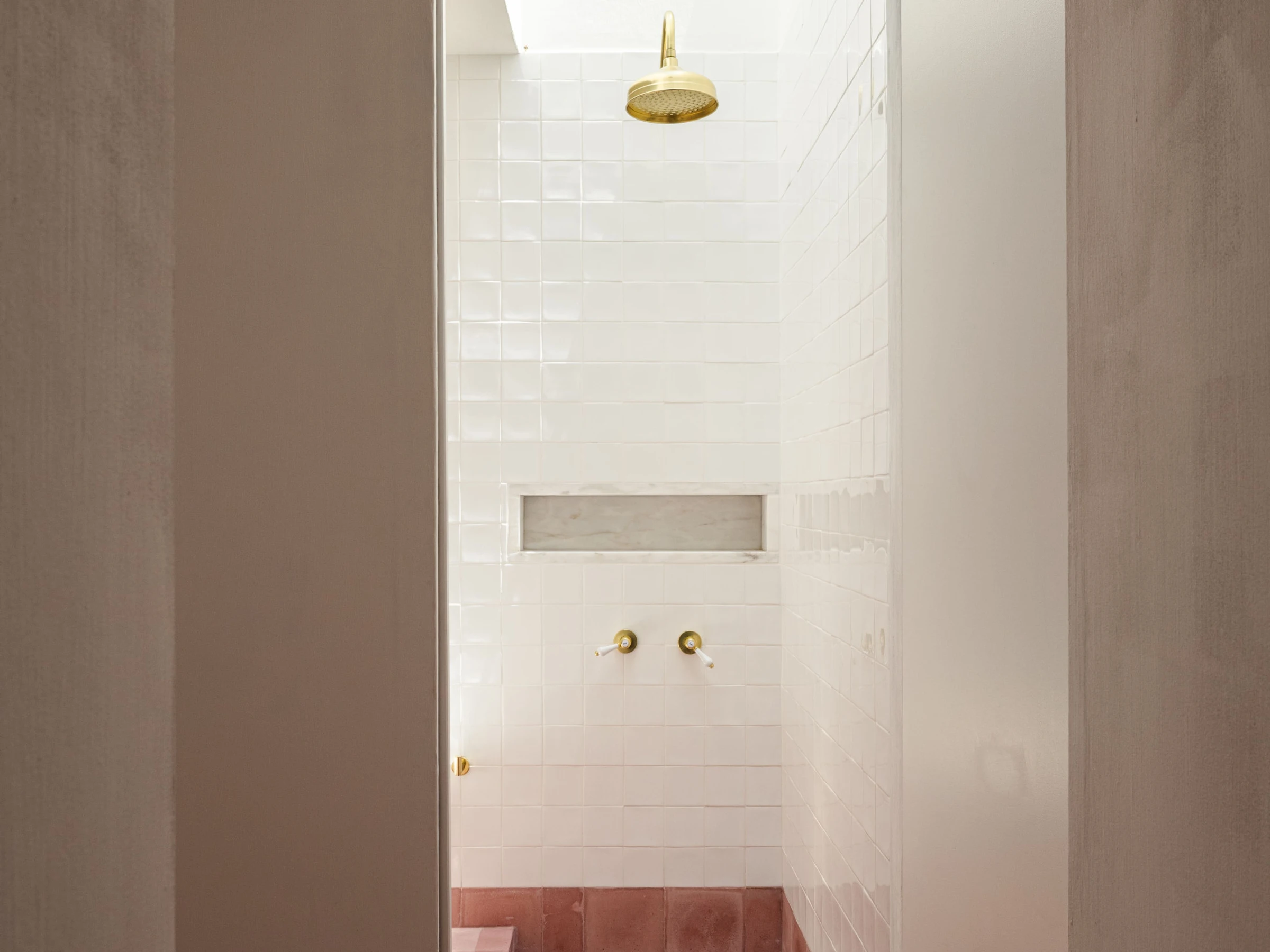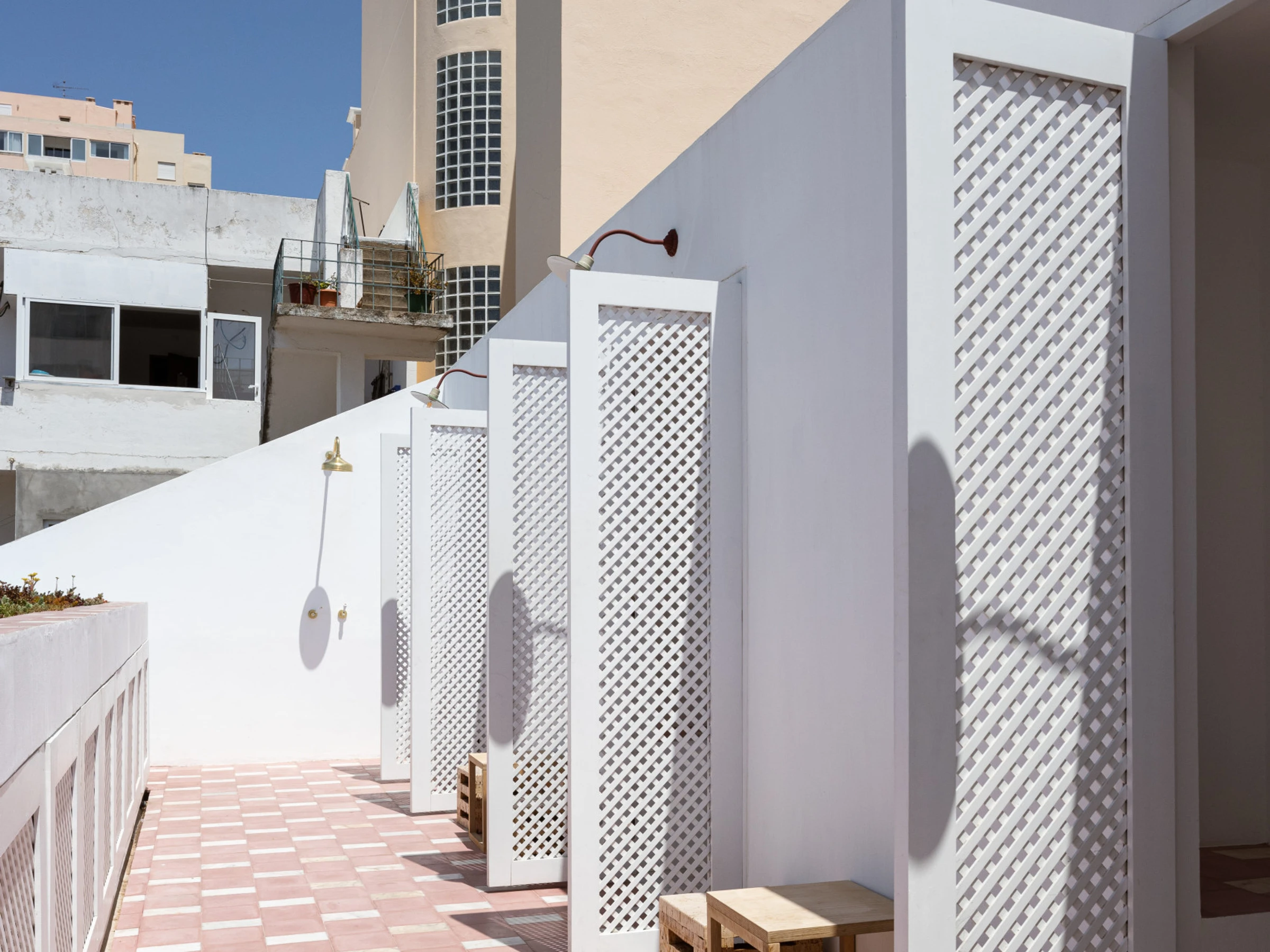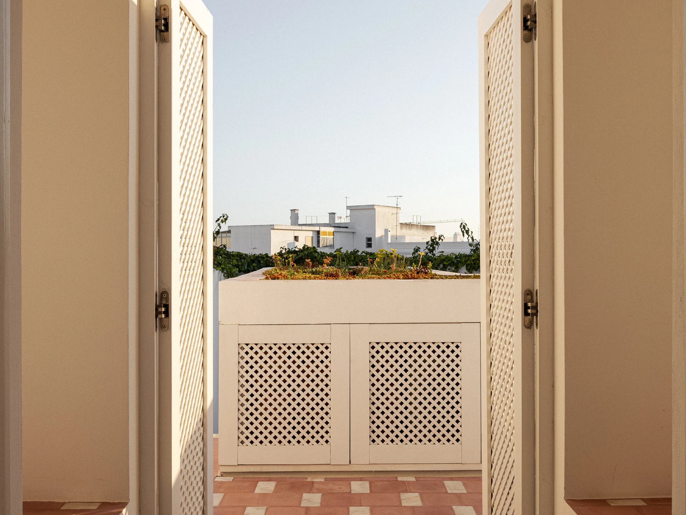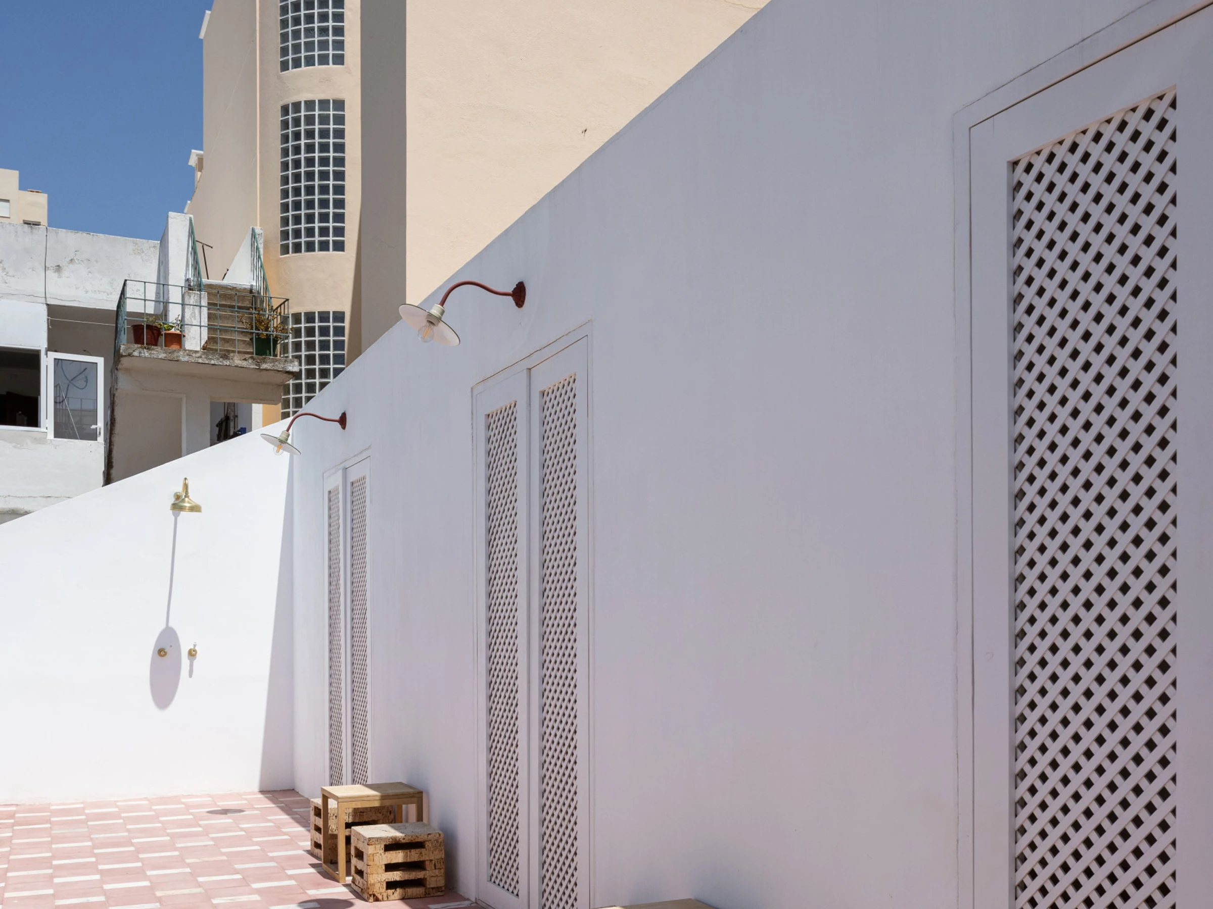 Situé au premier étage (accessible uniquement par des escaliers), ce T2 présente deux chambres avec un design élégant et fonctionnel, où le blanc et les tons de terre cuite créent une ambiance sereine. Chaque chambre dispose d'une salle de bain privative, soigneusement séparée par un mur en retrait, garantissant intimité et confort. L'éclairage naturel, les finitions en laiton et les matériaux nobles renforcent le soin esthétique de l'ensemble de l'espace. La cuisine, dissimulée derrière des panneaux en bois et équipée de l'essentiel, se connecte à une zone de vie simple et pratique, valorisée par la luminosité naturelle de l'espace. L'appartement dispose également de la télévision avec des chaînes internationales, d'internet à haute vitesse et d'un accès à une piscine — un véritable luxe au cœur de la ville.
