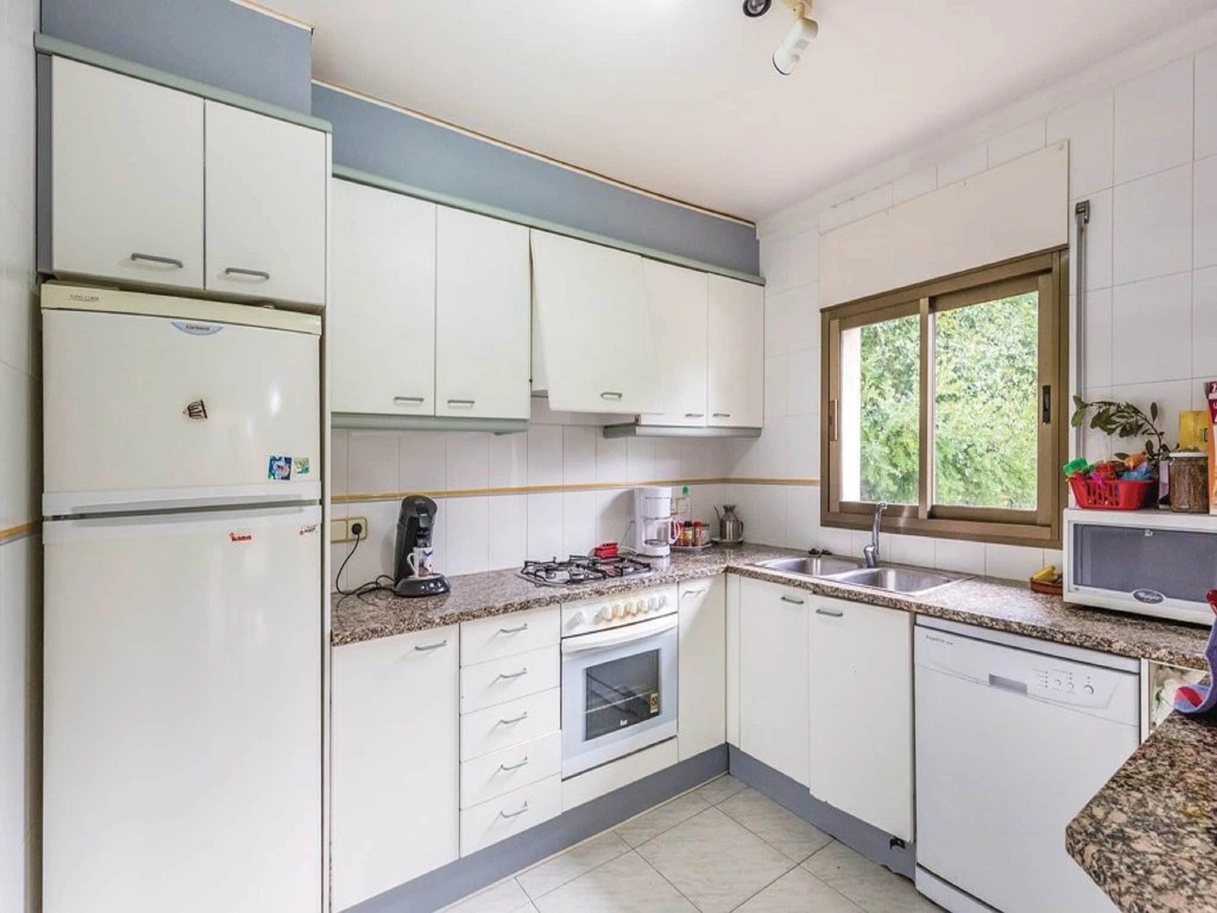 La cuisine, est équipée avec réfrigérateur, micro-ondes, lave-vaisselle, cafetière et bouilloire.