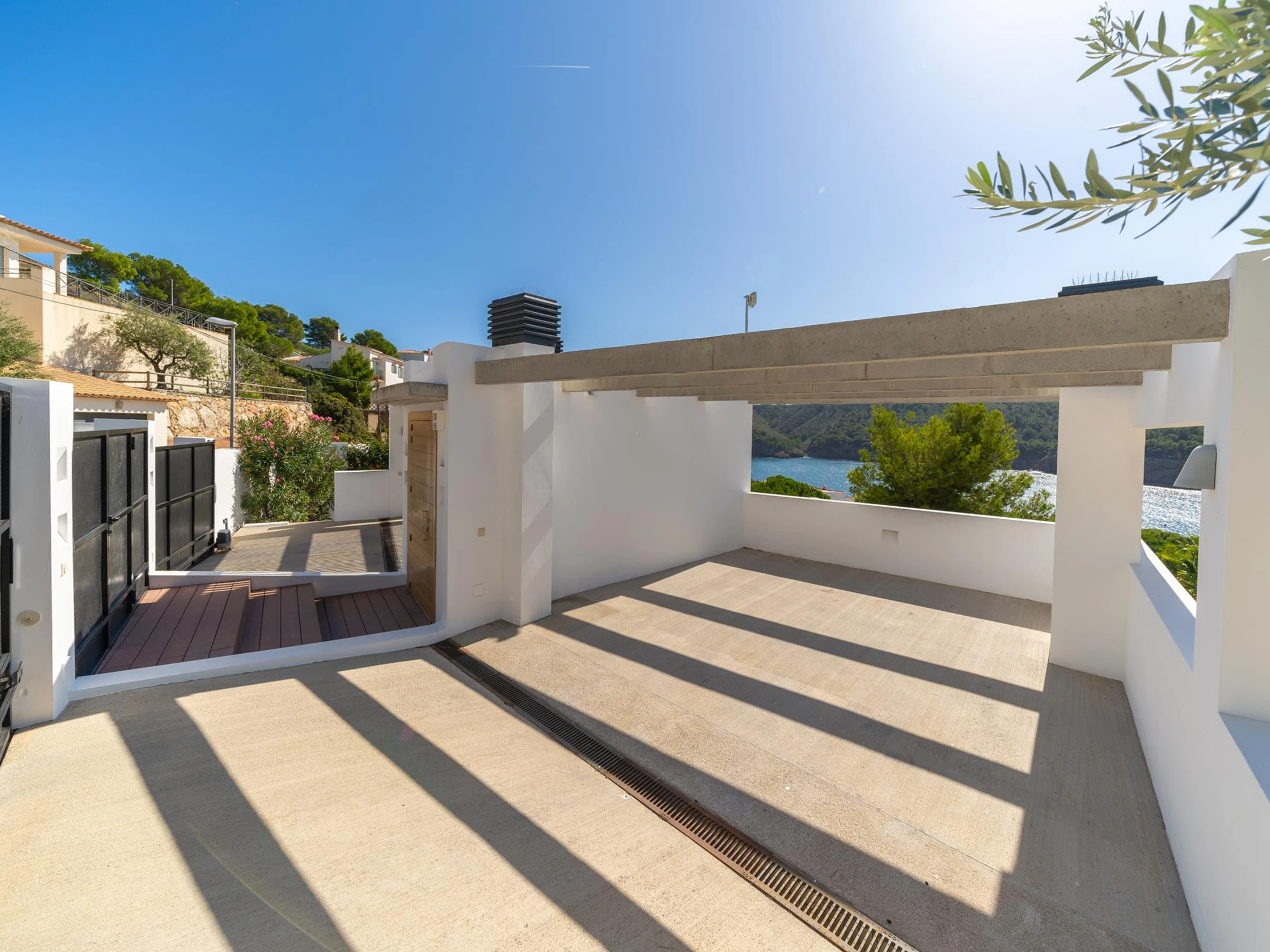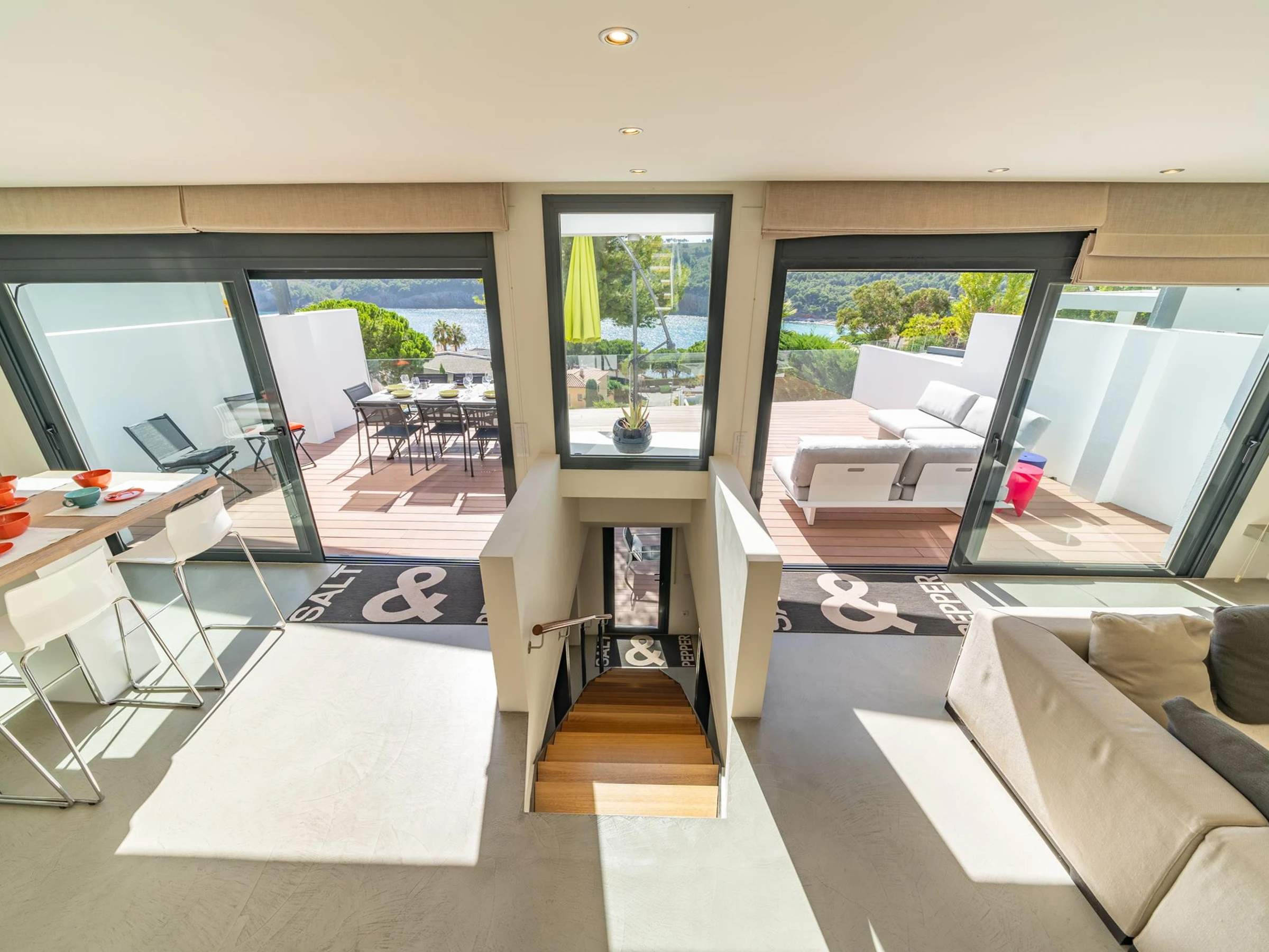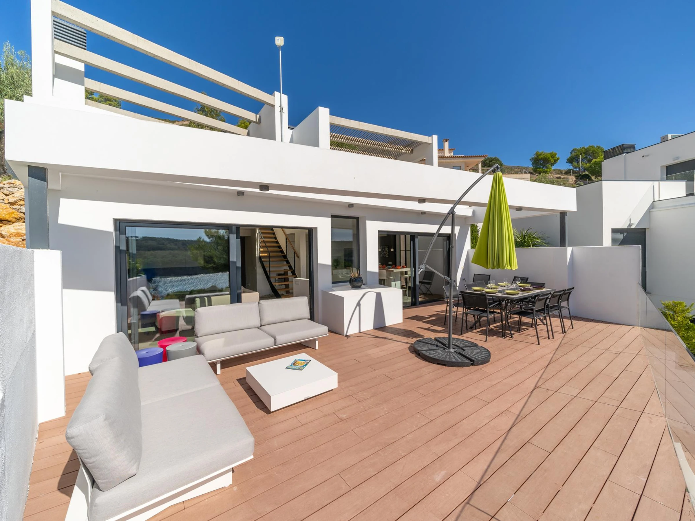 La maison est répartie sur 2 étages. Côté rue, il y a deux places de parking privées. En entrant dans la maison et en descendant quelques escaliers, vous trouverez un grand salon, la cuisine ouverte et une grande table à manger. Les deux espaces donnent sur une grande terrasse équipée d'un mobilier de jardin varié et d'une vue magnifique sur la mer, l'endroit parfait pour vos repas entre amis ou en famille.