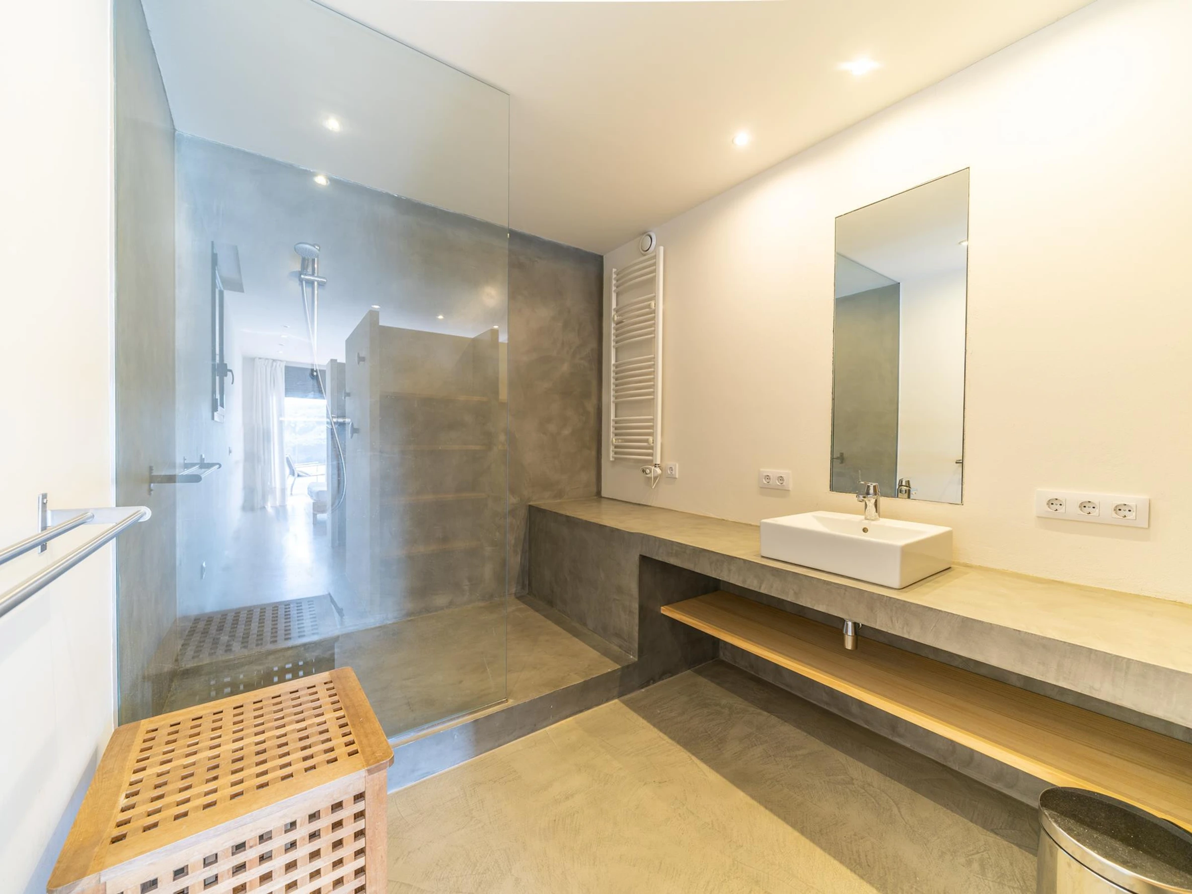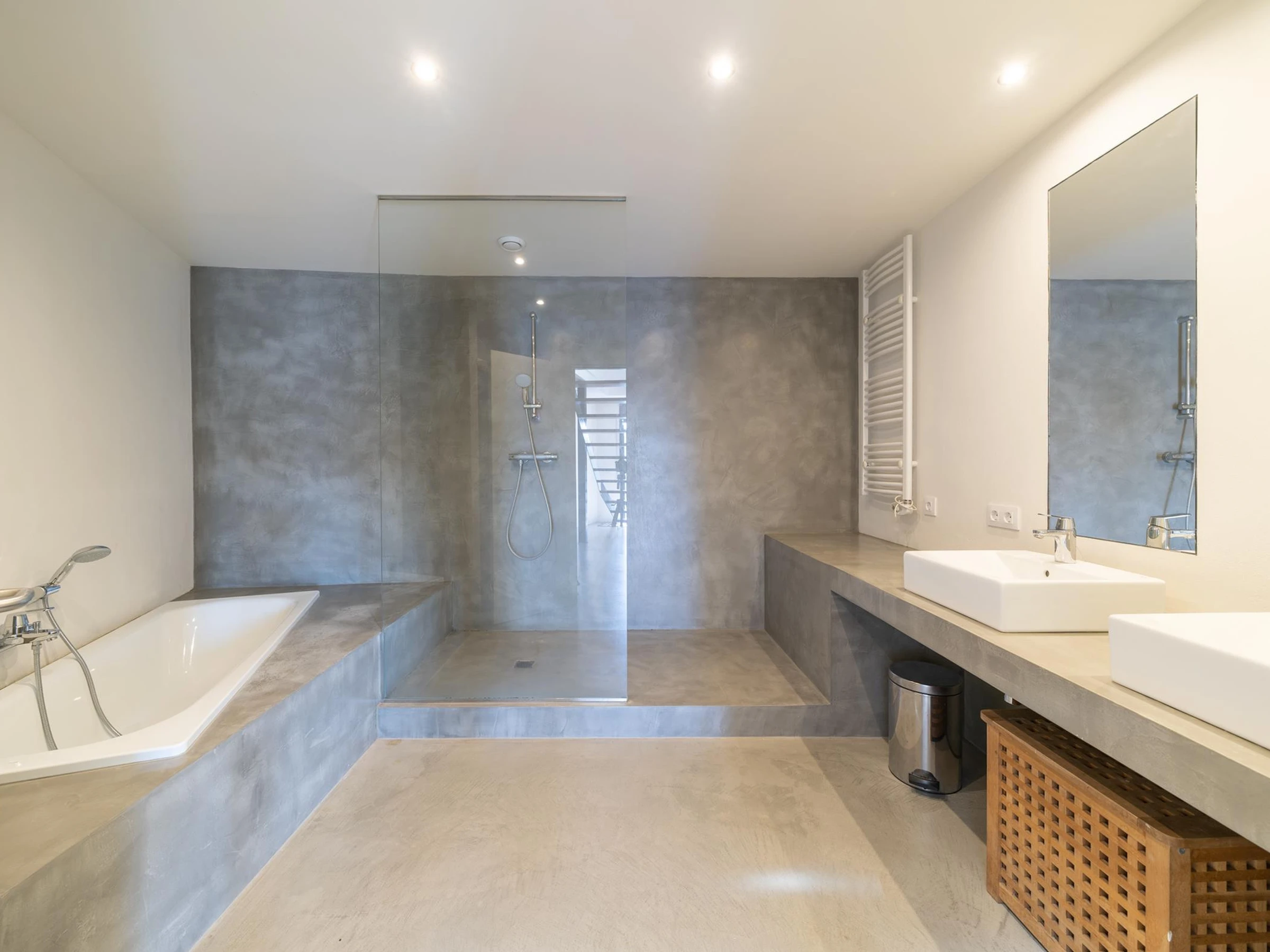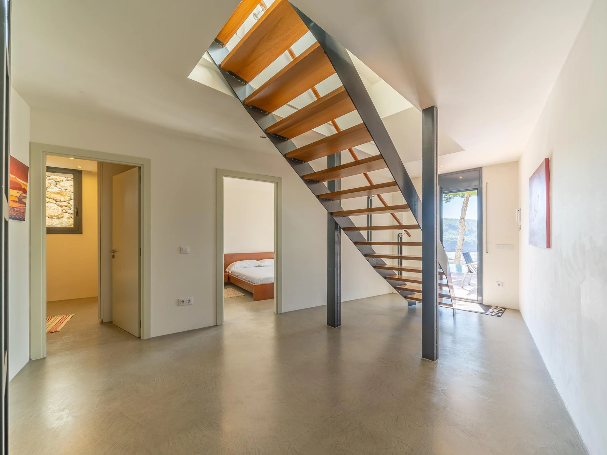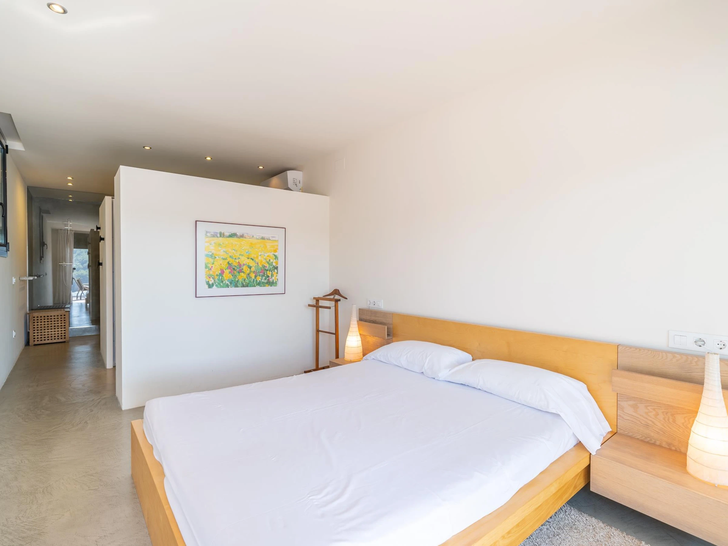 En descendant quelques escaliers, il y a une chambre avec un lit double et une salle de bain avec une baignoire. Une chambre avec un lit double et un lit simple. Une chambre avec un lit double. Une salle de bain avec baignoire et douche. Et une toilette. Les chambres donnent sur la terrasse, où vous pourrez profiter de la piscine à débordement et de la vue sur l'océan.