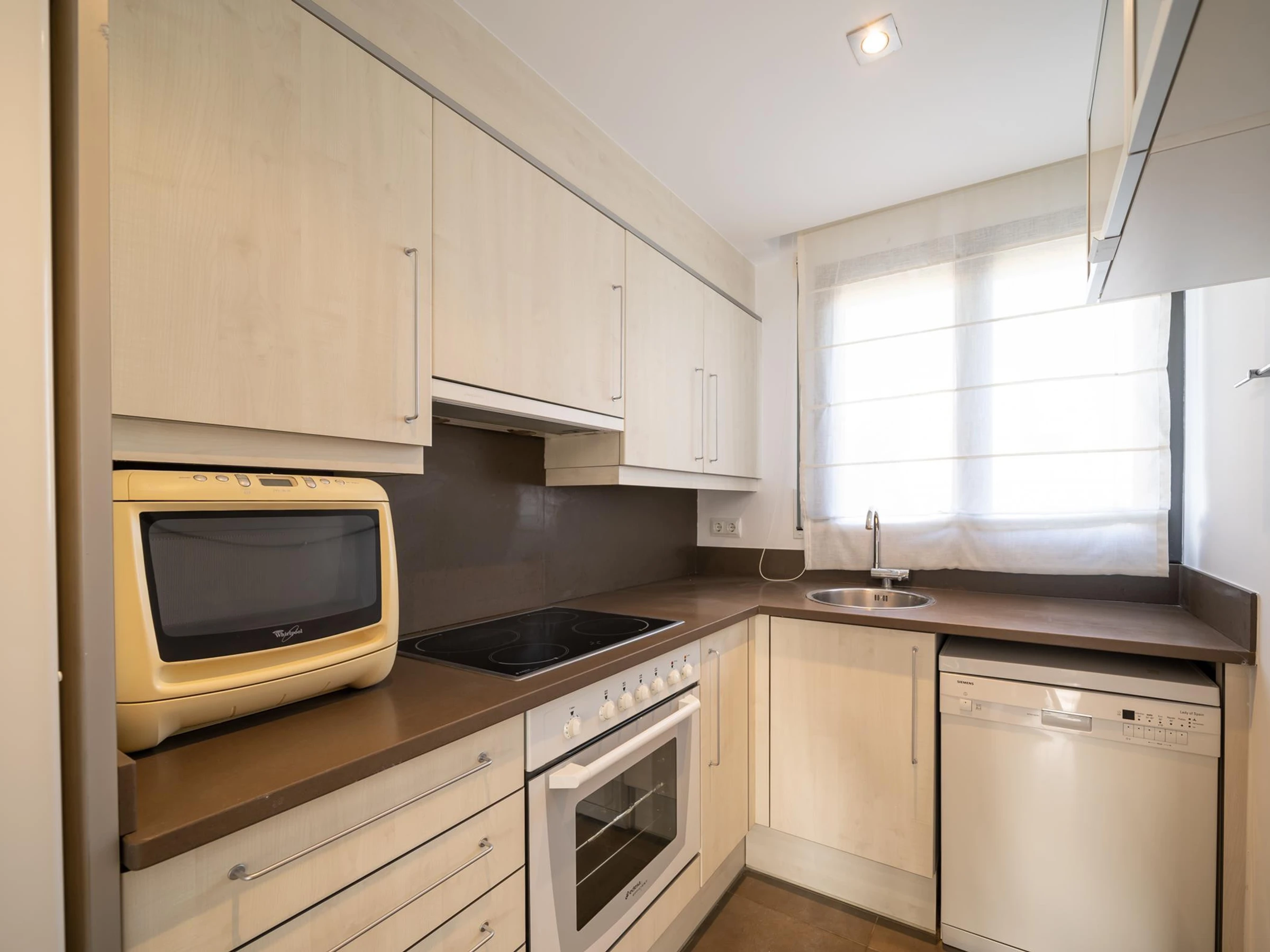 La cuisine est séparée, entièrement équipée avec appareils électrodomestiques et ustensiles, elle dispose d’une cafetière Dolce Gusto, un lave-vaisselle et un four.