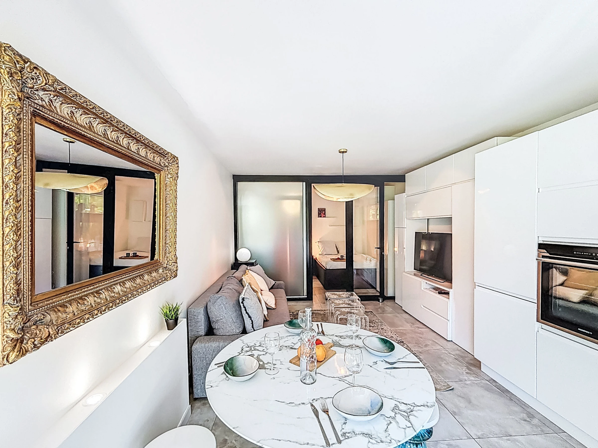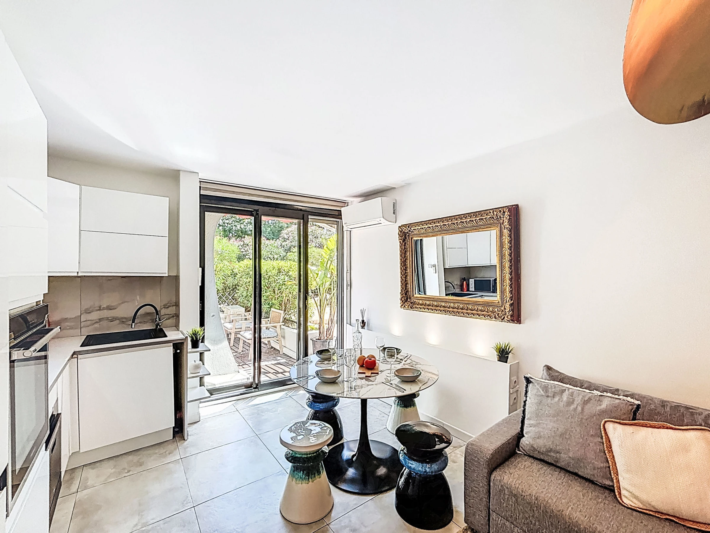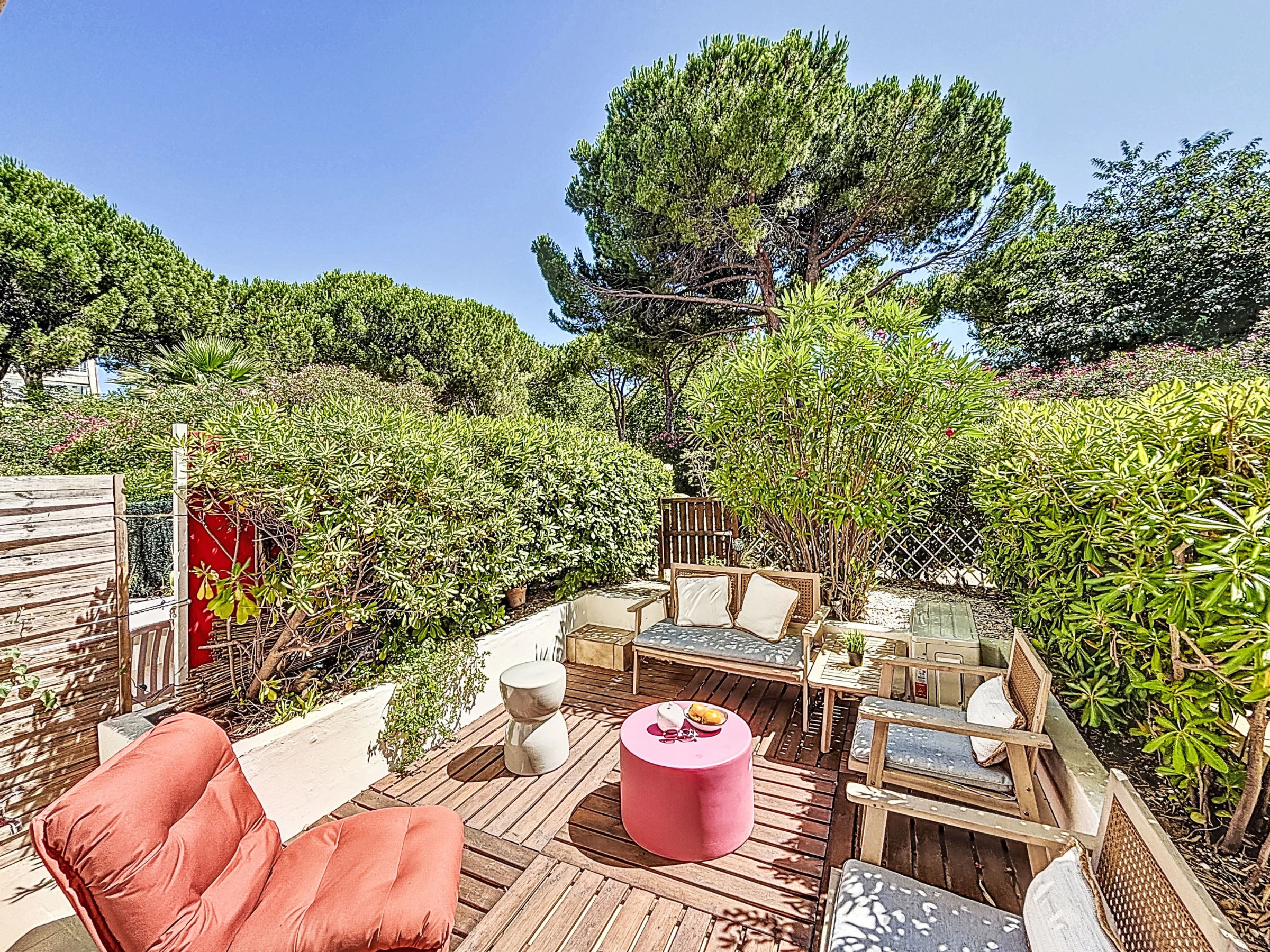 Apt 2 pièces 27 m2, au rez-de-chaussée, situation sud. Aménagement agréable: séjour/salle à manger avec 1 divan-lit double (140 cm, longueur 190 cm), TV (écran plat), air-conditionné. Sortie sur la terrasse. 1 petite chambre avec 1 grand-lit (140 cm, longueur 200 cm). Coin cuisine (four, lave-vaisselle, 3 plaques à induction, grille-pain, bouilloire électrique, micro-ondes, congélateur, cafetière électrique, Capsules pour machine à café (NESPRESSO) (NON INCLUSES)). Douche/WC. Chauffage électrique. Grande terrasse 25 m2, situation sud. Meubles de terrasse, chaises longues (1). Vue sur le jardin. A disposition: lave-linge, sèche-linge. Internet (Connexion WIFI, en sus). Veuillez noter: logement non-fumeur pas de parking. Détecteur de fumée. Annonce d'un particulier (art 155, IV du CGI).