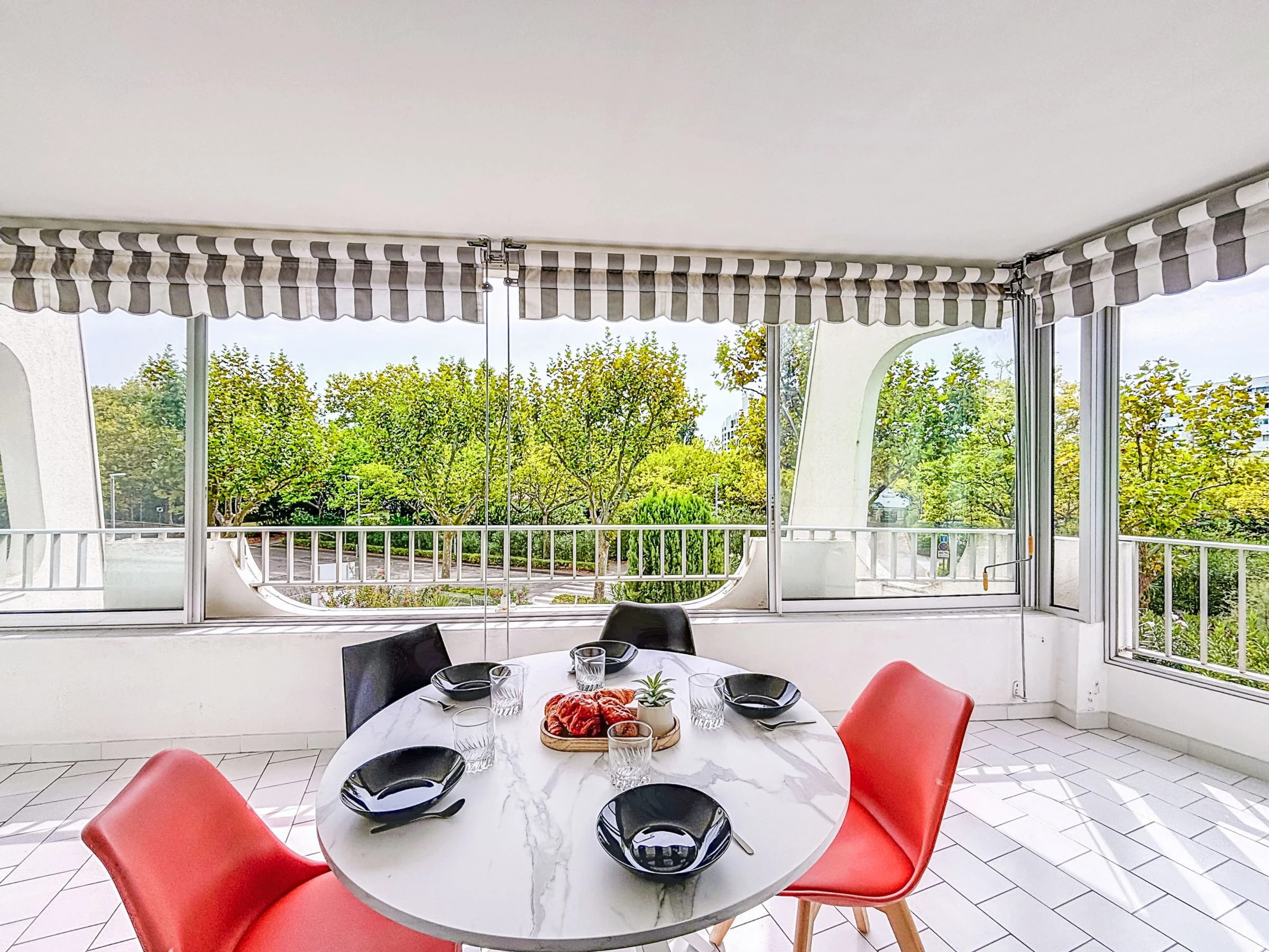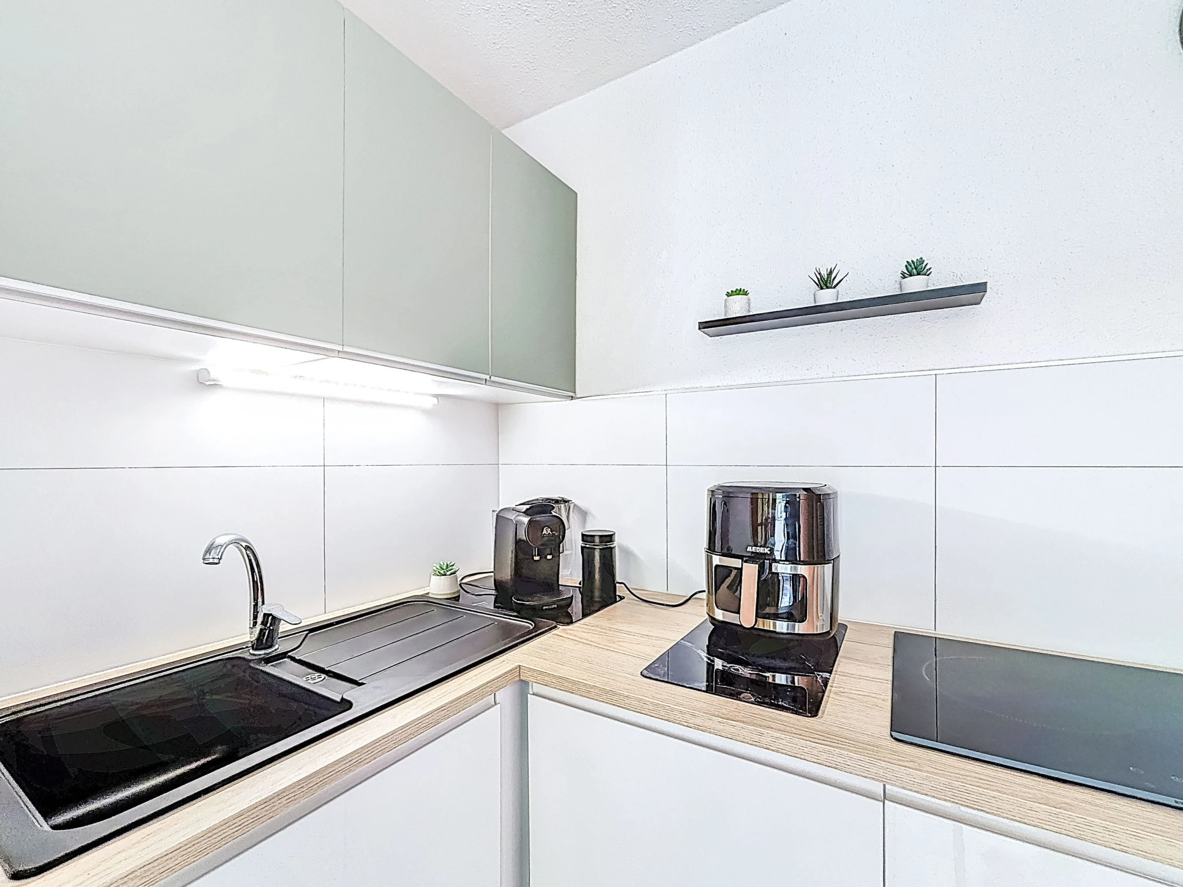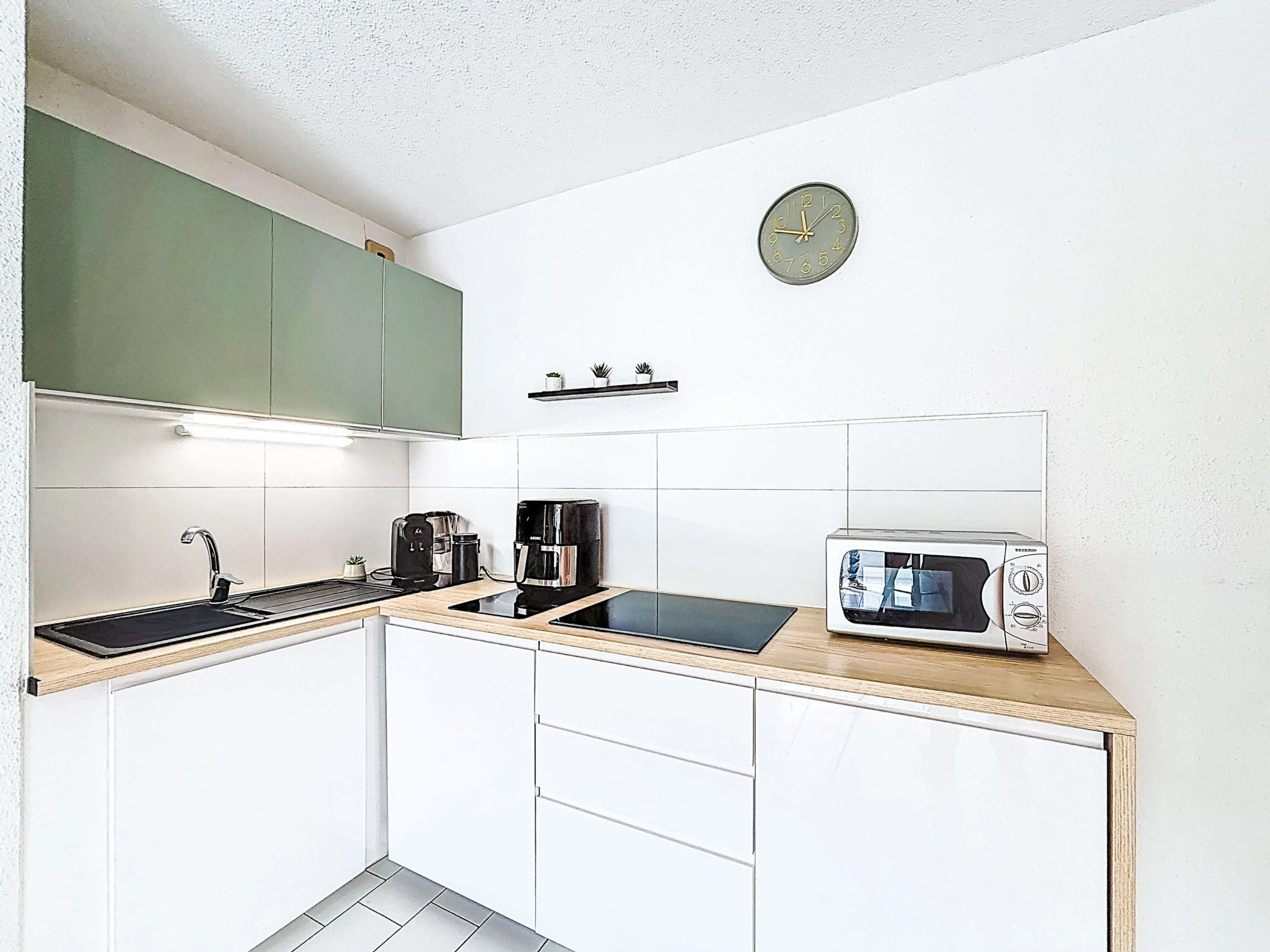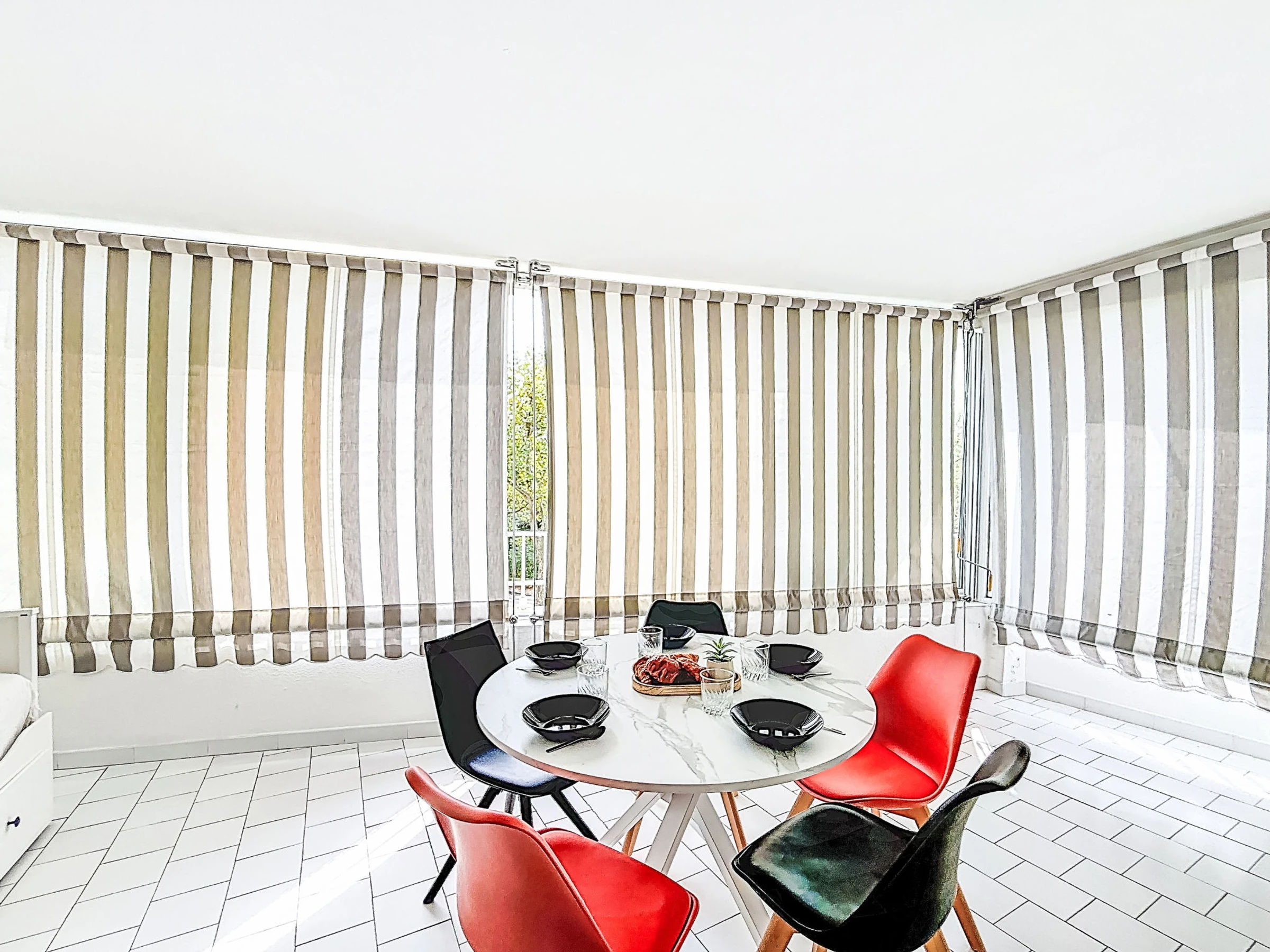 Studio 40 m2. Logement idéal pour 3 adultes + 2 enfants. Aménagement confortable: séjour/salle à manger avec 1 lit double armoire (140 cm, longueur 190 cm), TV (écran plat), radiateur électrique. Sortie sur la loggia, orientée sud. Cabine avec 1 divan-lit double (160 cm, longueur 200 cm), air-conditionné. Cabine avec 1 x 2 lits superposés (90 cm, longueur 190 cm). Sortie sur la loggia. Coin cuisine (lave-vaisselle, 3 plaques à induction, grille-pain, bouilloire électrique, micro-ondes, congélateur, cafetière électrique, Capsules pour machine à café (PHILLIPS) (NON INCLUSES)). Salle de bains, baignoire sabot, WC séparé. Loggia. Vue sur le jardin. A disposition: Internet (Connexion WIFI, en sus). Place de parking No 132. Veuillez noter: logement non-fumeur. Détecteur de fumée. Annonce d'un particulier (art 155, IV du CGI). [hidden]