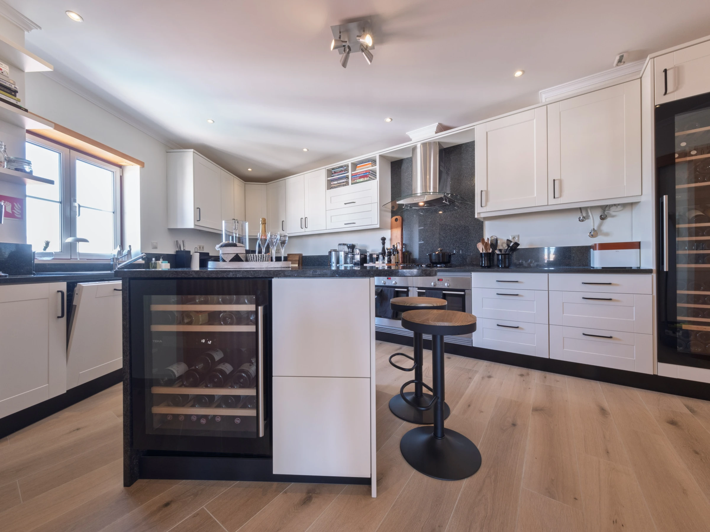 La cuisine, est équipée avec réfrigérateur, micro-ondes, four, congélateur, lave-vaisselle, vaisselle/couverts, ustensiles/cuisine, cafetière, grille pain, bouilloire, equipement de cuisine, assiettes et bols.
