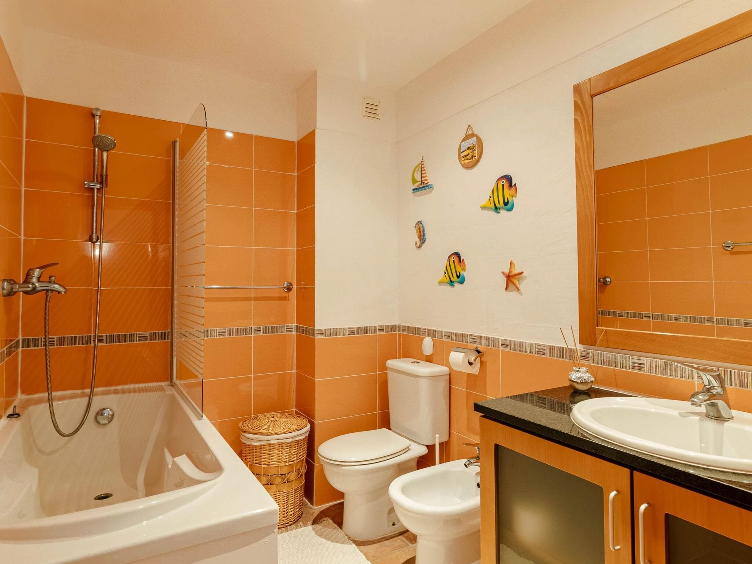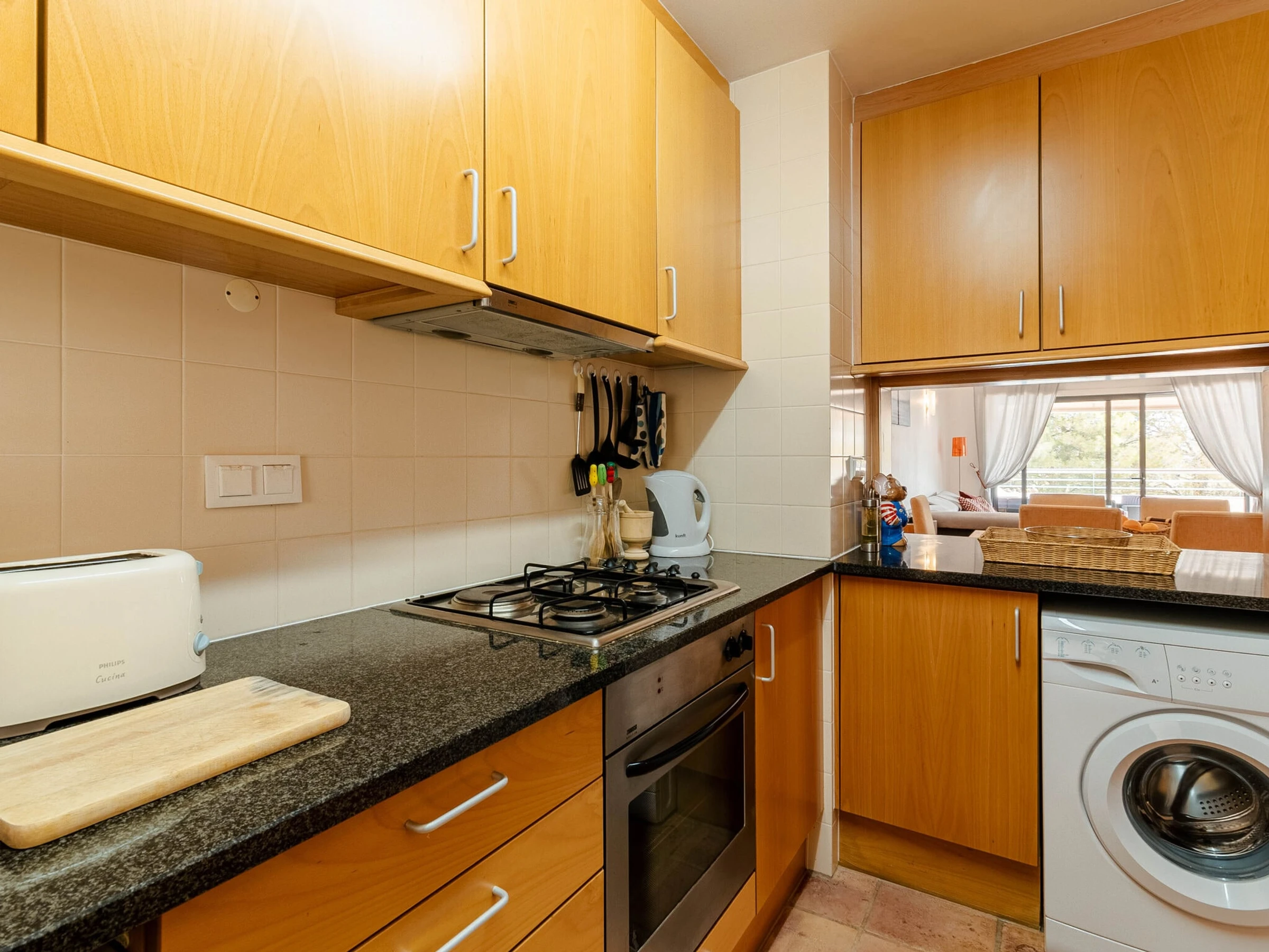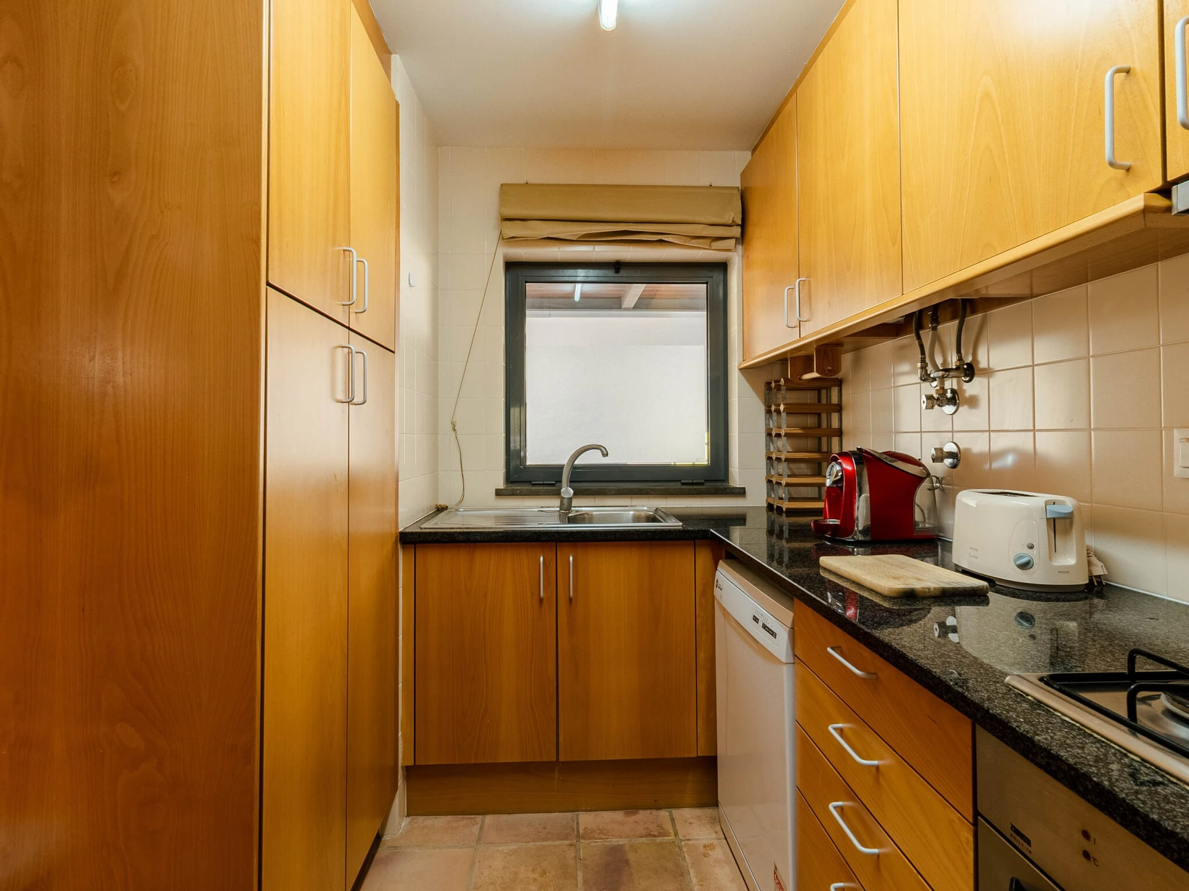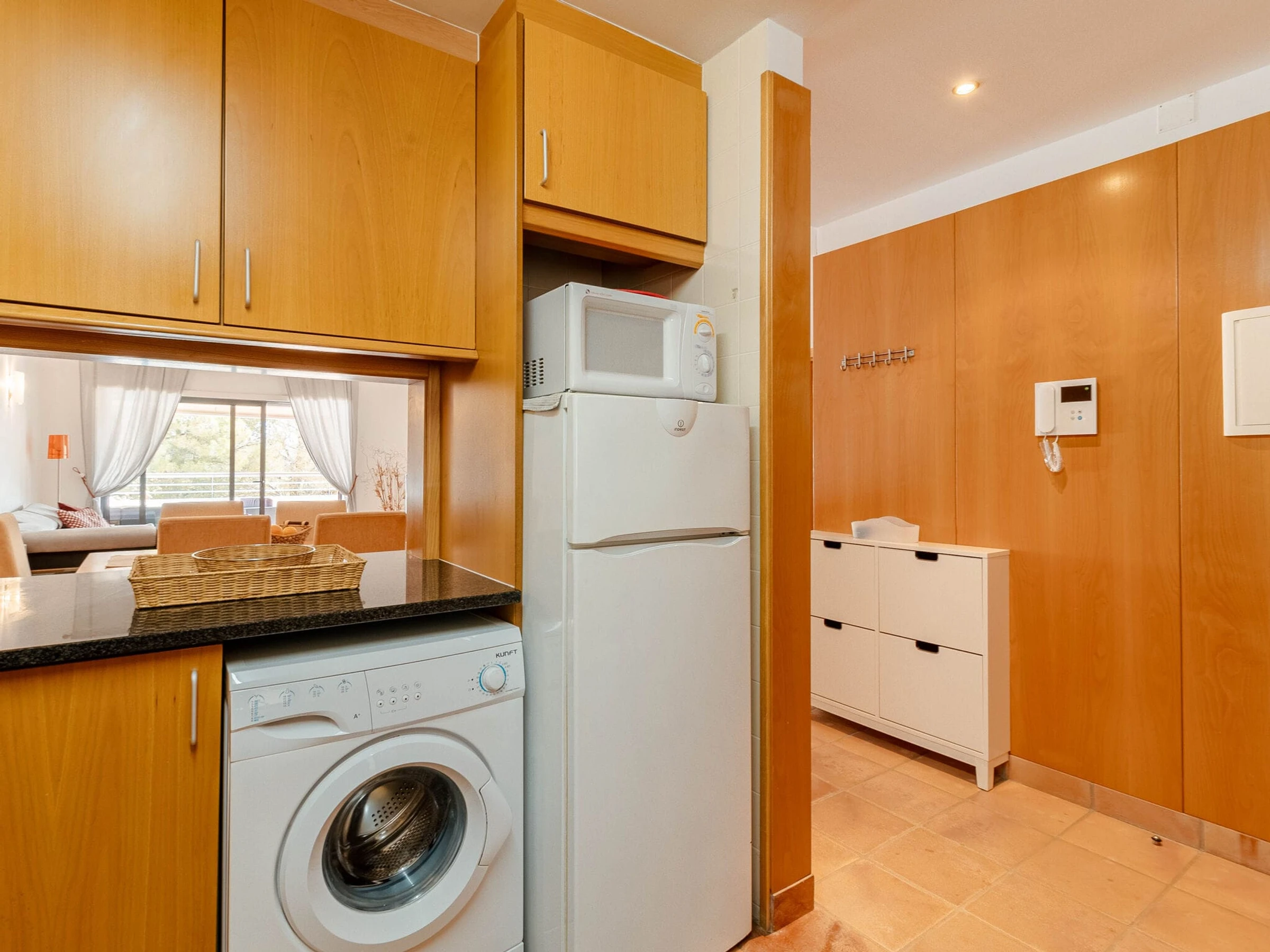 La cuisine, est équipée avec réfrigérateur, micro-ondes, four, lave-vaisselle, cafetière, grille pain et bouilloire.