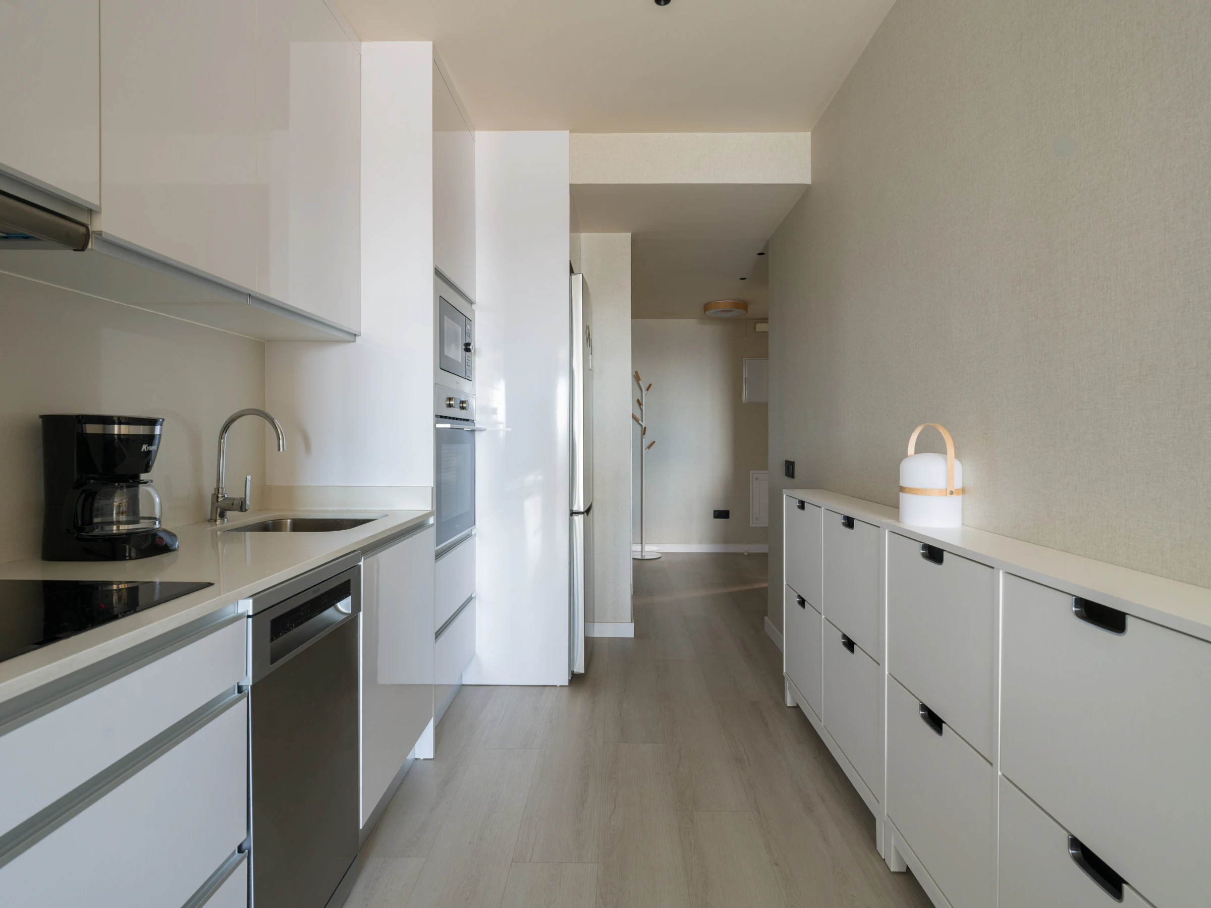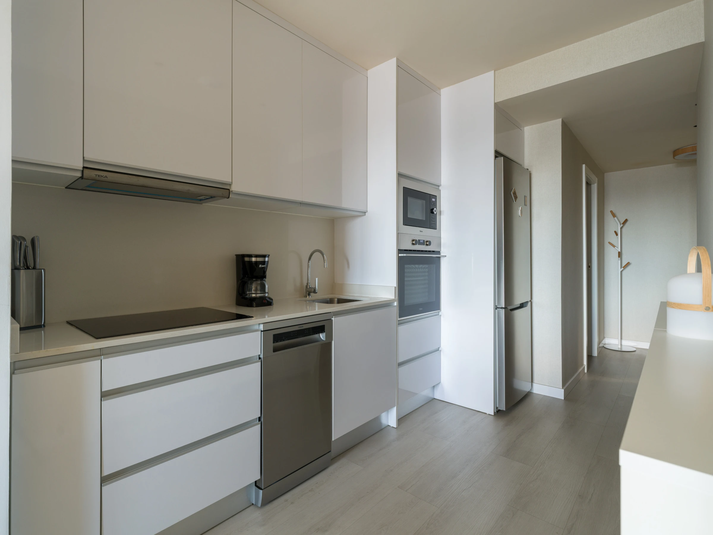 La cuisine est entièrement équipée d'électroménagers de dernière génération, comprenant un réfrigérateur, un congélateur, un lave-linge, un sèche-linge, un four, un micro-ondes, une cafetière, un grille-pain et une bouilloire. Vous disposerez de tous les ustensiles de cuisine nécessaires pour préparer vos repas.