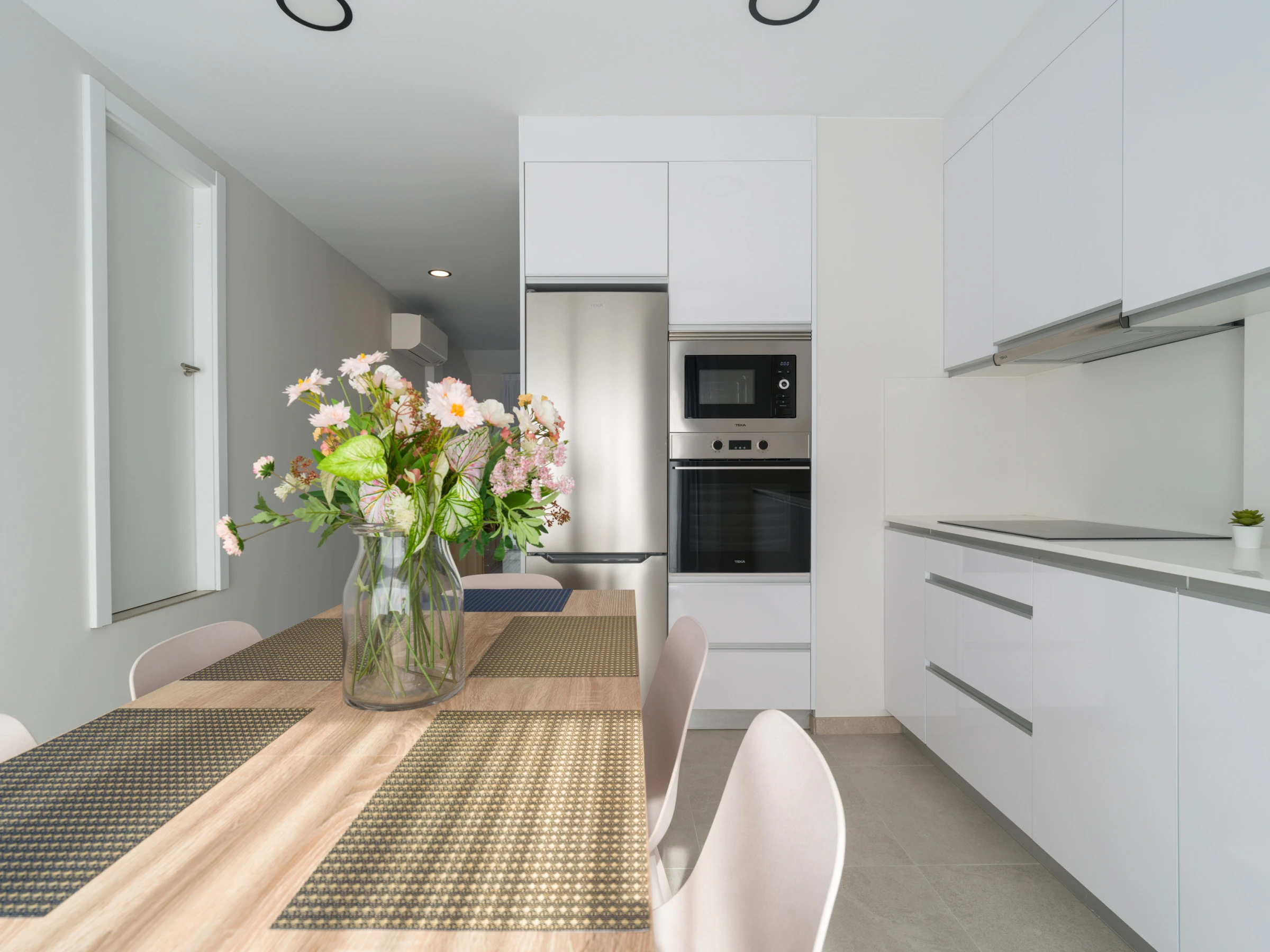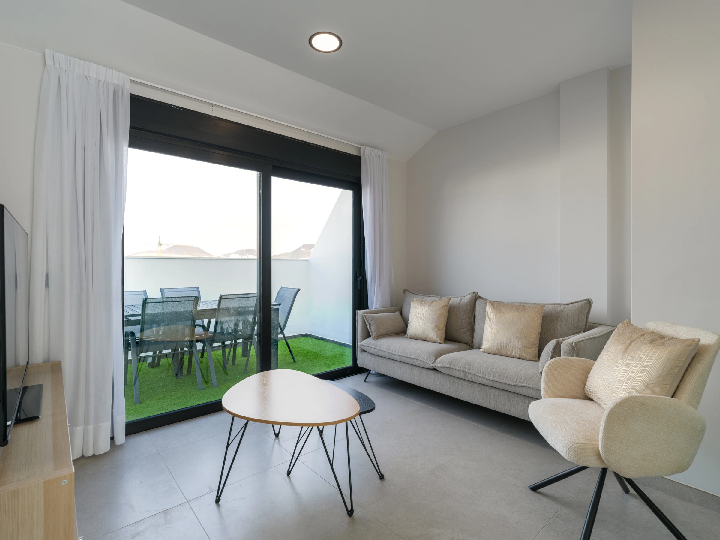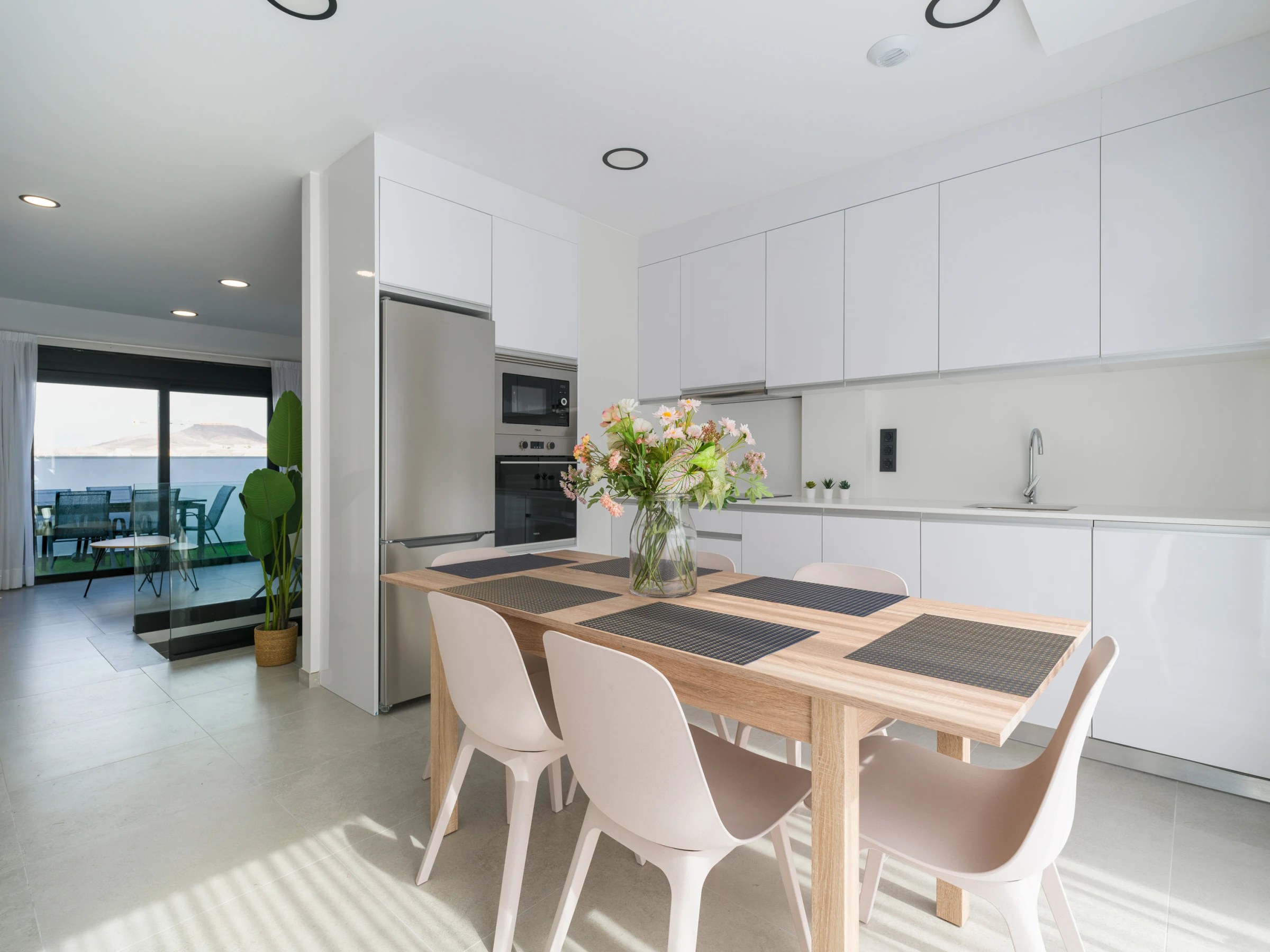 Le salon est accueillant et dispose d'une zone de salle à manger, d'un canapé pour se détendre et de la climatisation dans le salon, ainsi que d'une pompe à chaleur, garantissant une température parfaite toute l'année. Il est équipé d'une télévision intelligente avec des chaînes par satellite, du WiFi à haute vitesse et est conçu pour être totalement convivial avec les appareils électroniques.